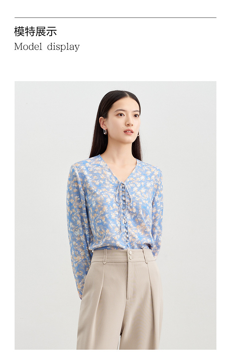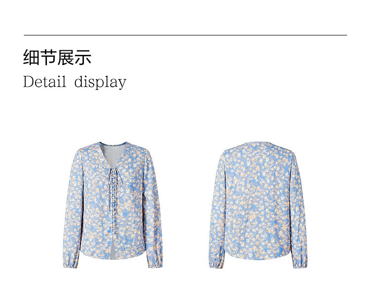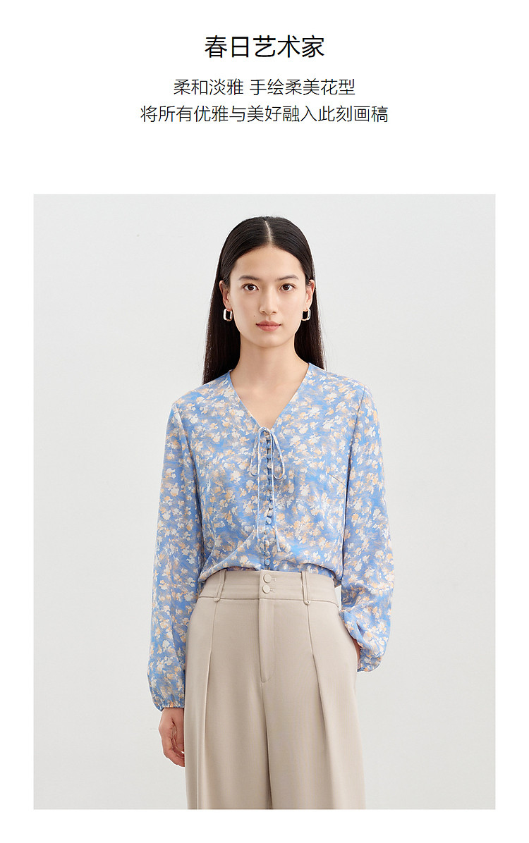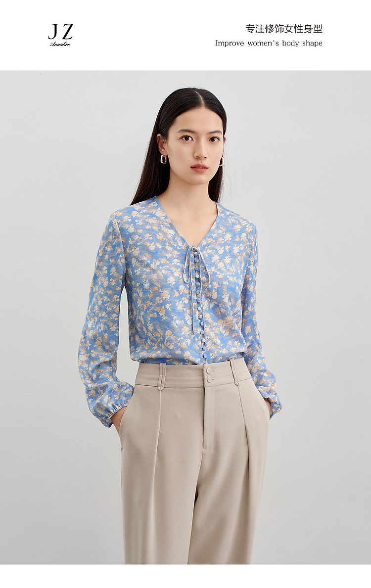 商品名称:玖姿旗下安娜蔻系列优雅花卉印花V领系带长袖衬衫女春季 514508