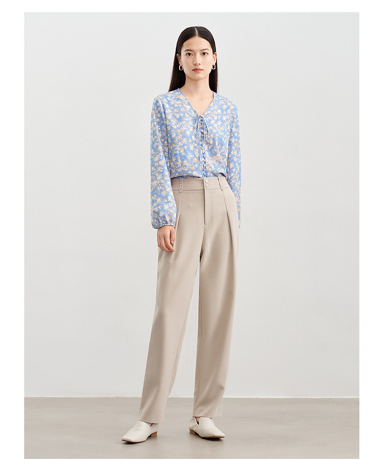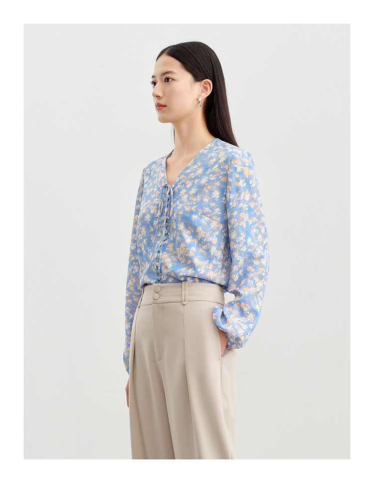 玖姿旗下安娜蔻系列优雅花卉印花V领系带长袖衬衫女春季 514508
