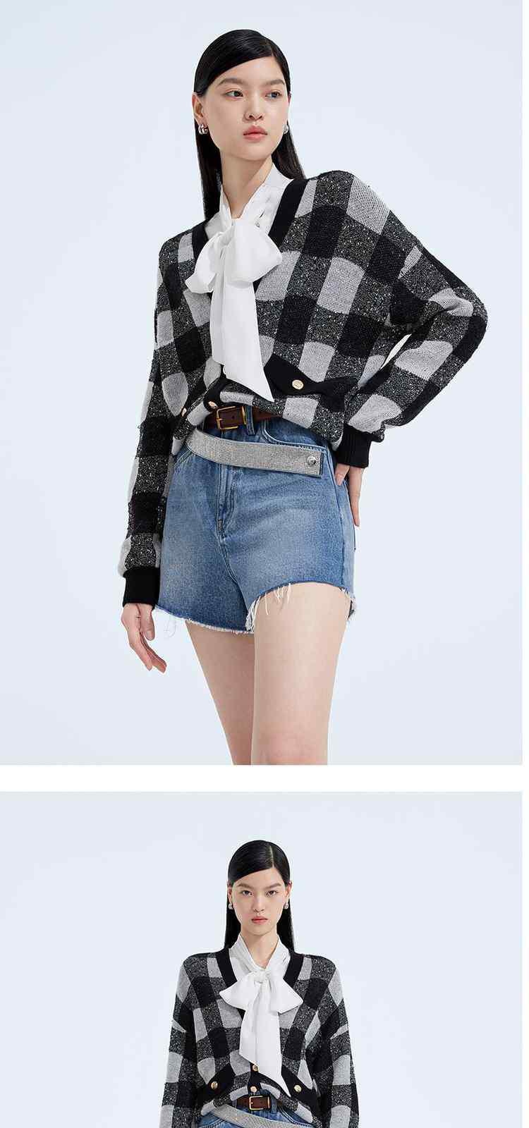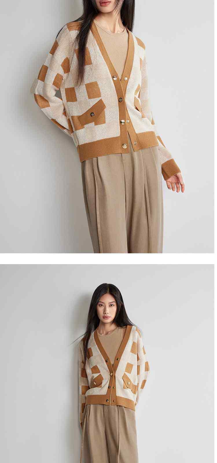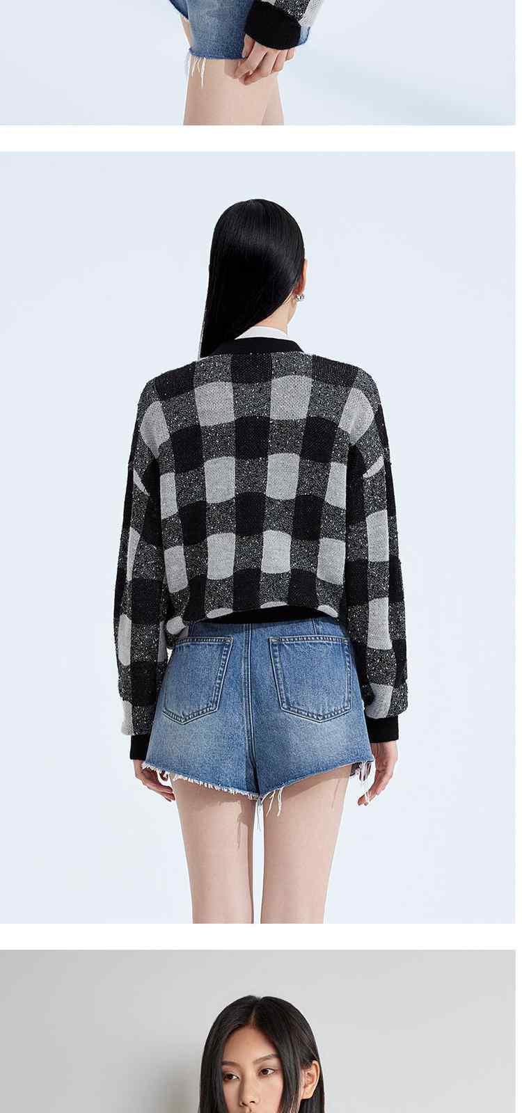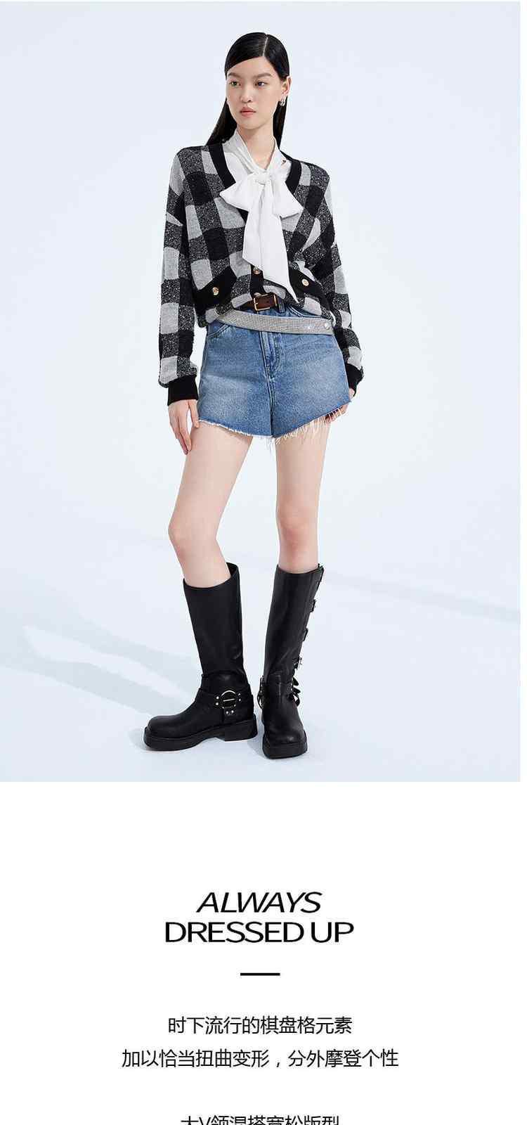 黑标系列春装 V领棋盘格英伦风针织外套女 319439