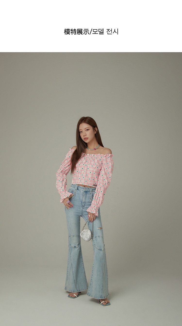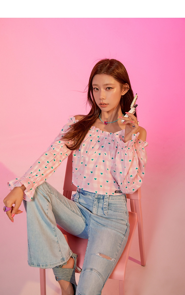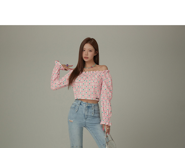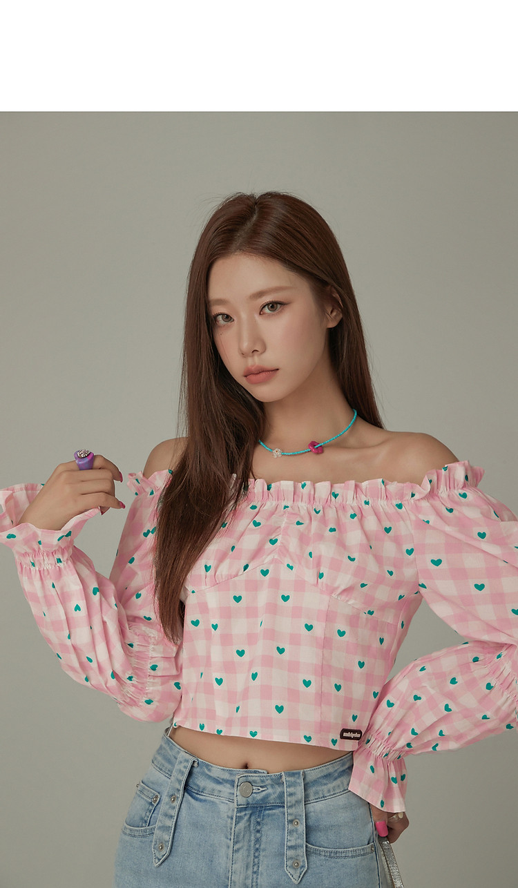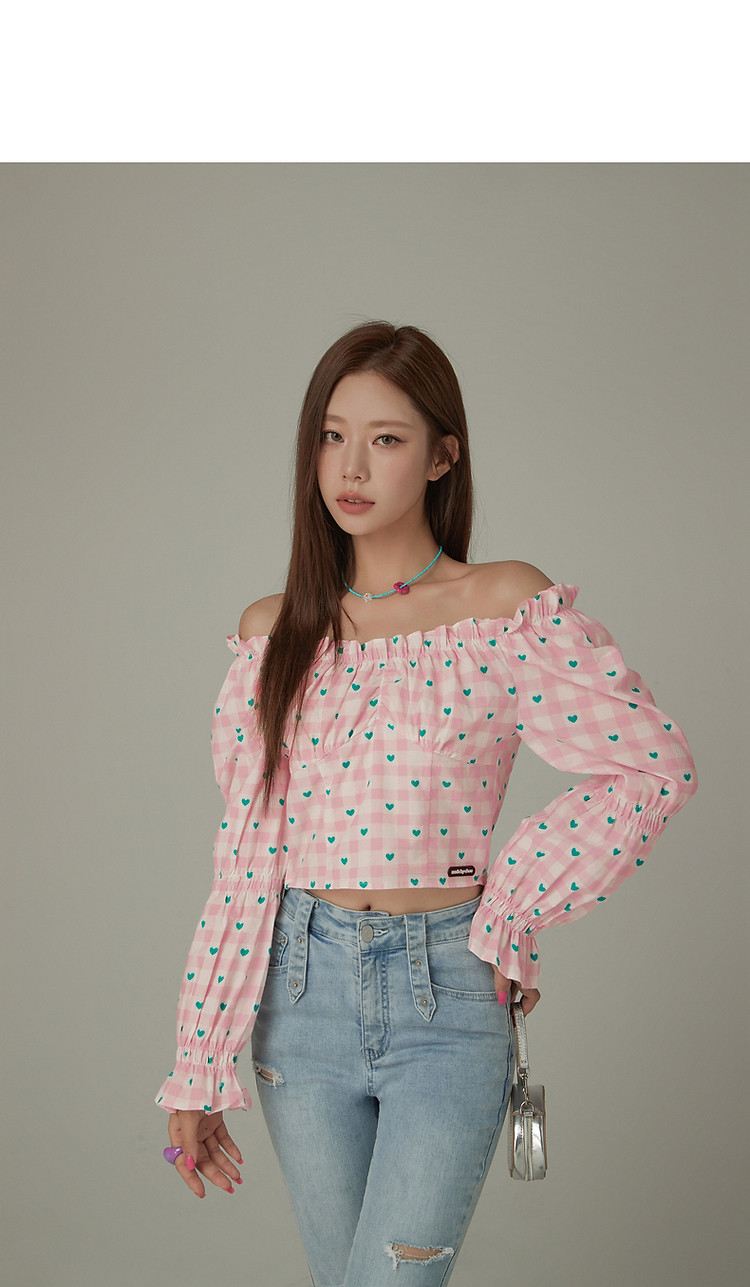 爱心格子衬衫女春秋小个子辣妹一字肩喇叭袖上衣 541267