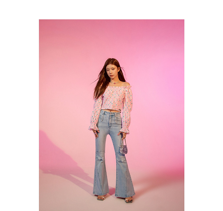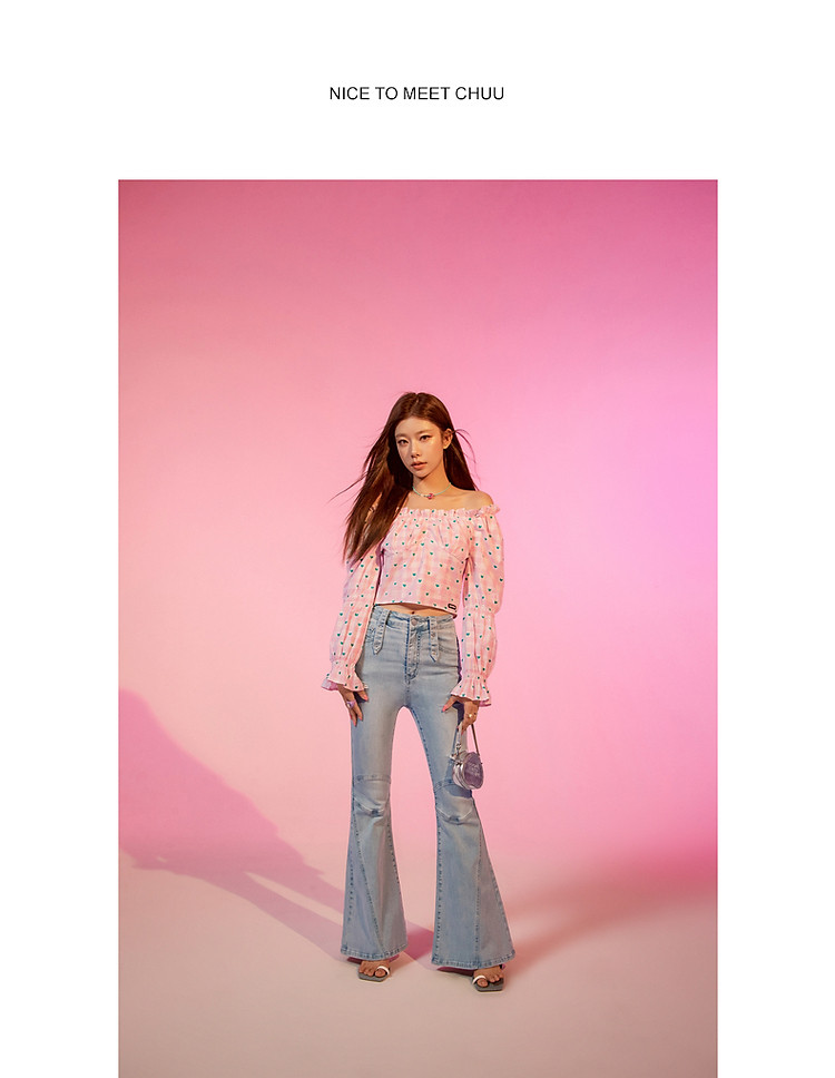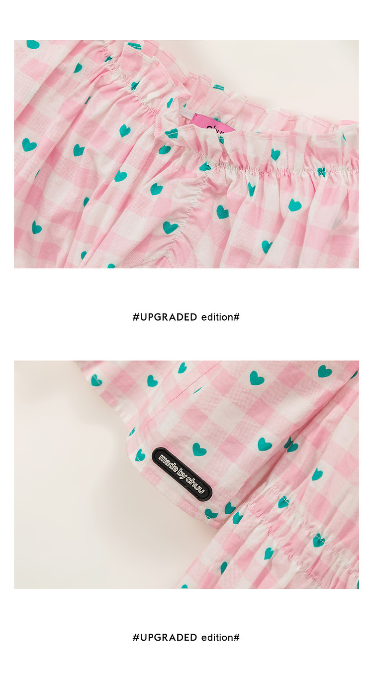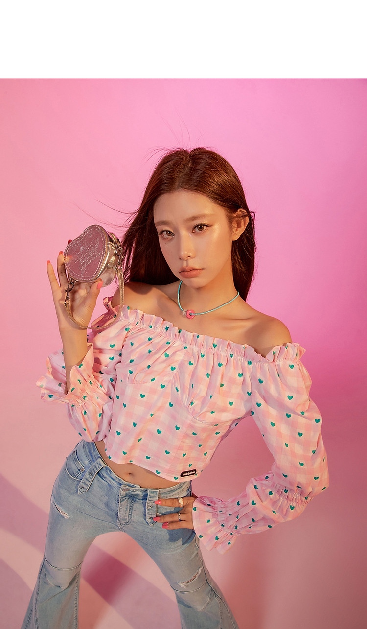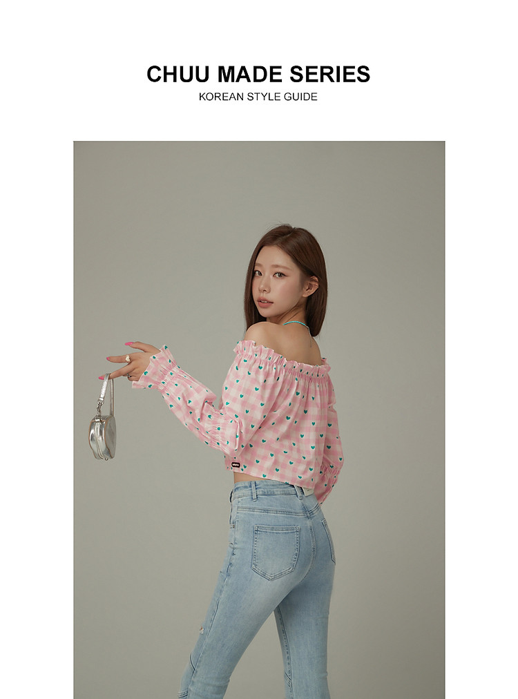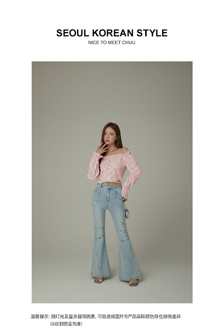 爱心格子衬衫女春秋小个子辣妹一字肩喇叭袖上衣 541267