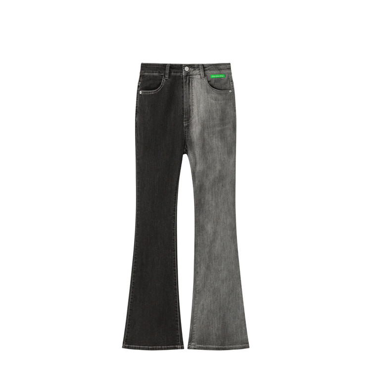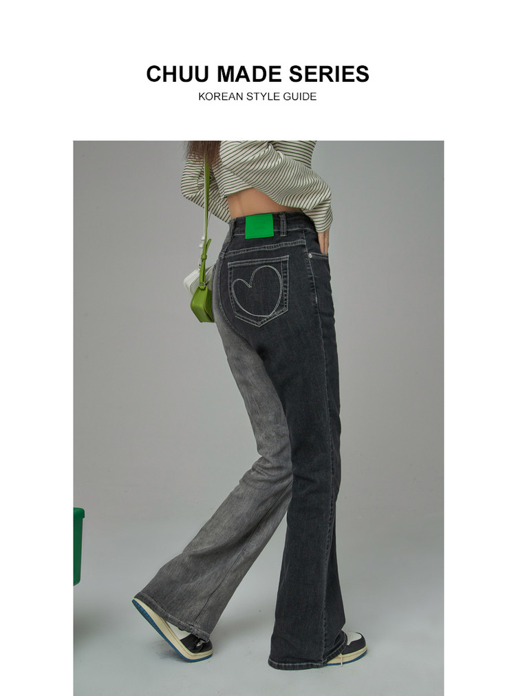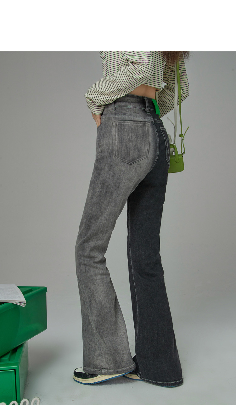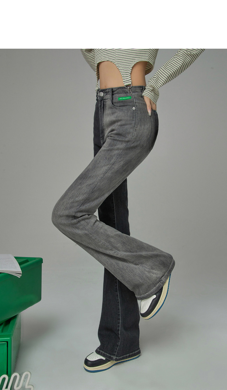 烟灰色撞色高腰微喇牛仔裤女春秋修身长裤子 608595