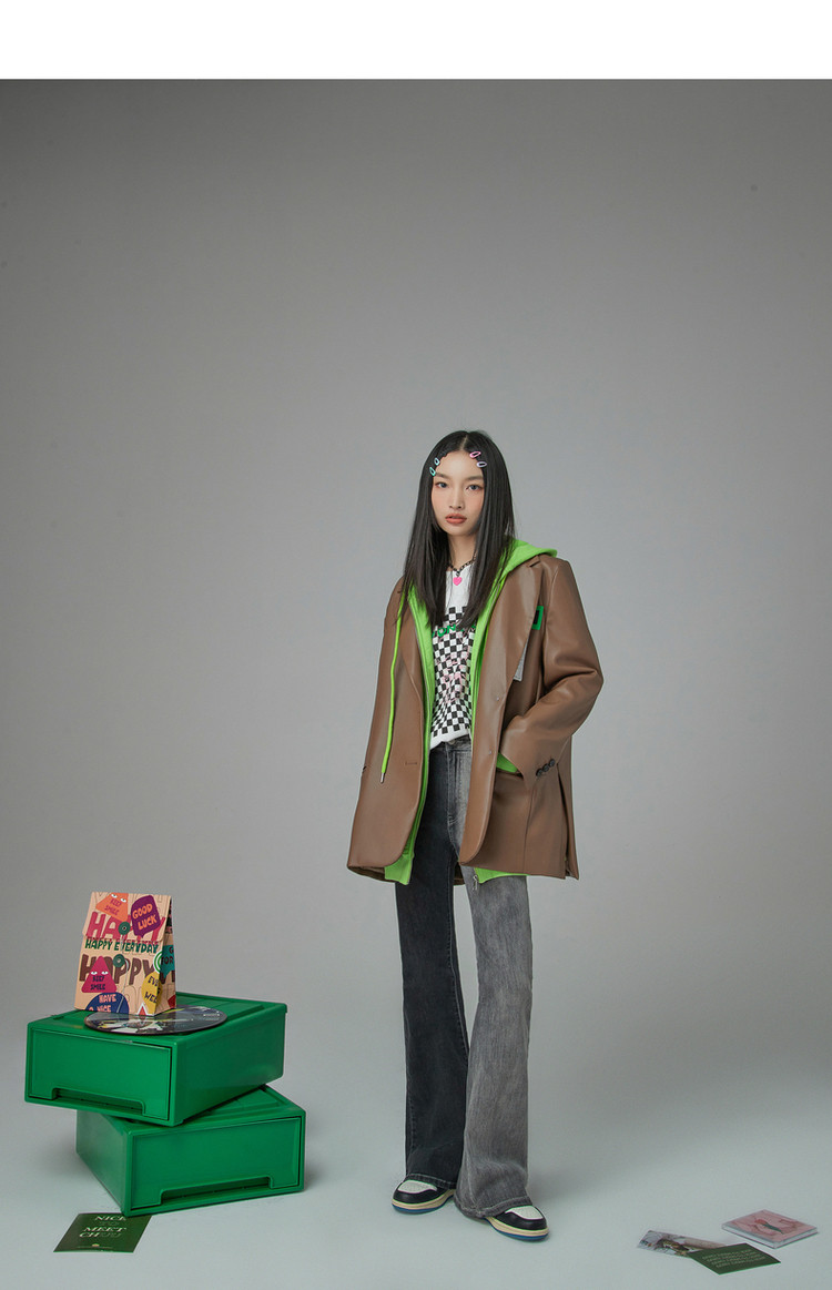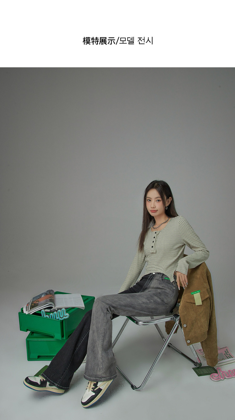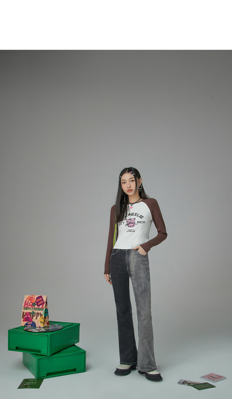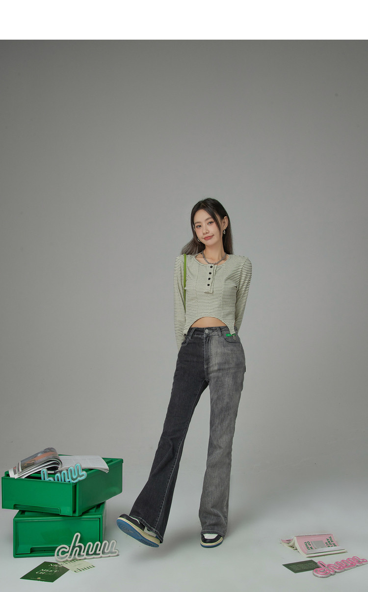 烟灰色撞色高腰微喇牛仔裤女春秋修身长裤子 608595