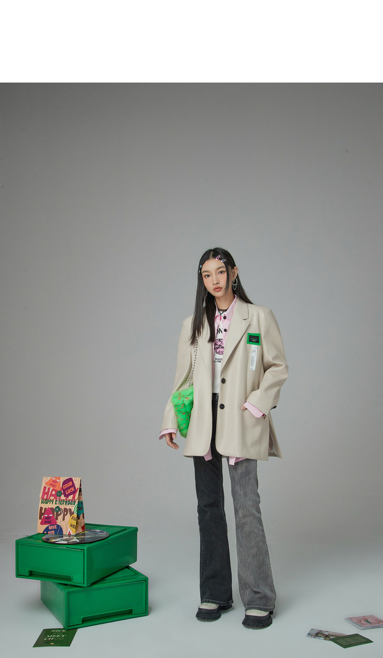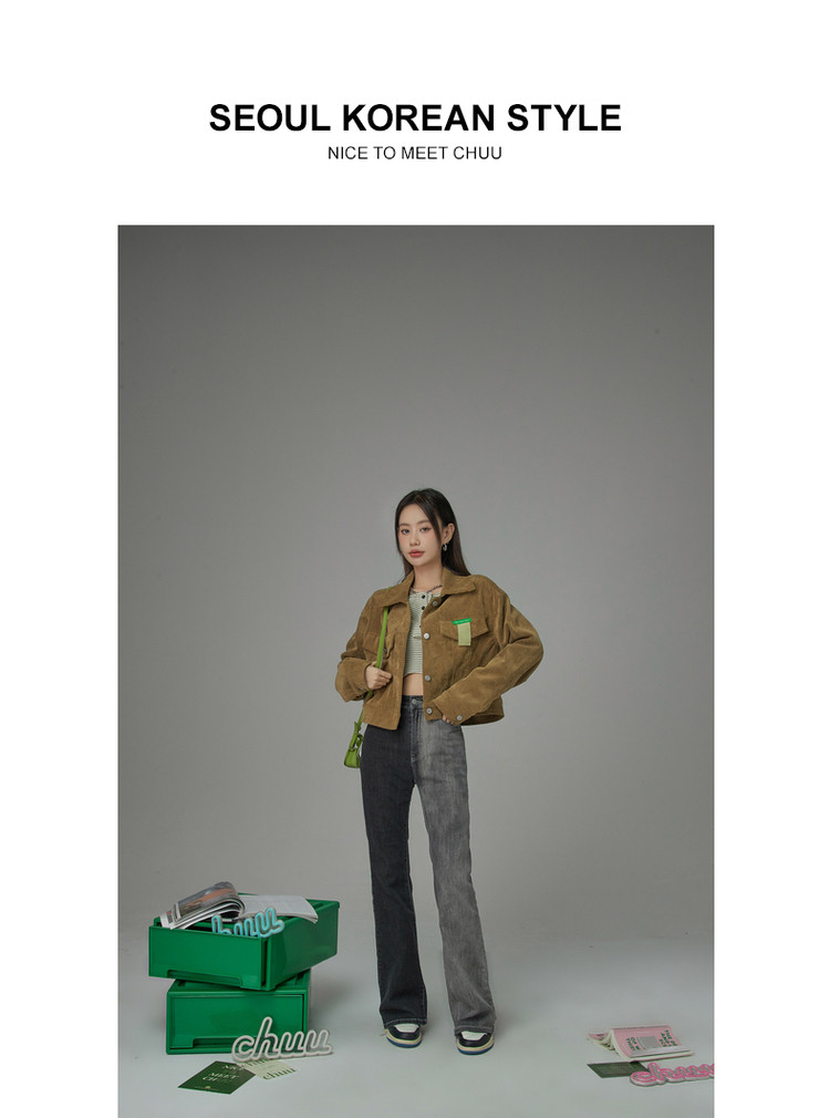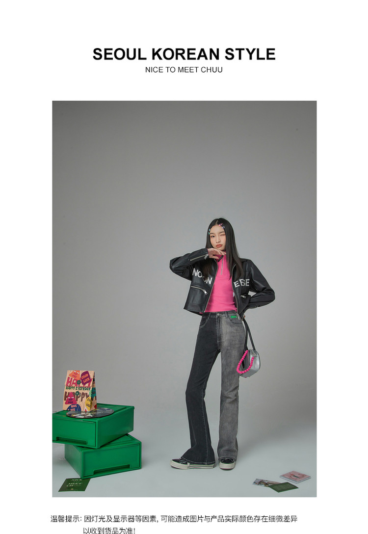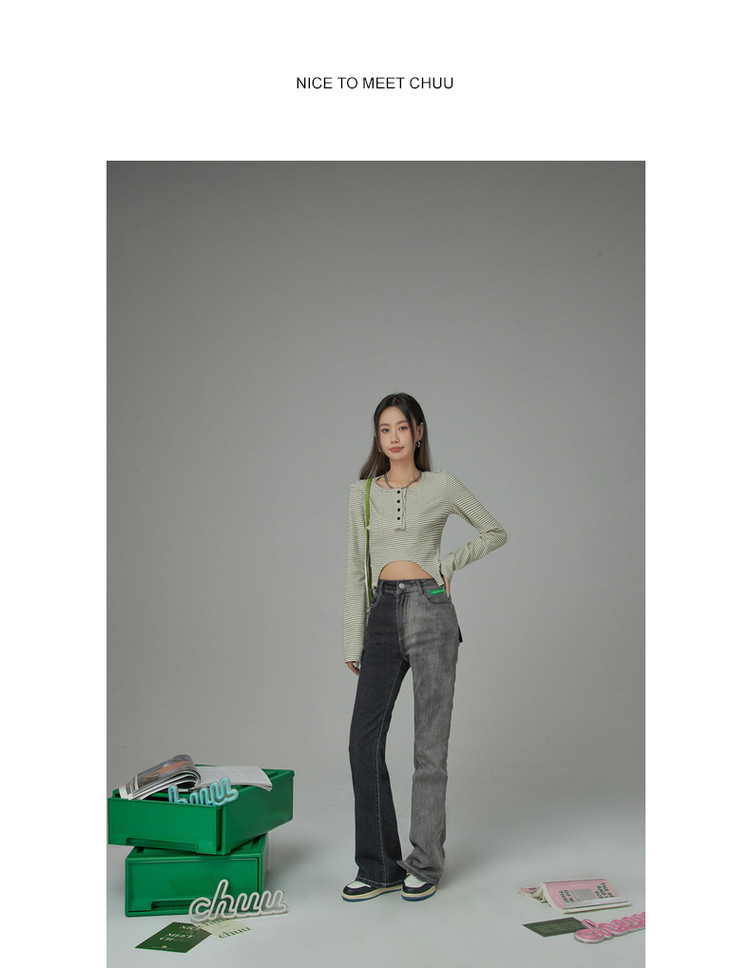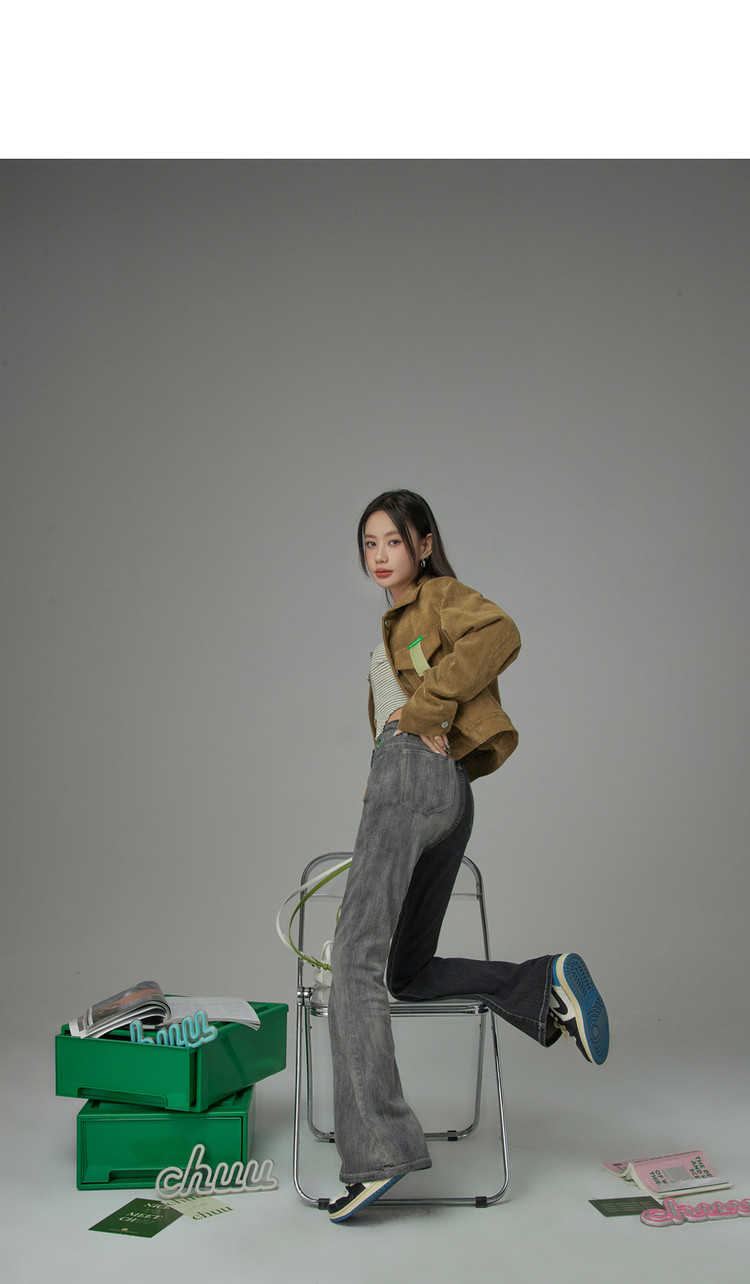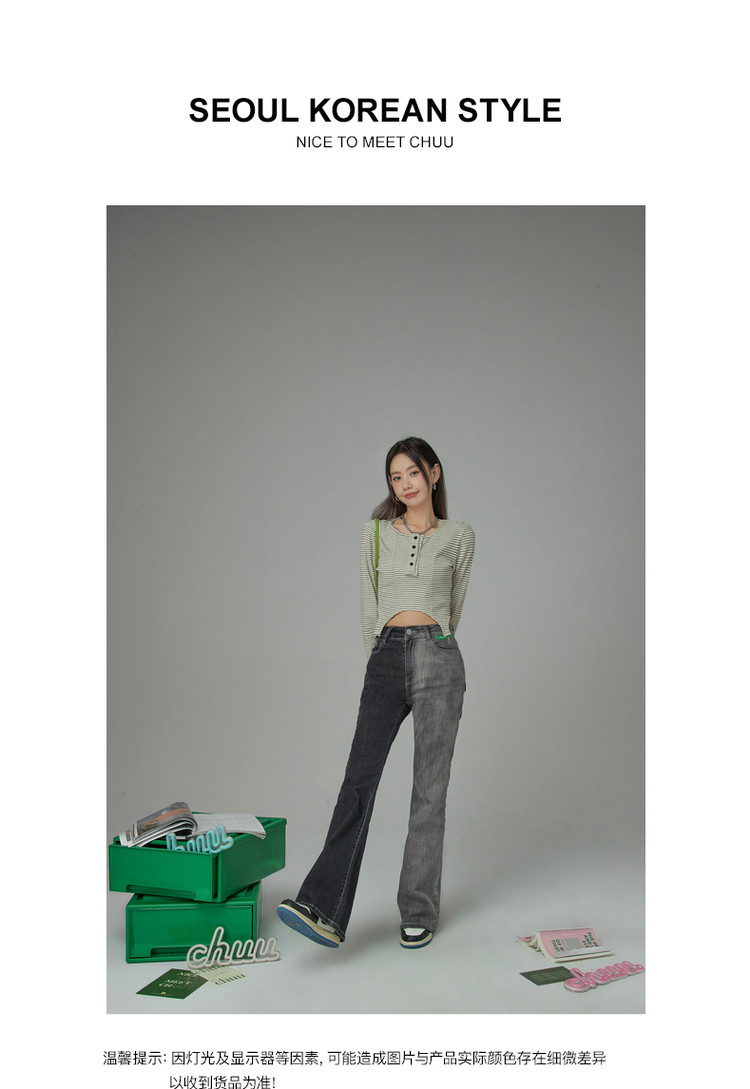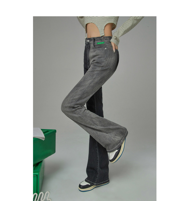 商品名称:烟灰色撞色高腰微喇牛仔裤女春秋修身长裤子 608595