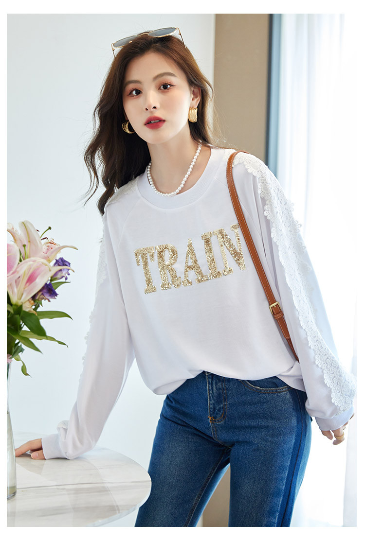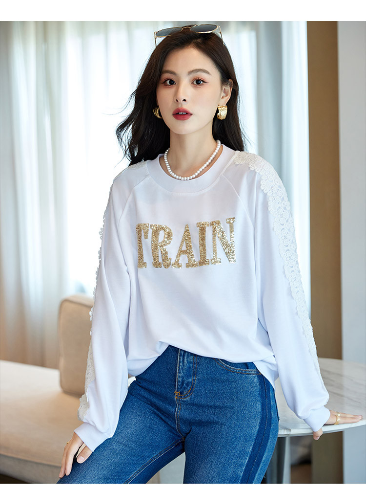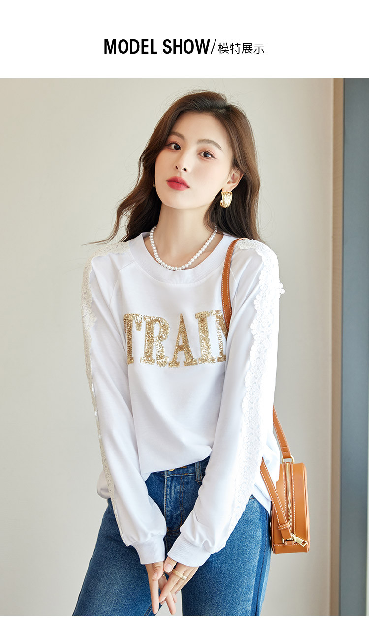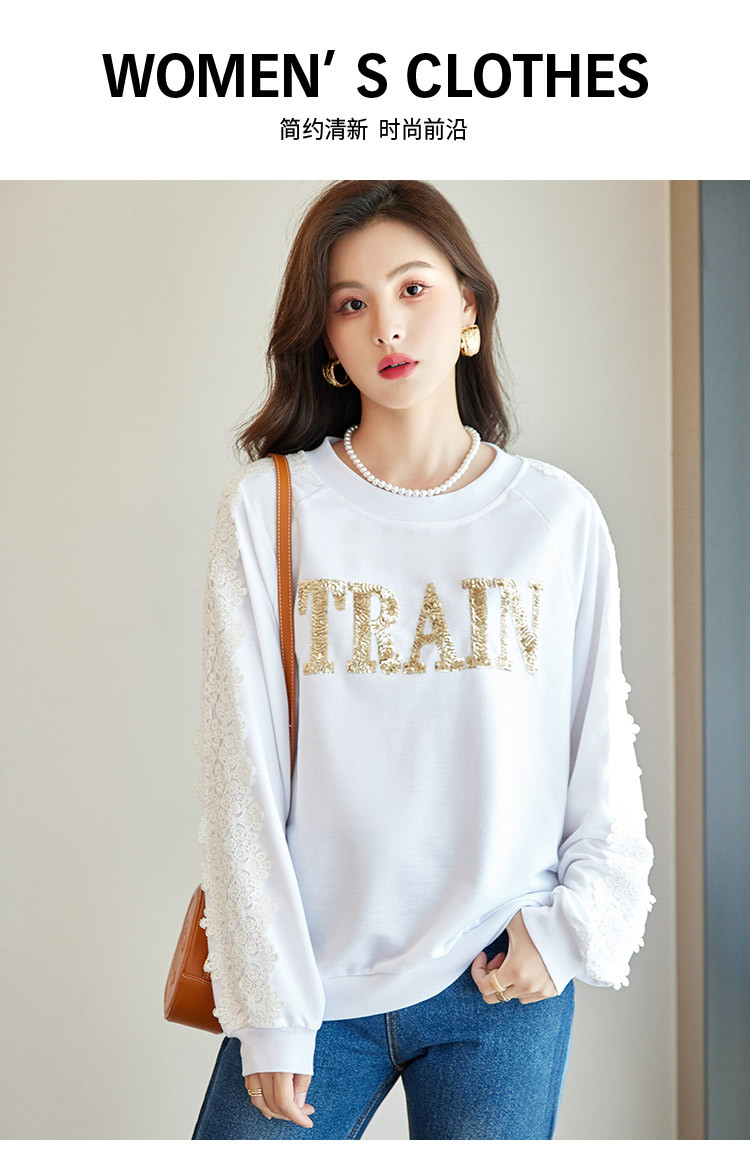 商品名称:【爆款热卖】圆领纯色镂空镶钻蕾丝拼接卫衣女字母印花时尚上衣 448344
