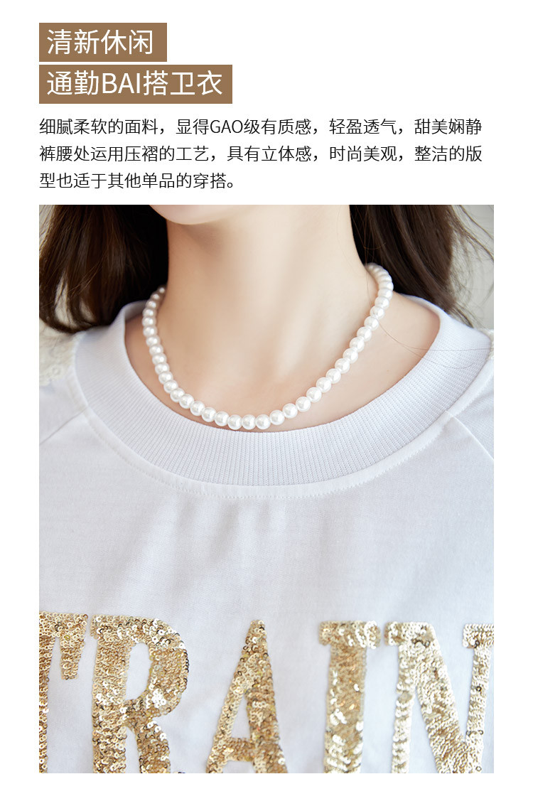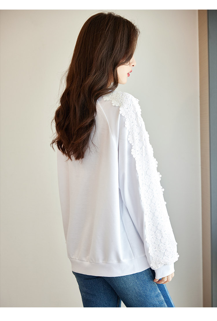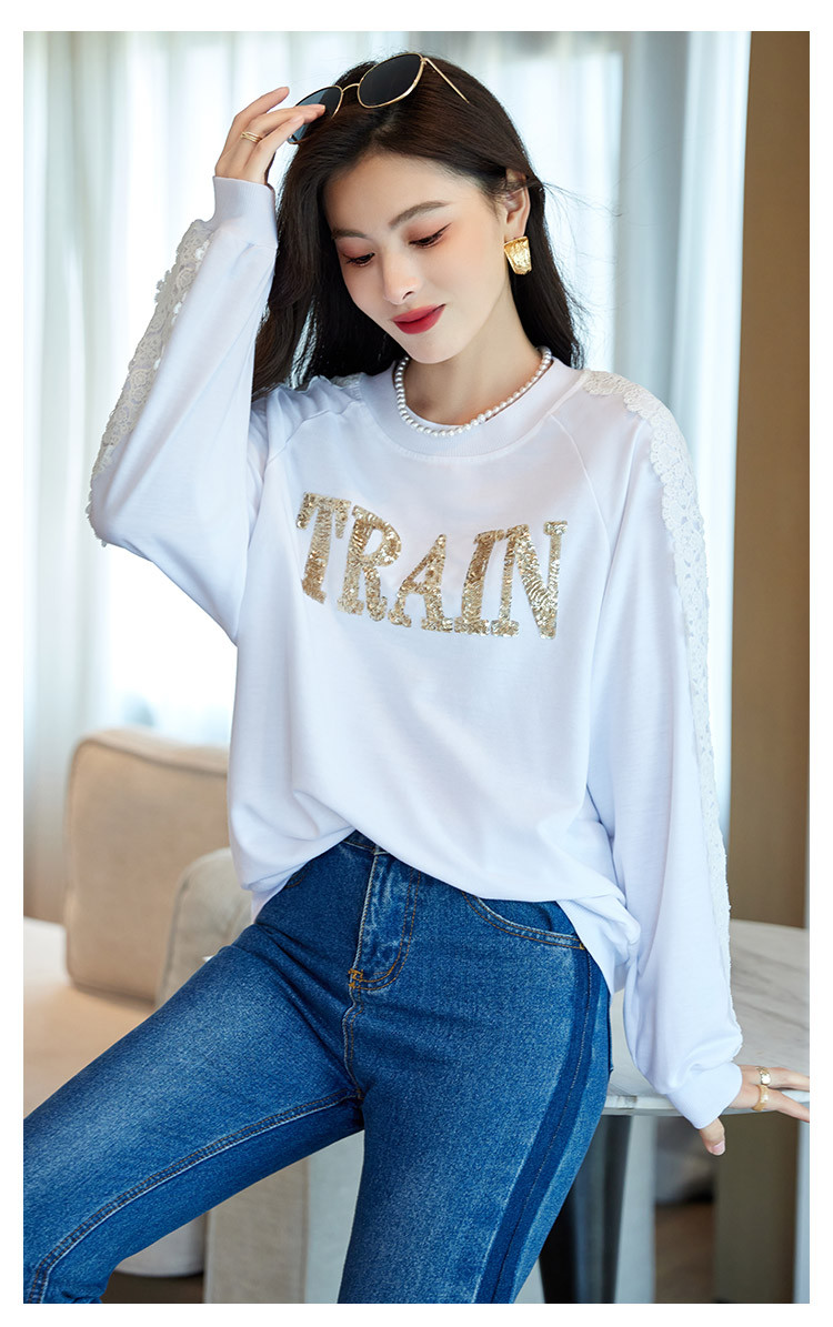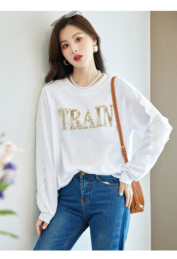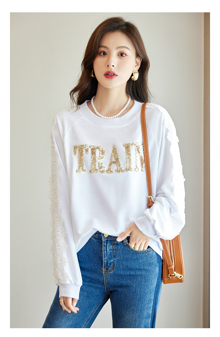 商品名称:【爆款热卖】圆领纯色镂空镶钻蕾丝拼接卫衣女字母印花时尚上衣 448344