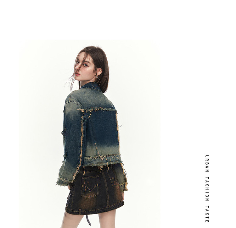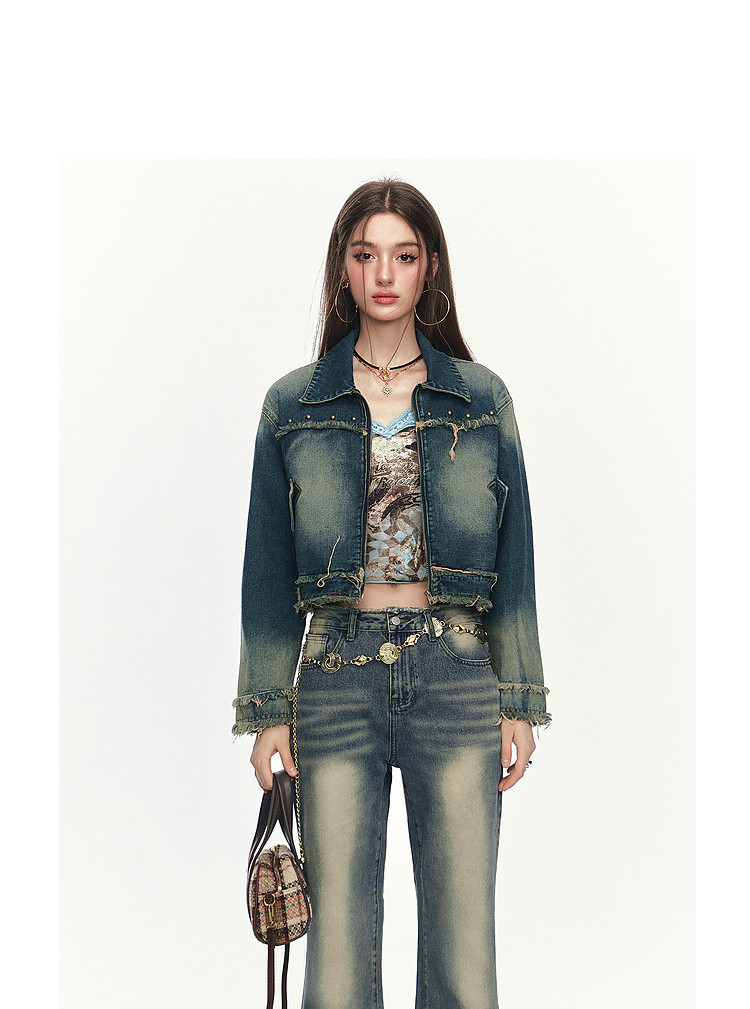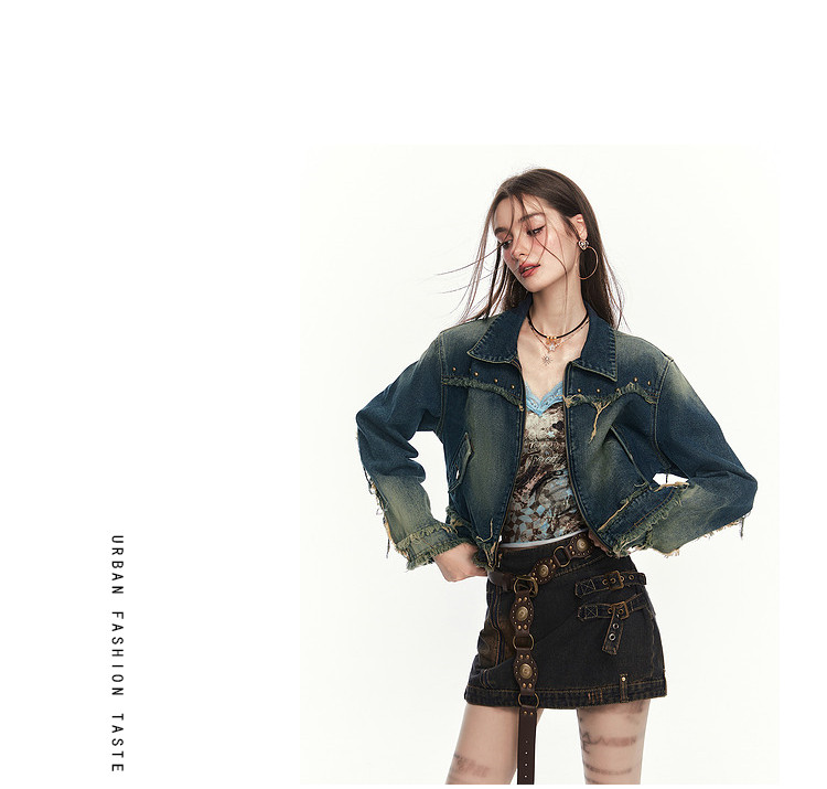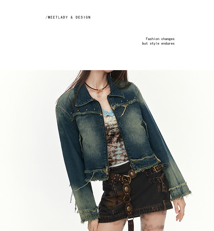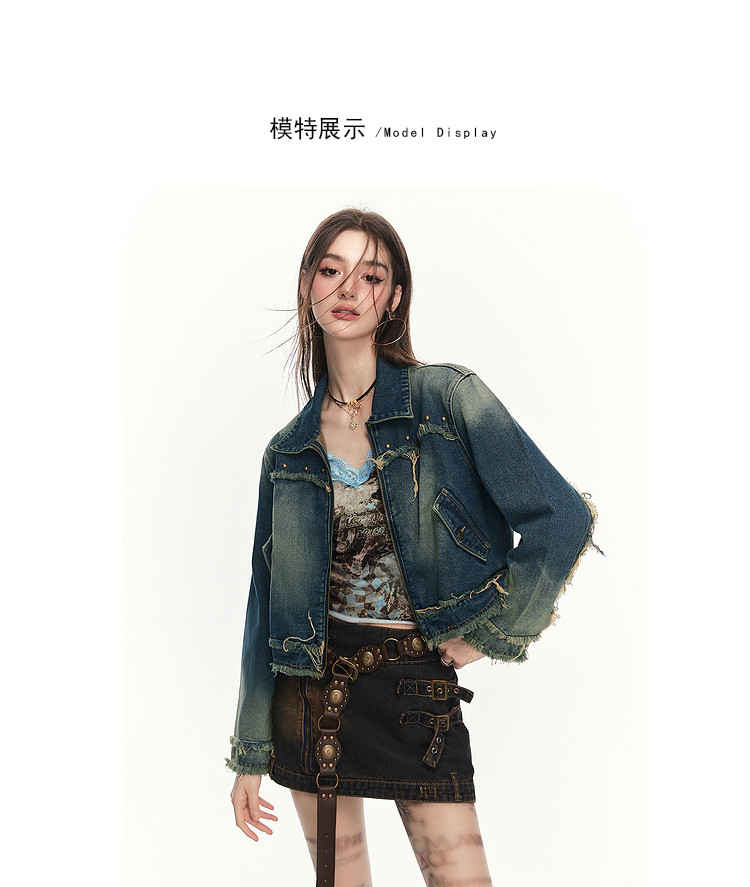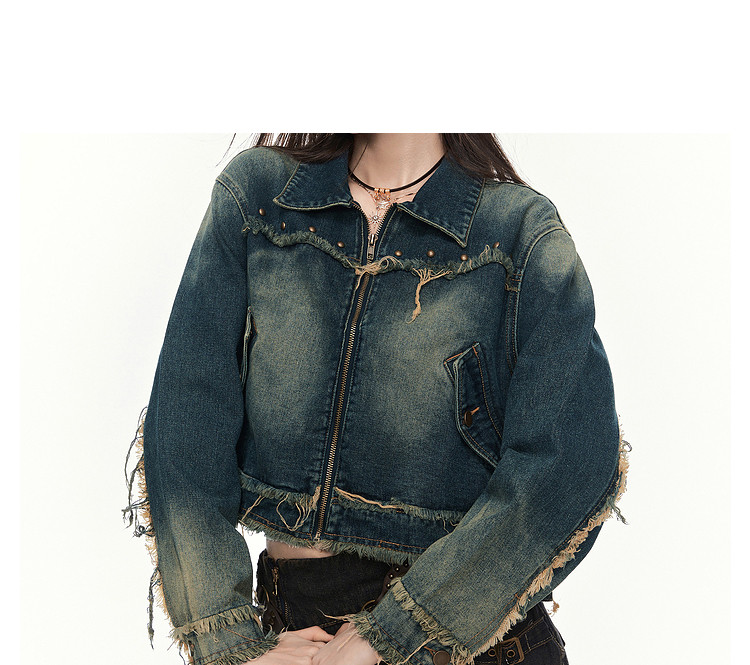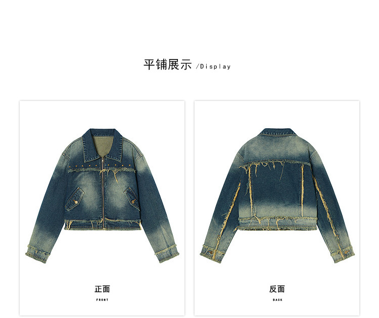 商品名称:【秋季热卖】设计感毛边牛仔外套女春秋款分割线铆钉装饰小众上衣 918356