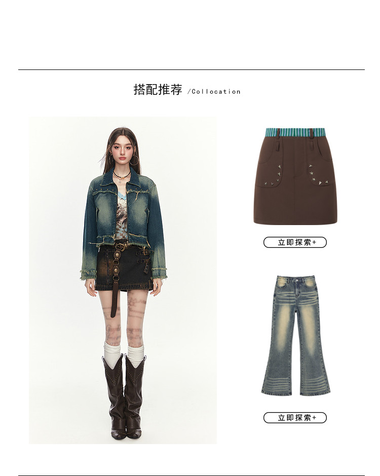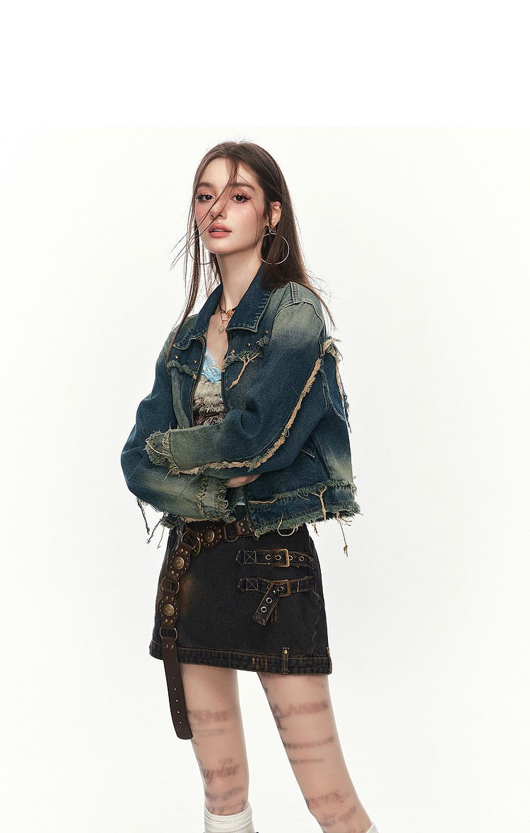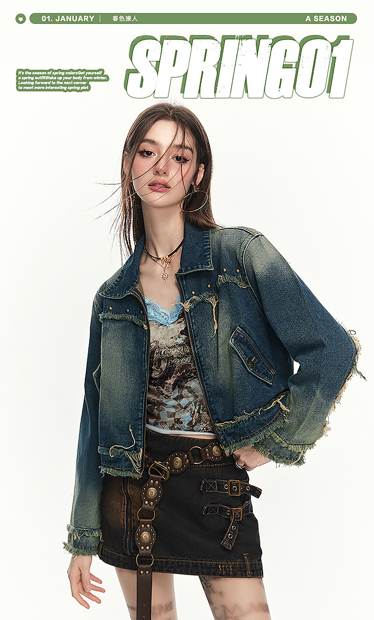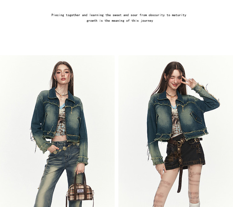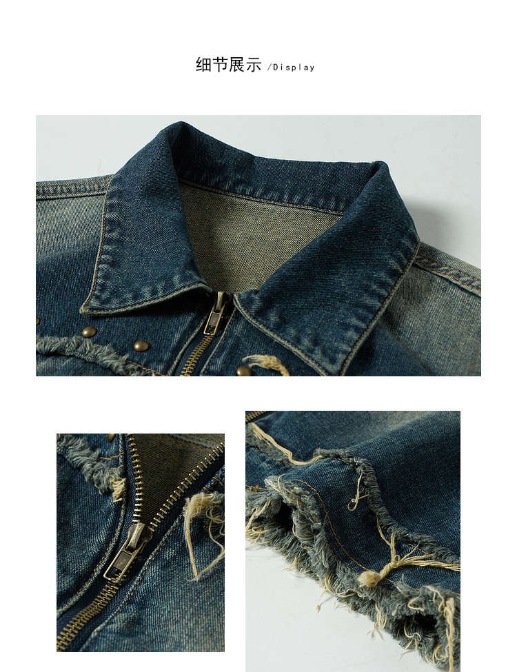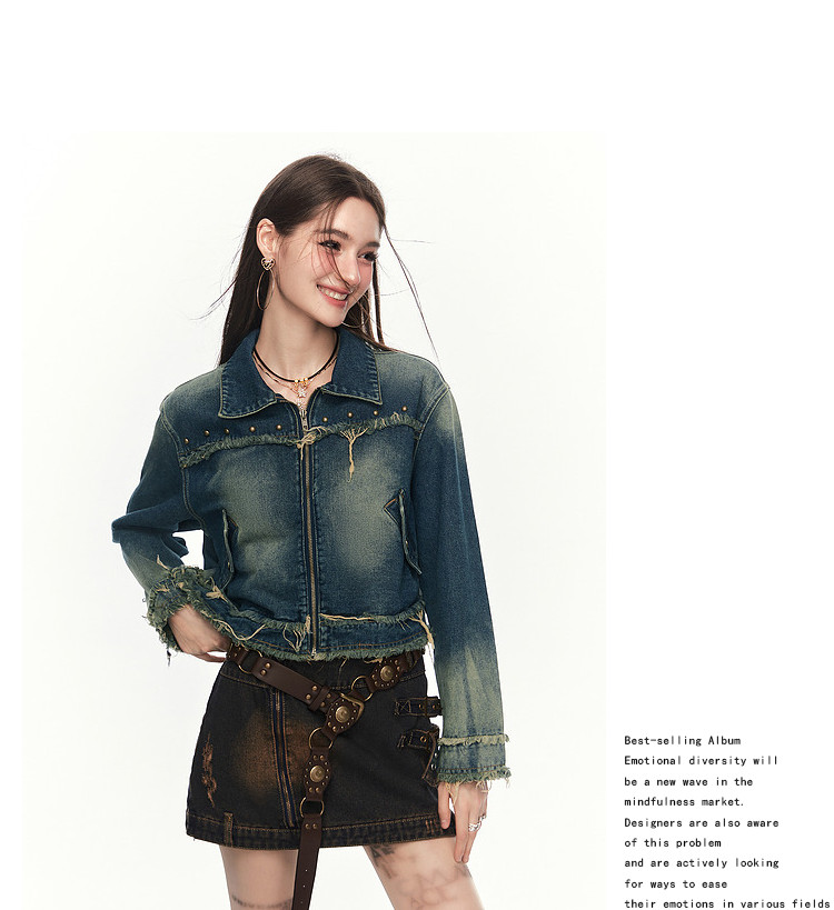 商品名称:【秋季热卖】设计感毛边牛仔外套女春秋款分割线铆钉装饰小众上衣 918356