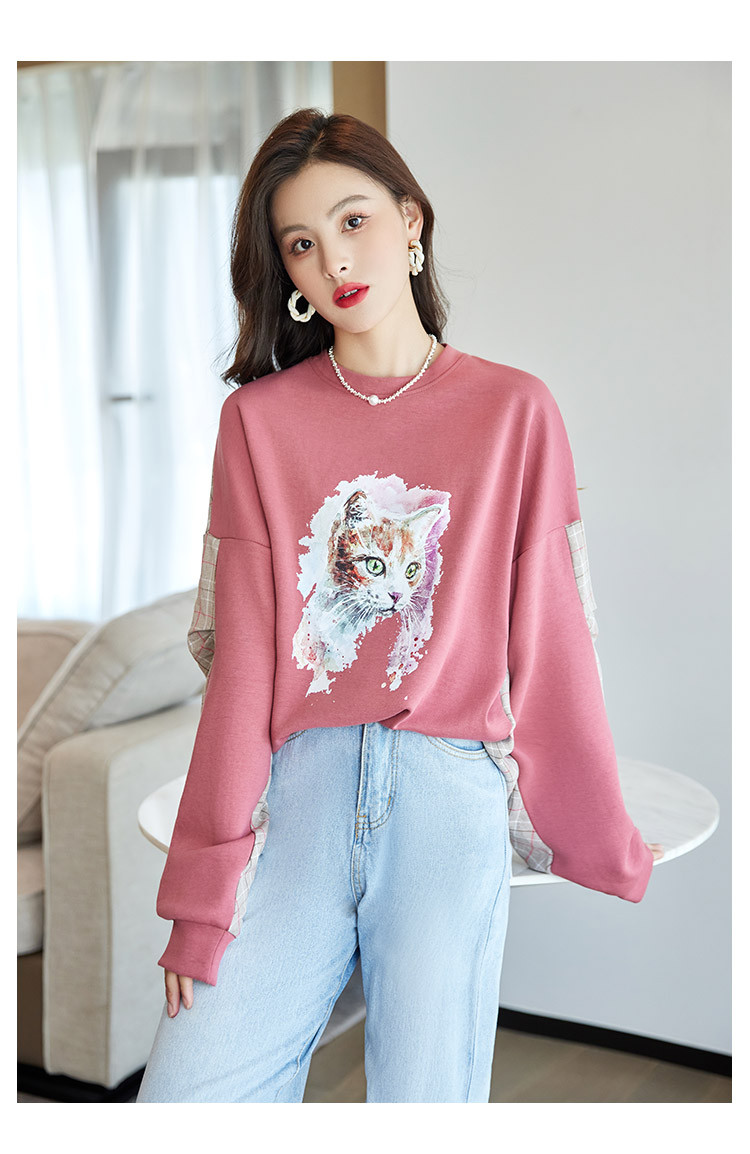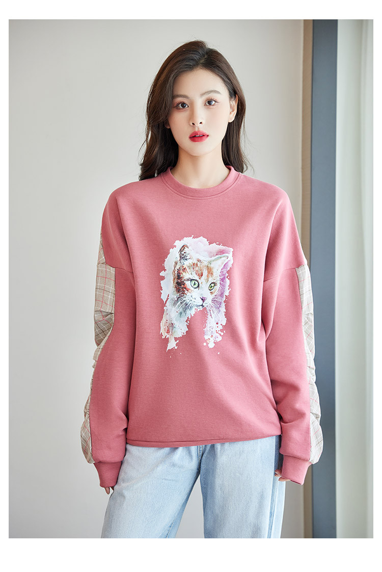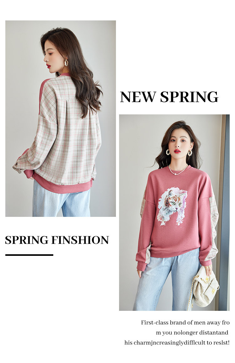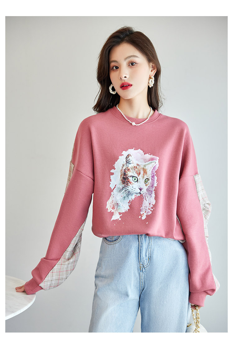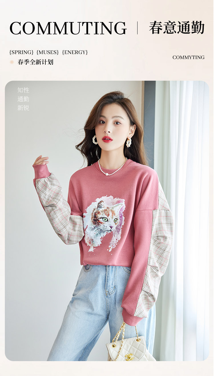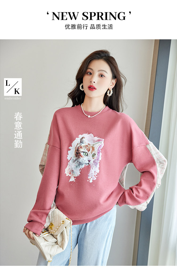 商品名称:可爱猫咪印花卫衣女春季圆领宽松显瘦格纹拼接上衣长袖t内搭 137048
