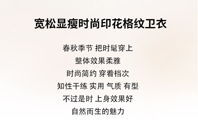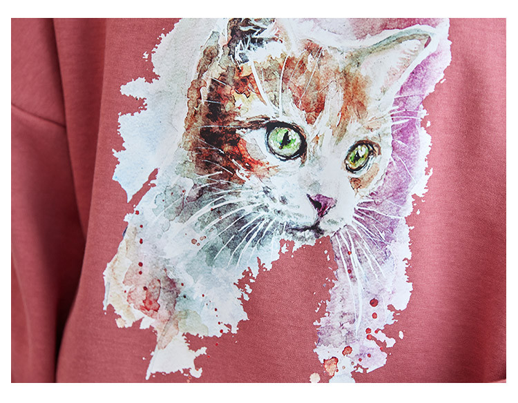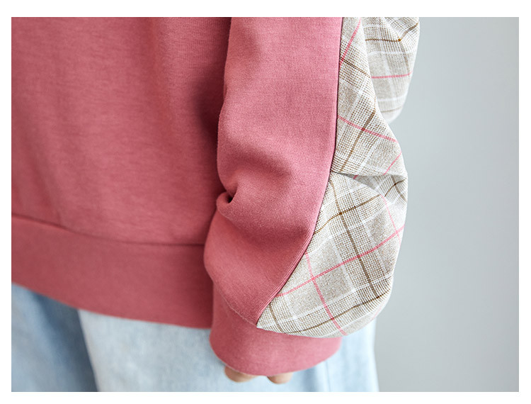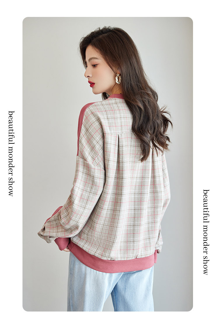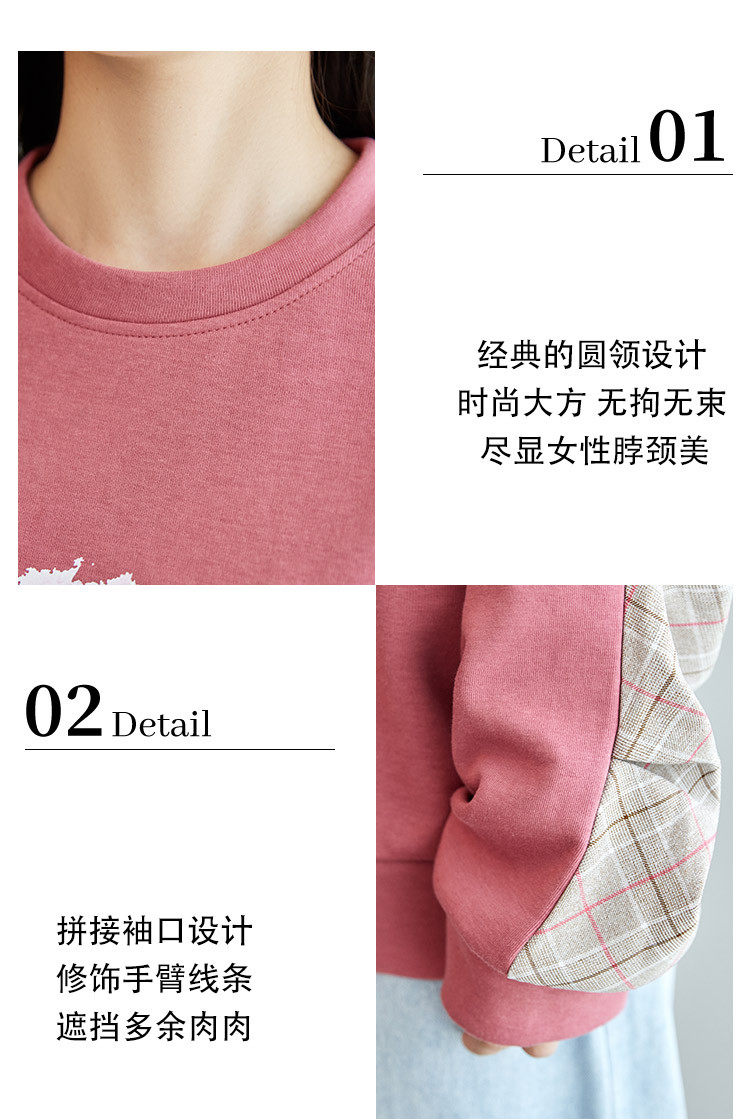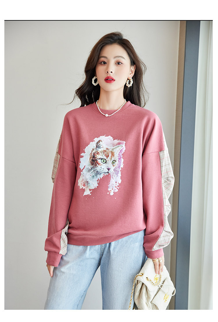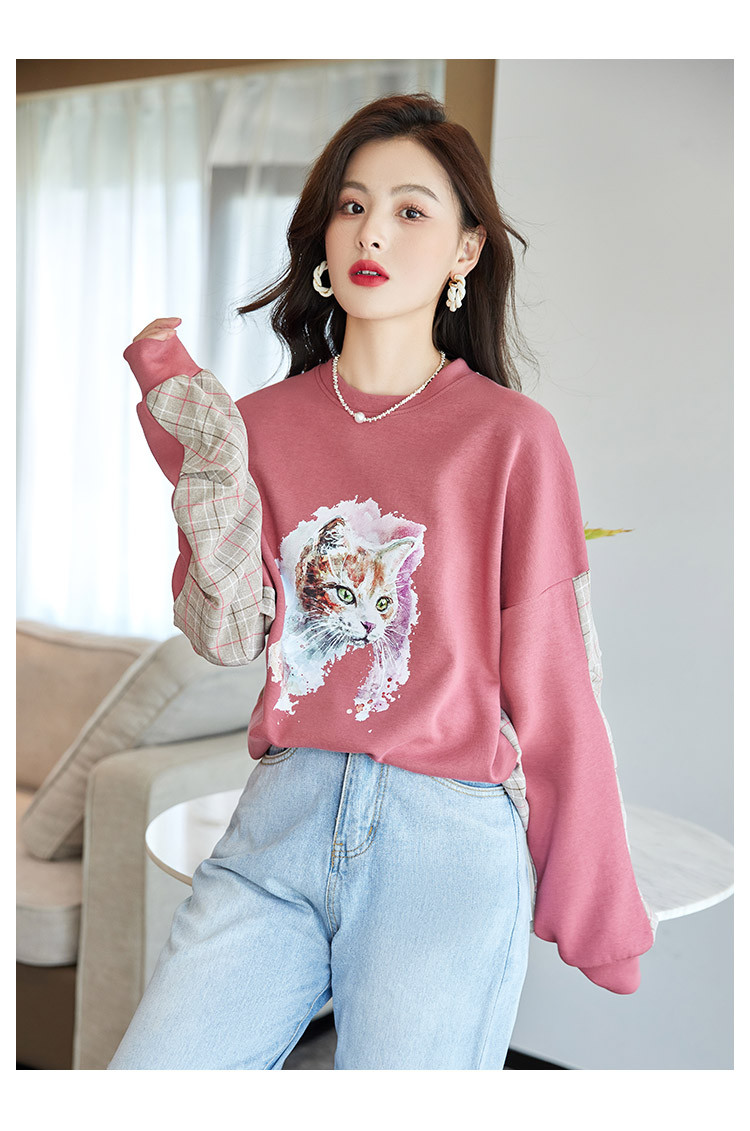 商品名称:可爱猫咪印花卫衣女春季圆领宽松显瘦格纹拼接上衣长袖t内搭 137048
