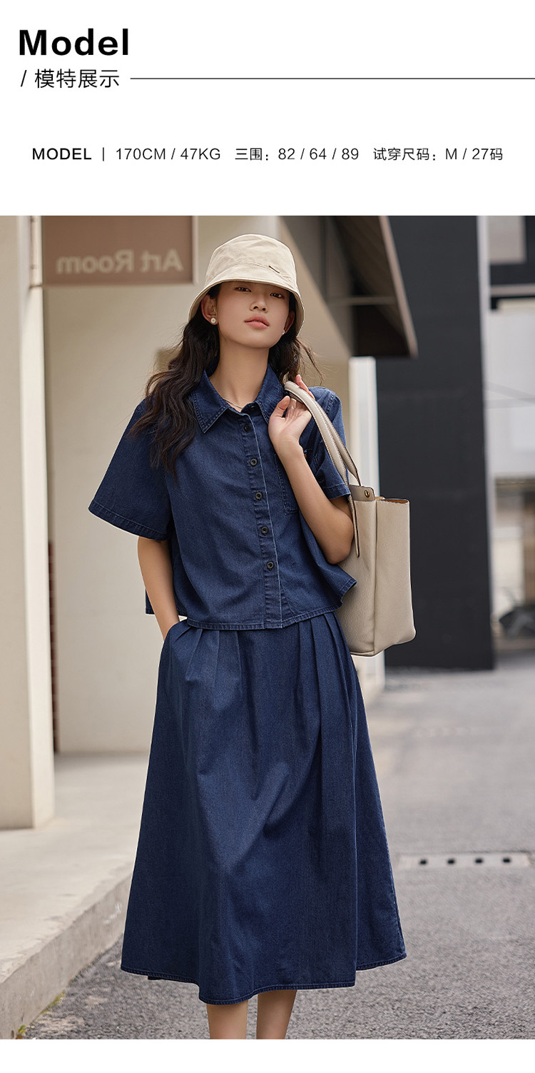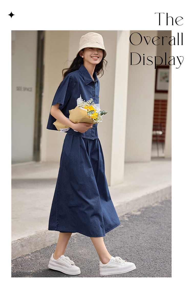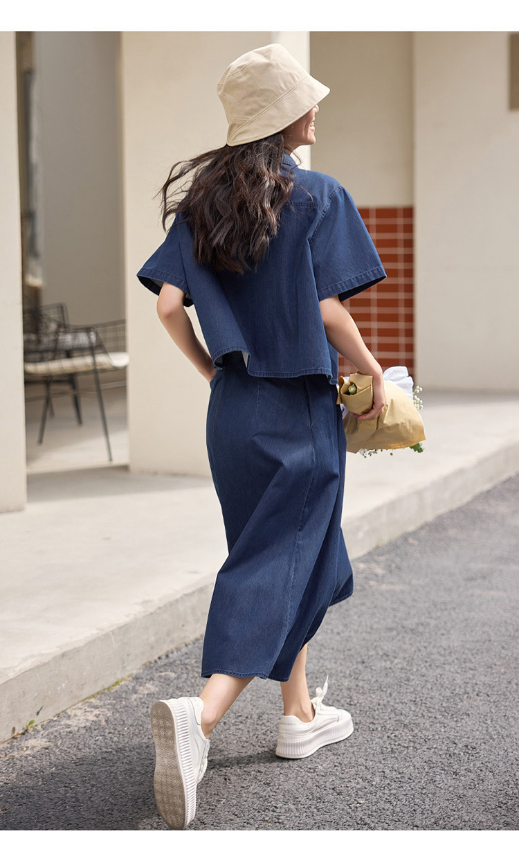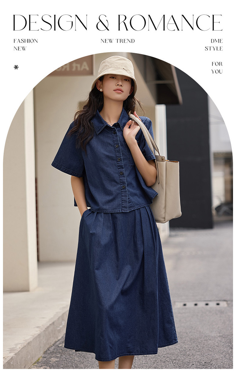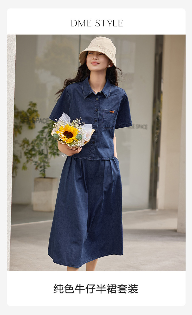 【牛仔套装】夏款网红风翻领短袖纯色牛仔半裙两件套女 248386