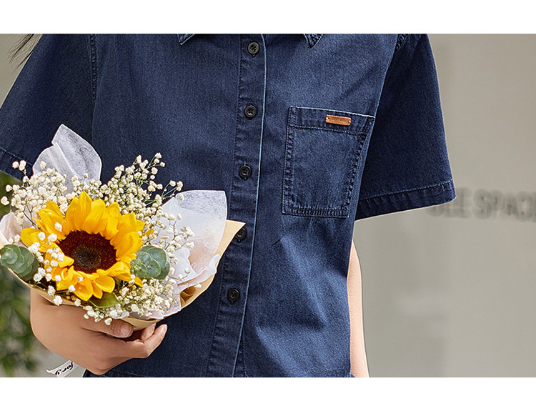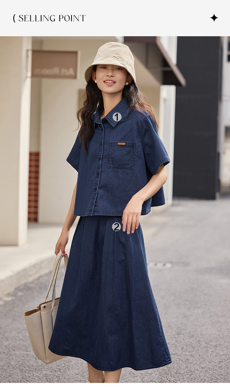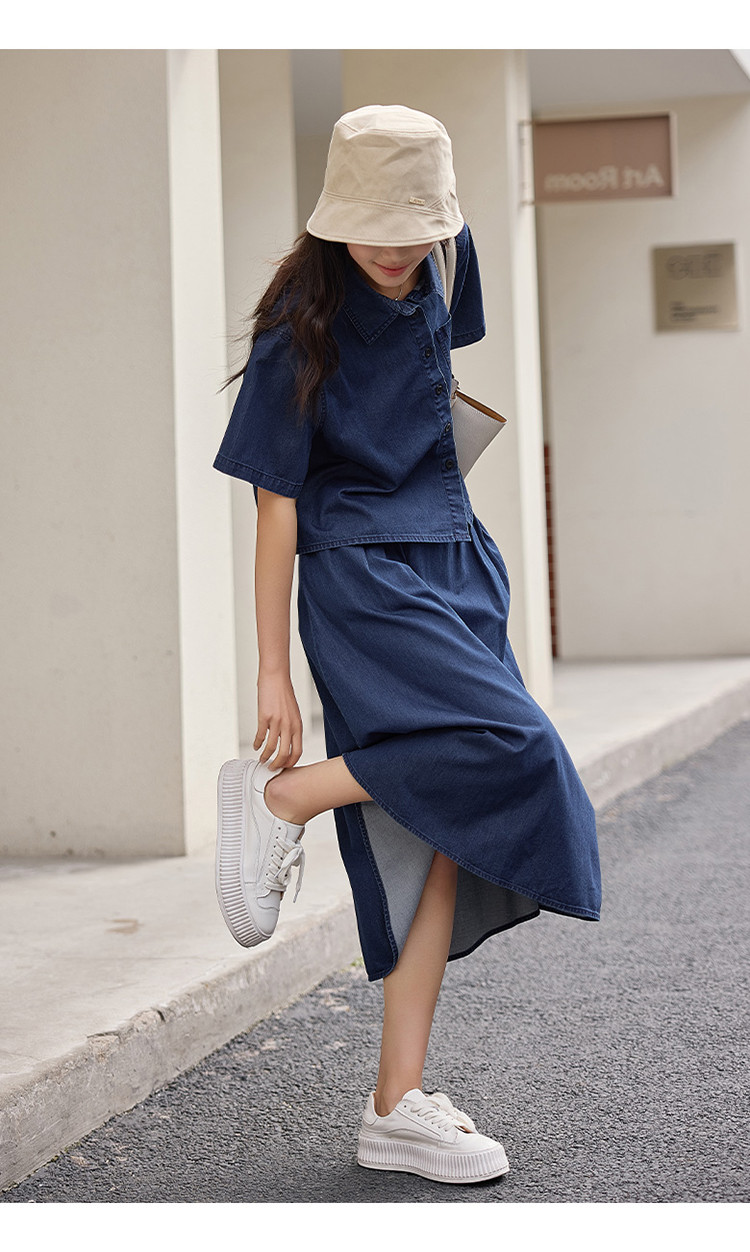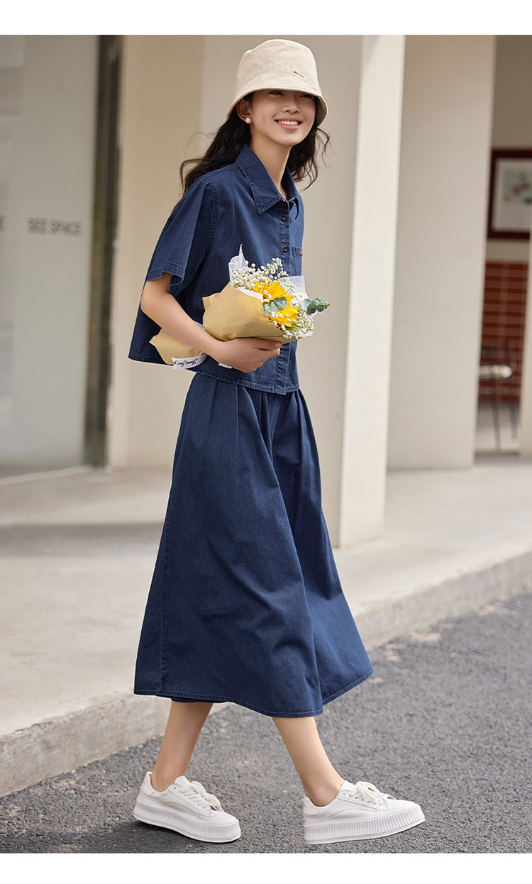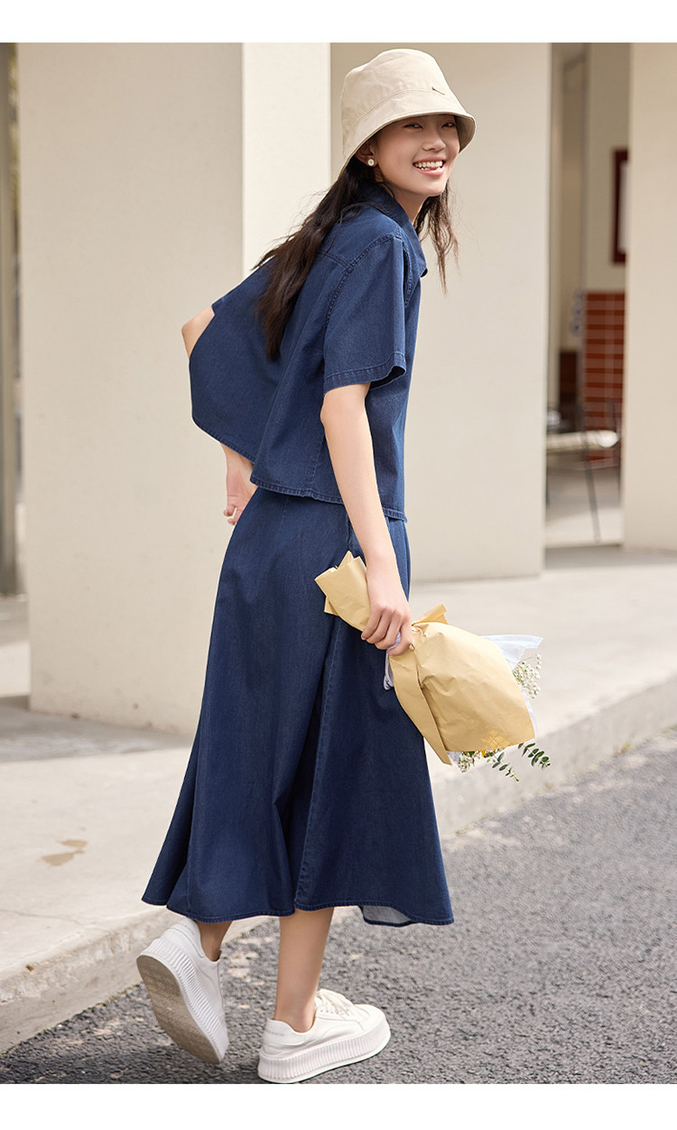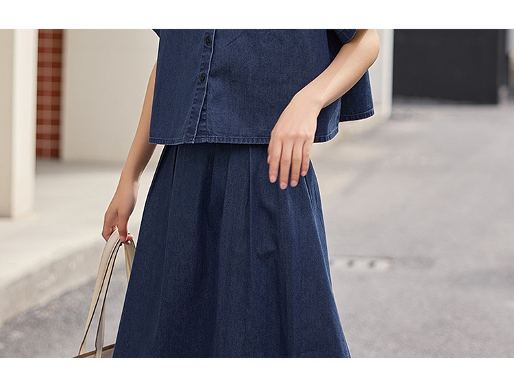 【牛仔套装】夏款网红风翻领短袖纯色牛仔半裙两件套女 248386