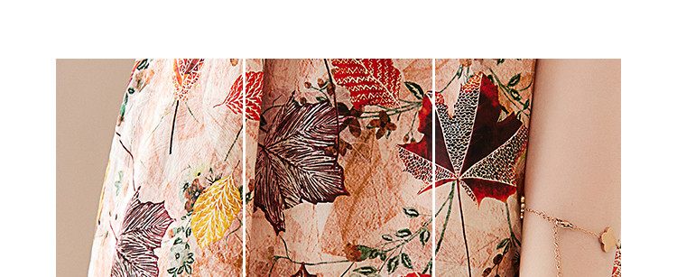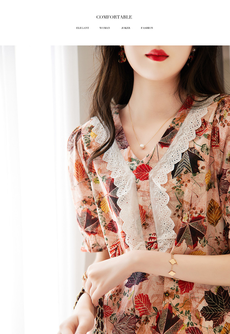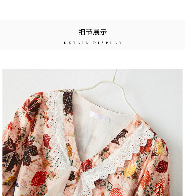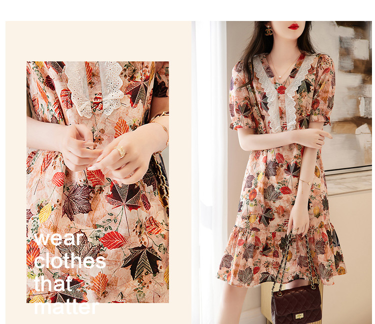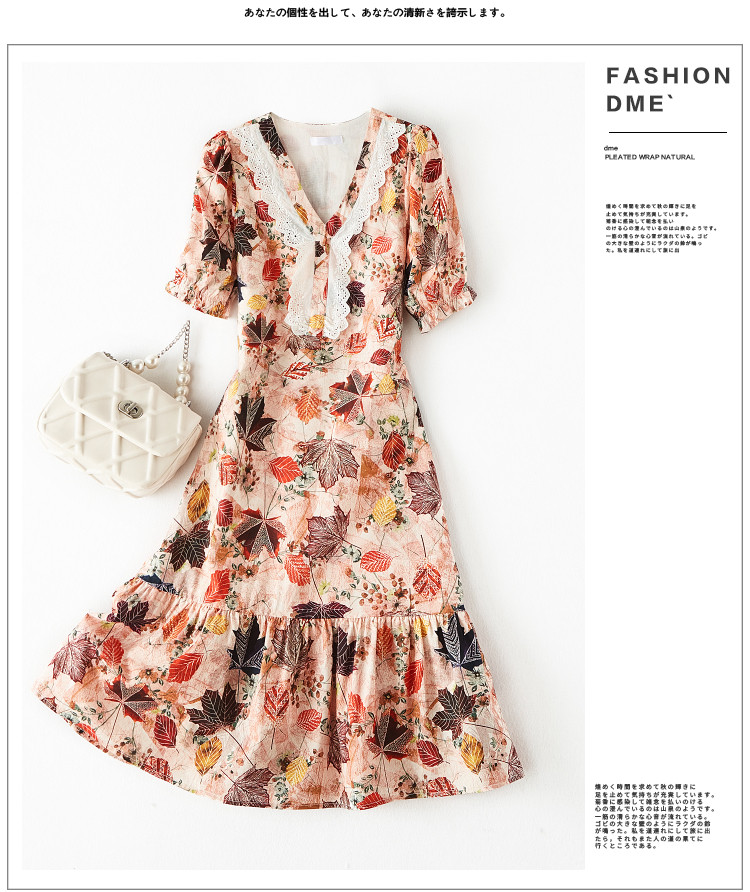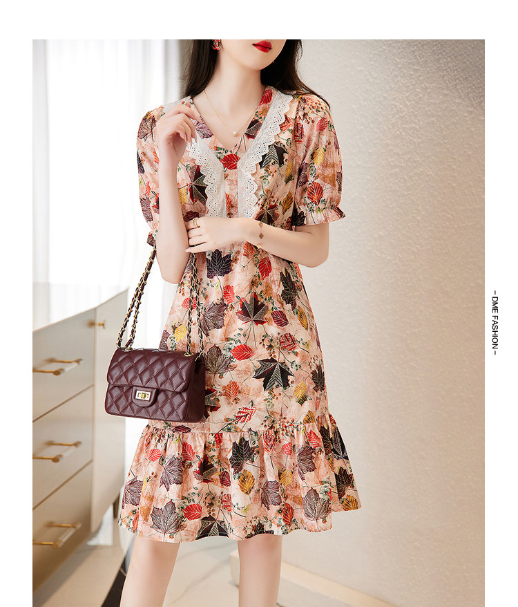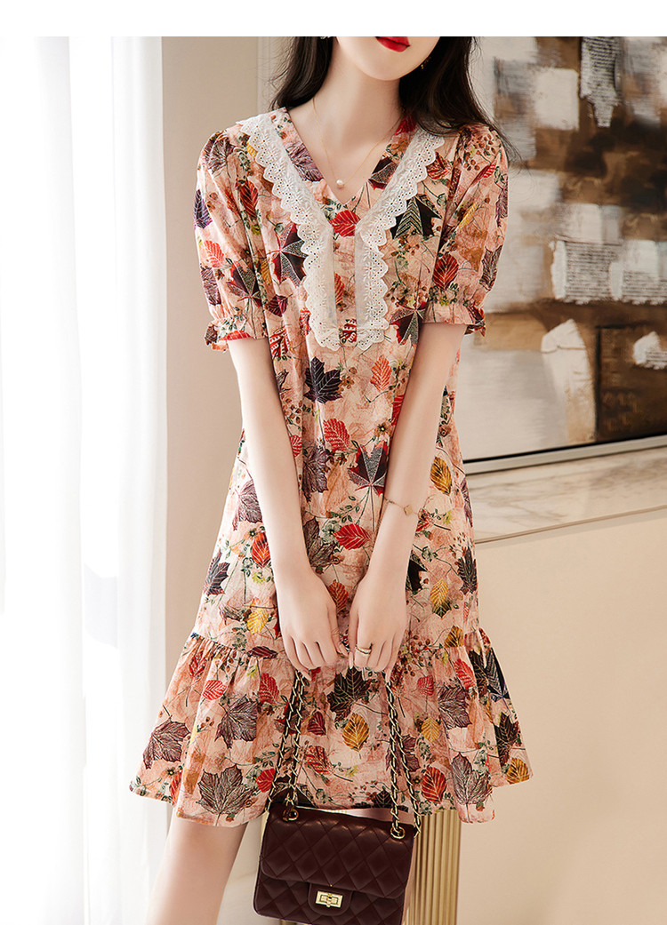 商品名称:【棉布枫叶印花】夏V领泡泡袖拼接双层蕾丝鱼尾连衣裙女夏 006529