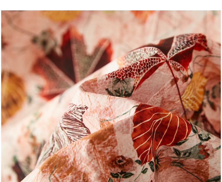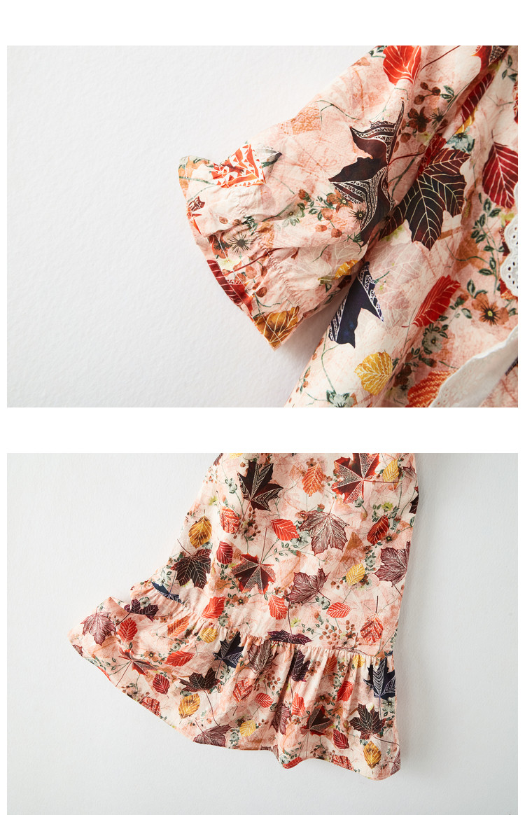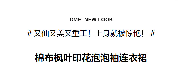【棉布枫叶印花】夏V领泡泡袖拼接双层蕾丝鱼尾连衣裙女夏 006529