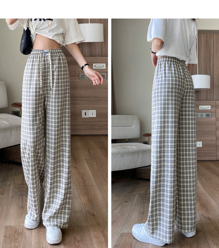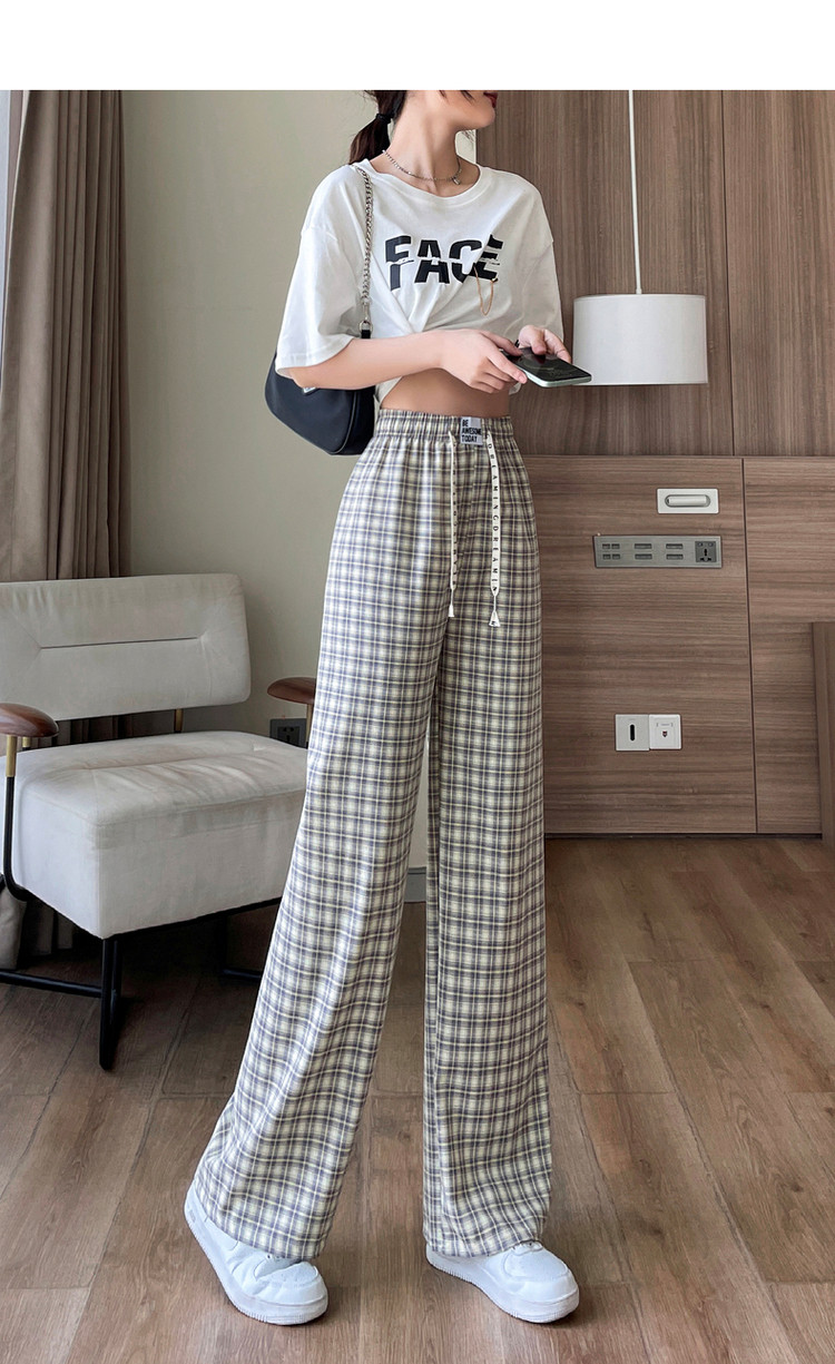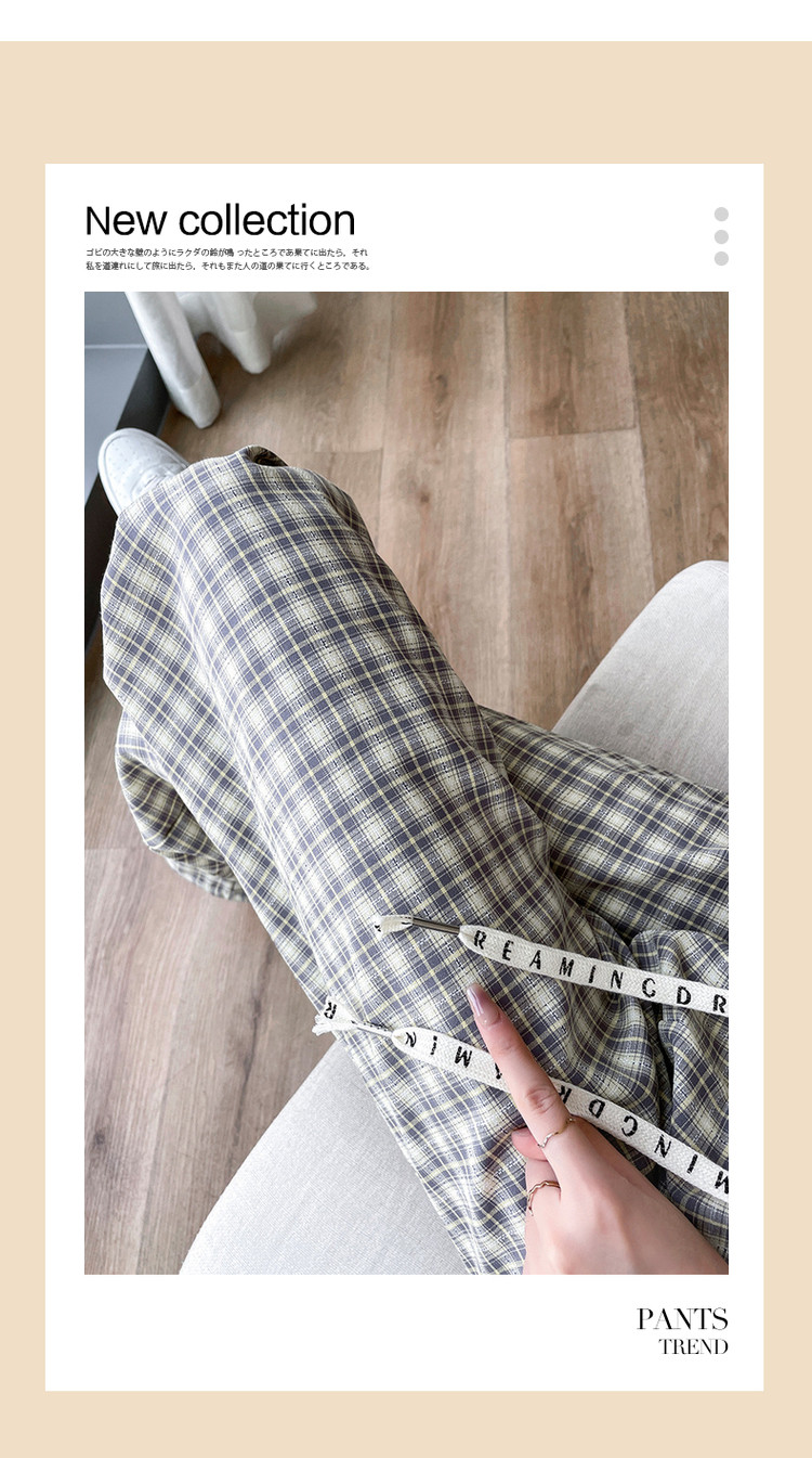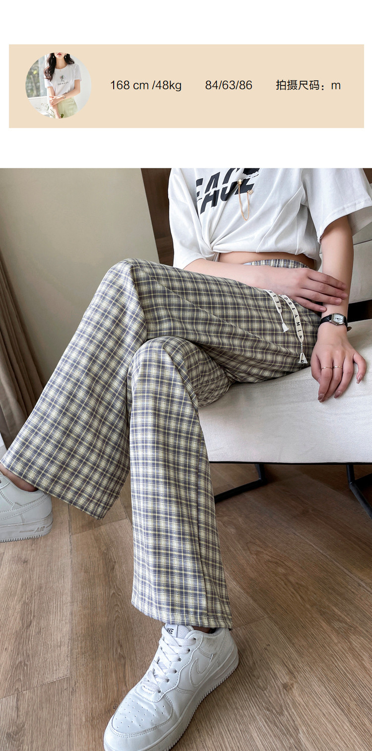 商品名称:【格纹阔腿裤】夏松紧腰系绳女裤微弹薄款直筒裤子女休闲裤 443649