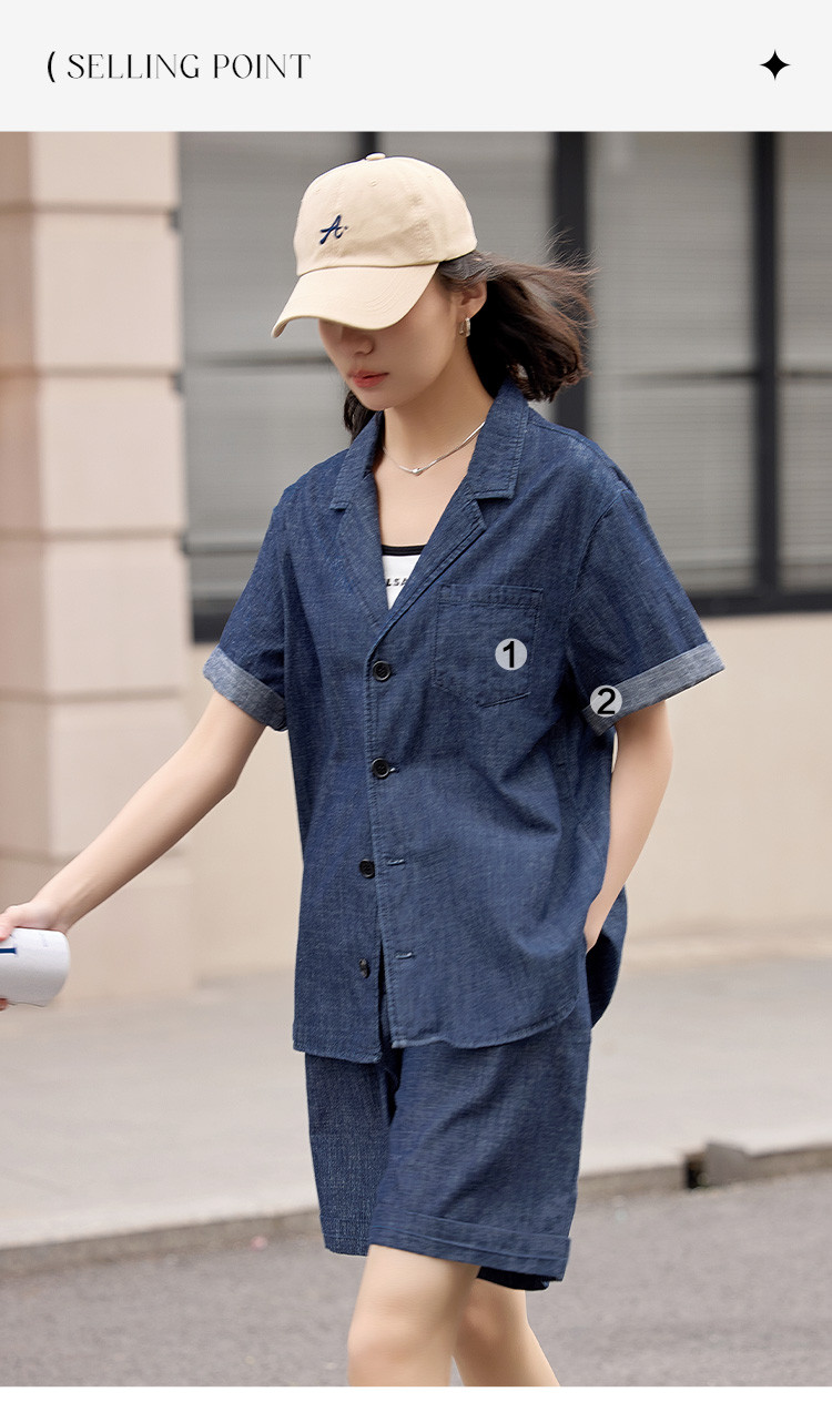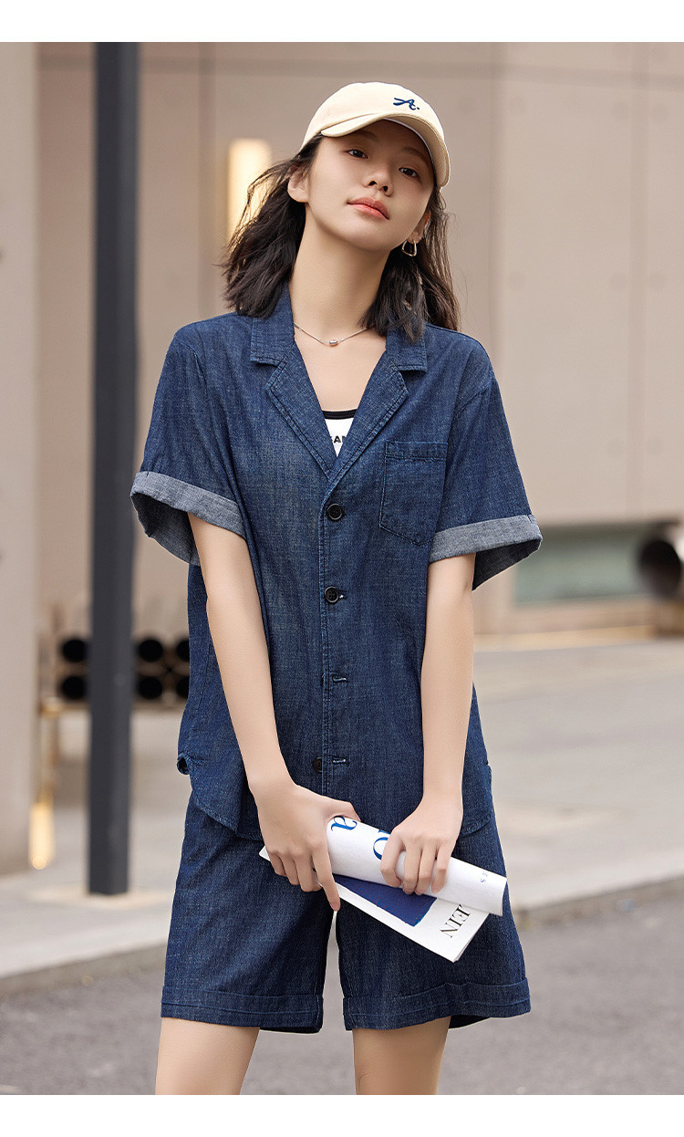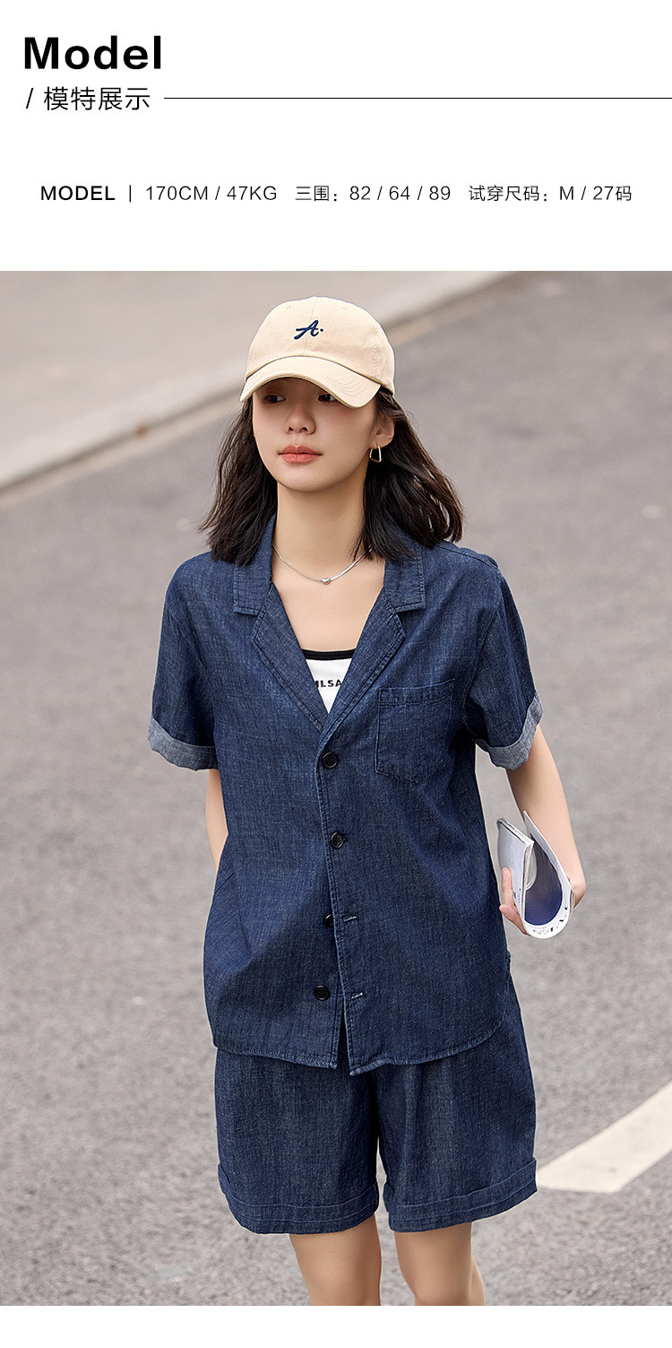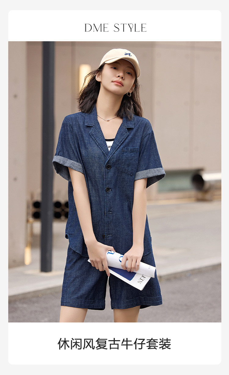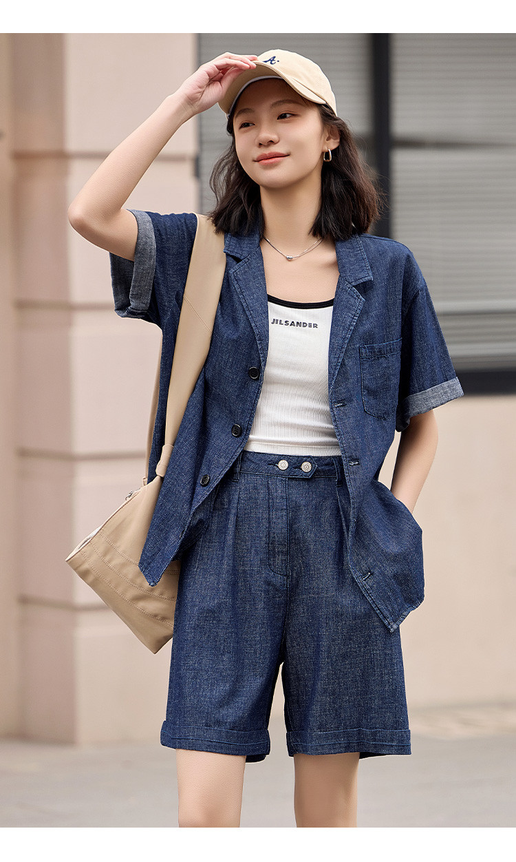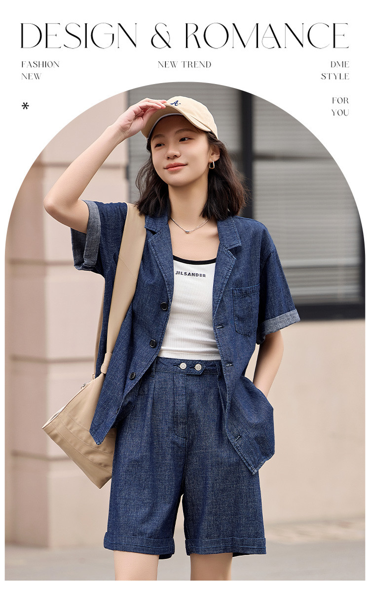 【简单百搭西装式牛仔短袖套装】设计时尚感女士两件套 107074