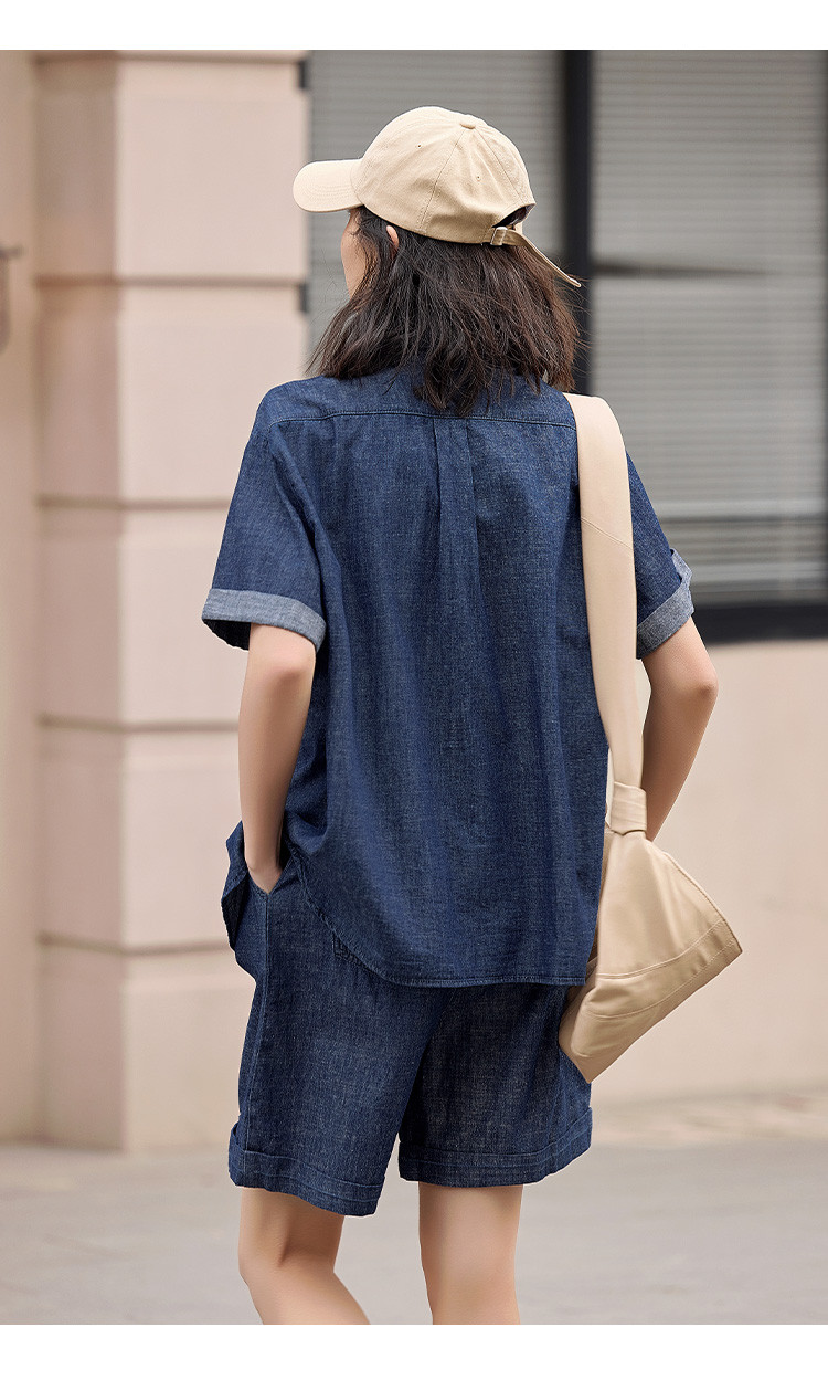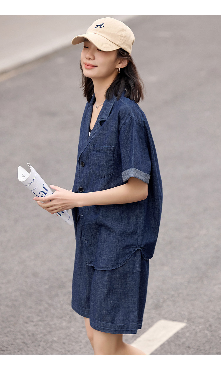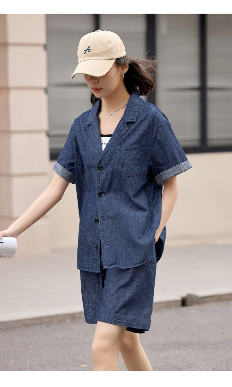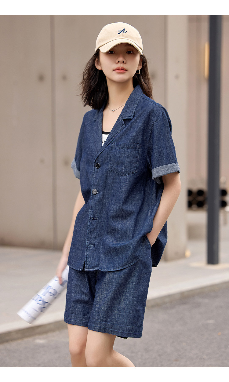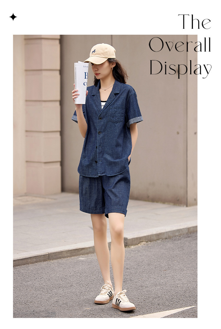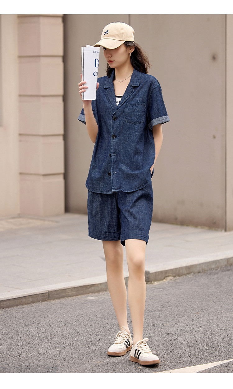 【简单百搭西装式牛仔短袖套装】设计时尚感女士两件套 107074