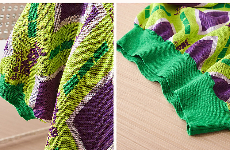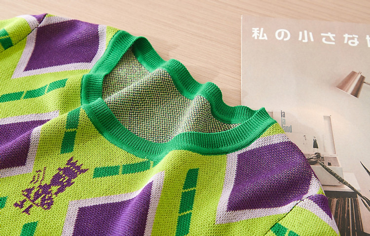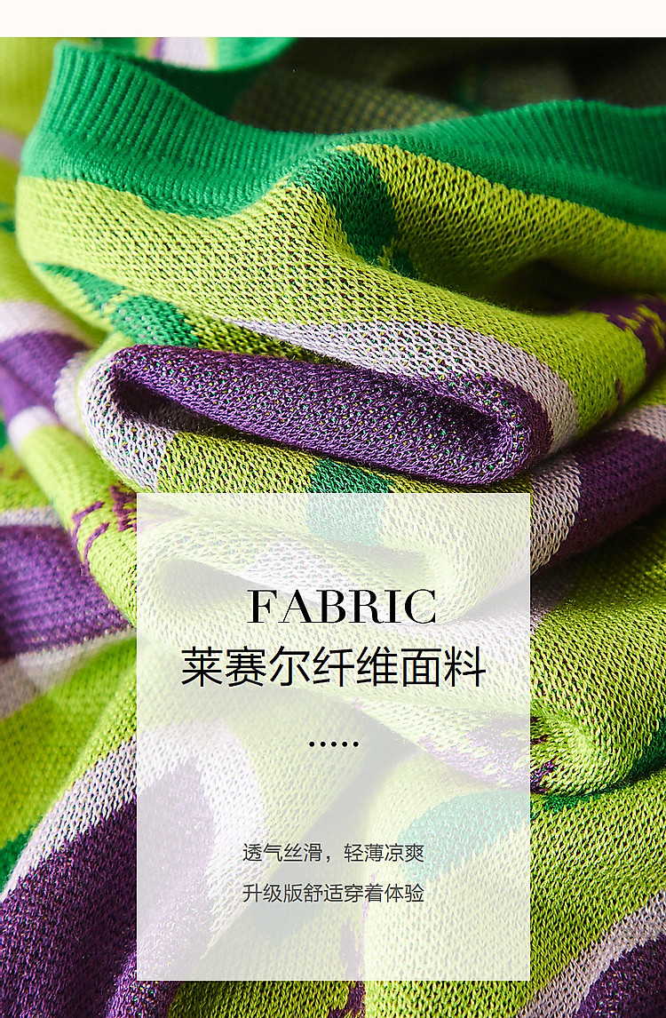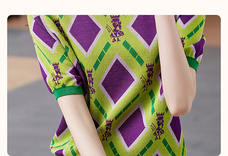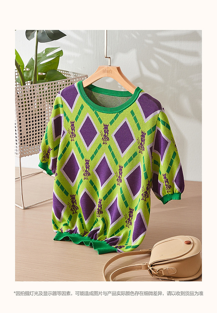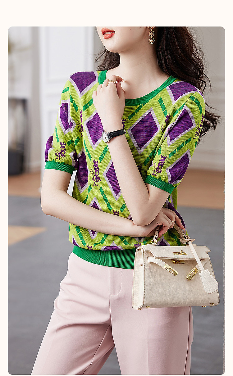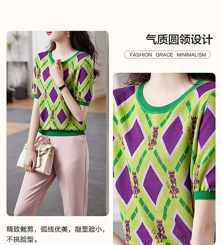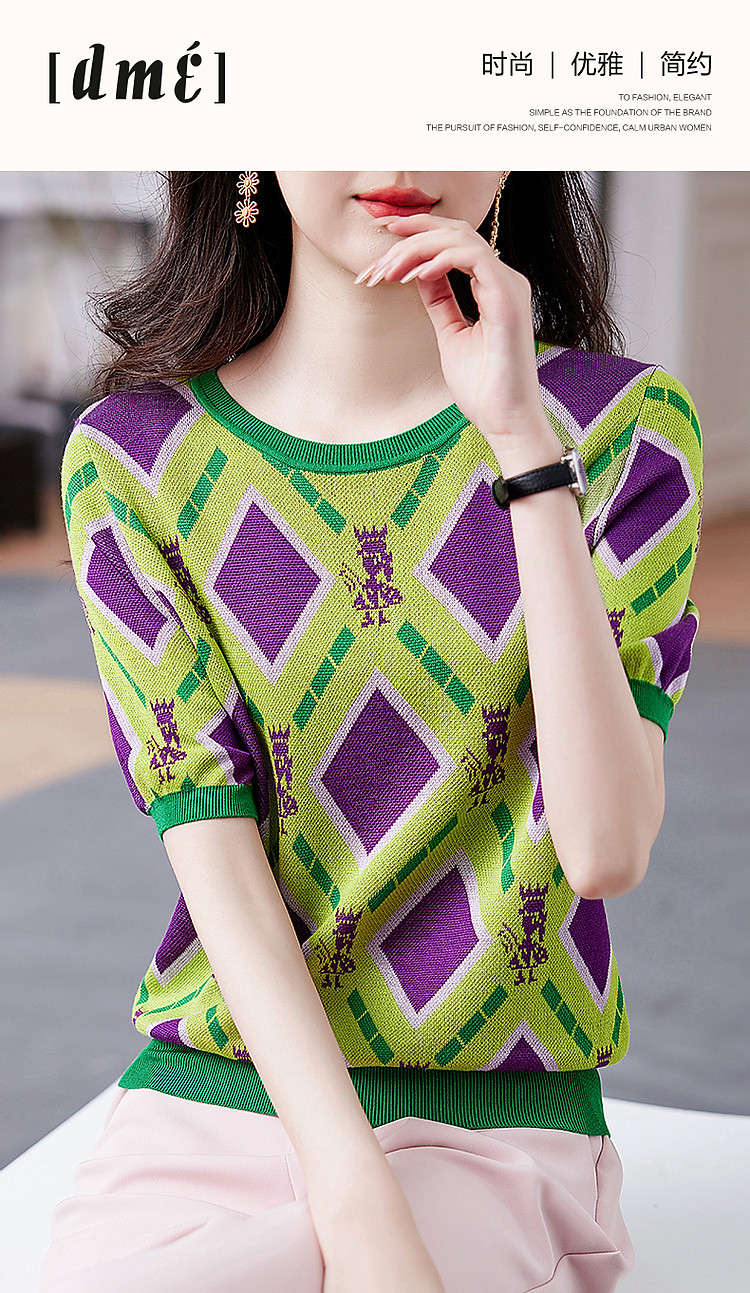 商品名称:【舒柔100莱赛尔】夏季复古圆领撞色几何线衫短袖针织衫女上衣 693441