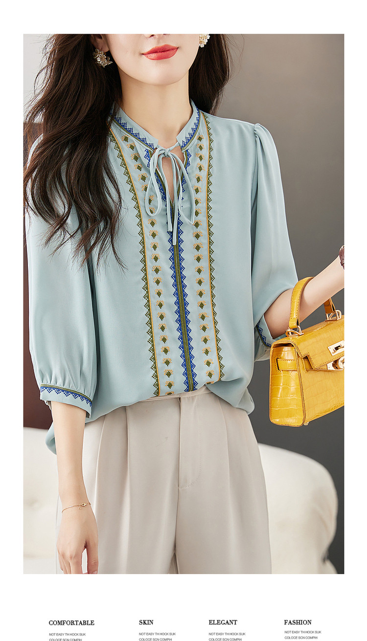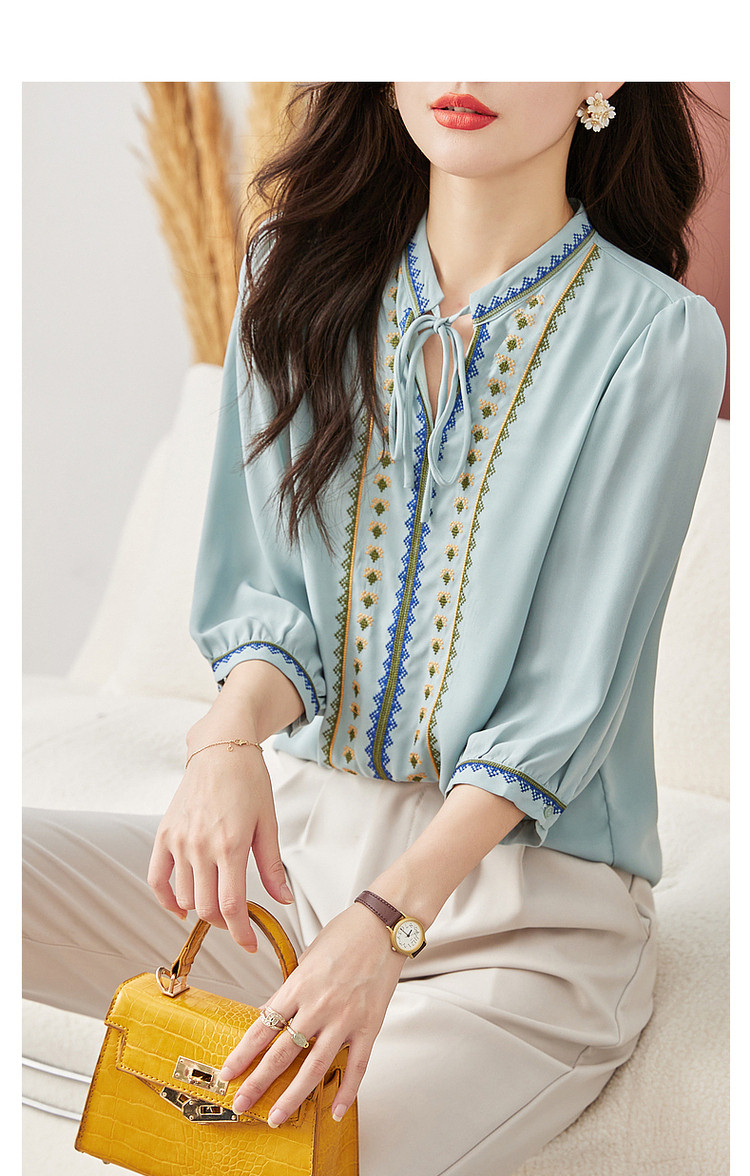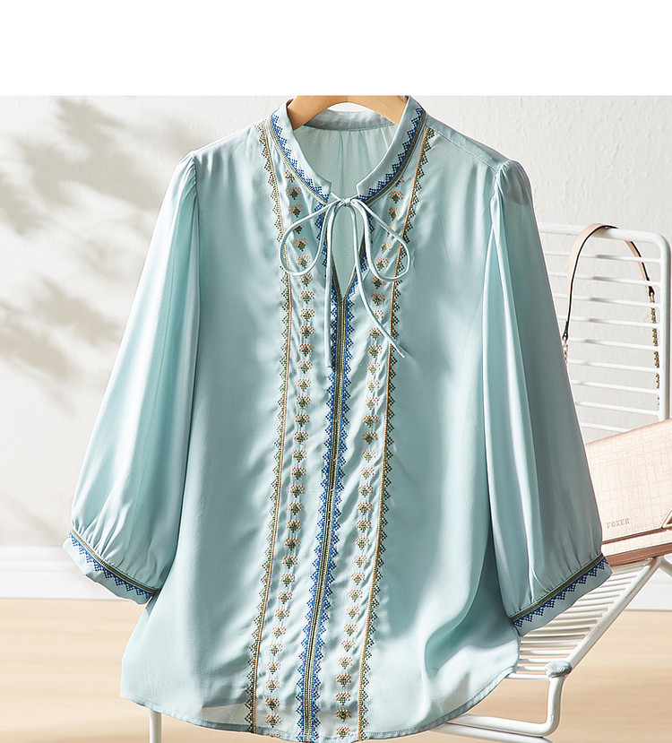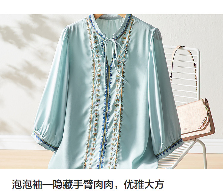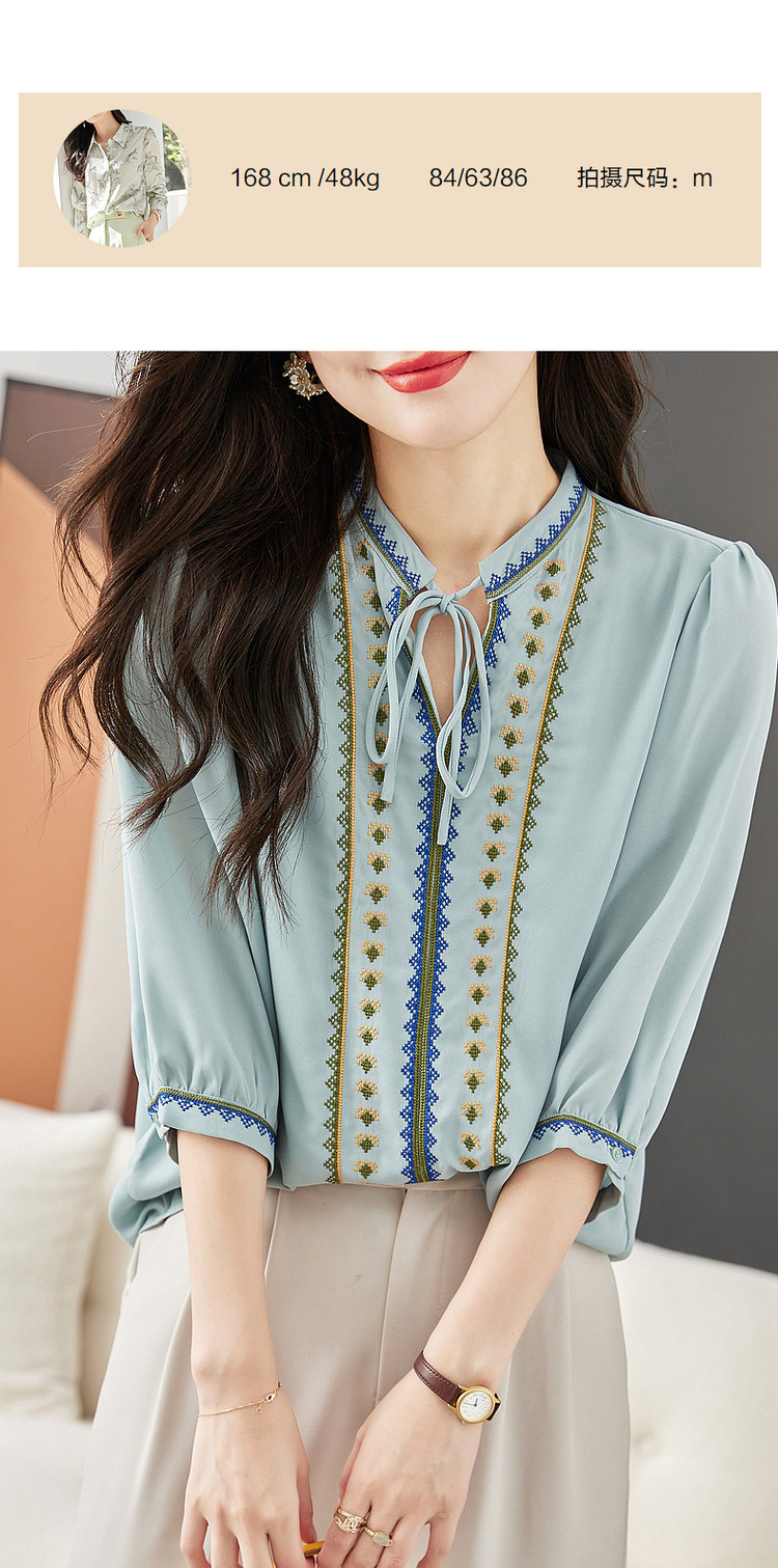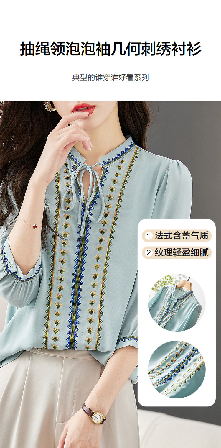 商品名称:【绣花工艺】春秋抽绳几何宽松泡泡袖七分袖复古衬衫女 185025