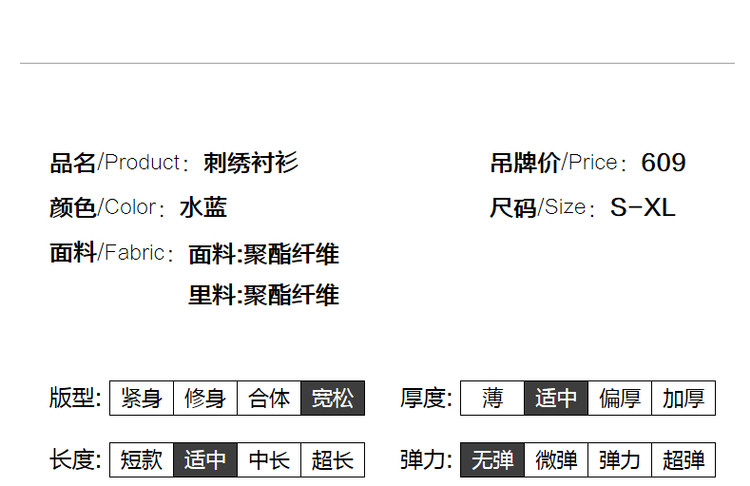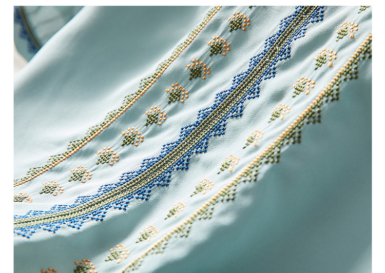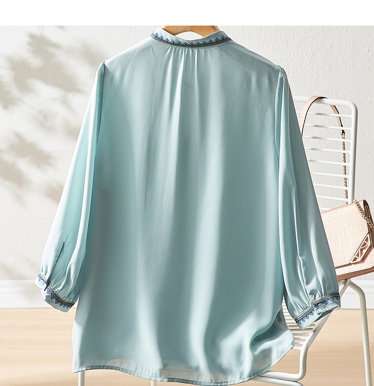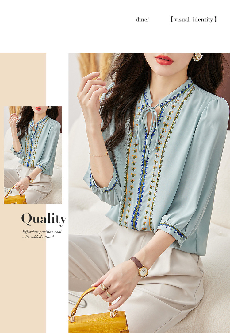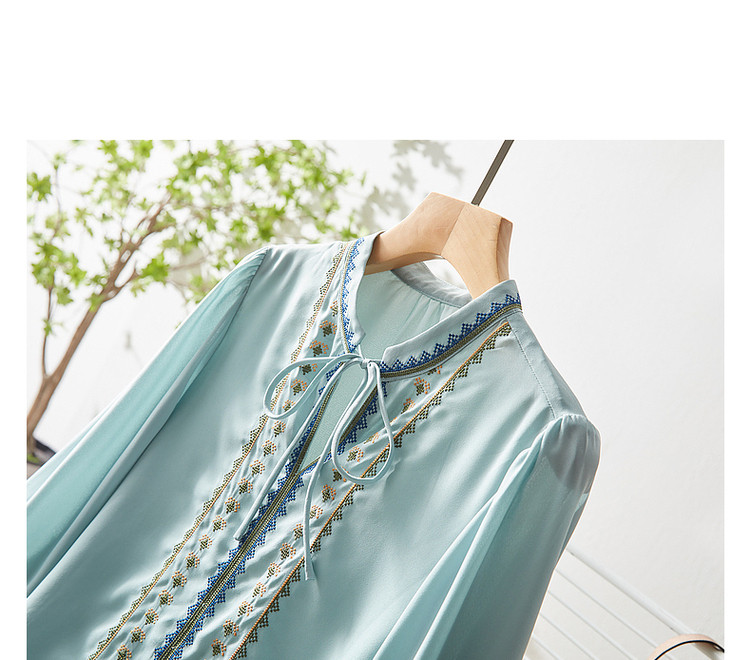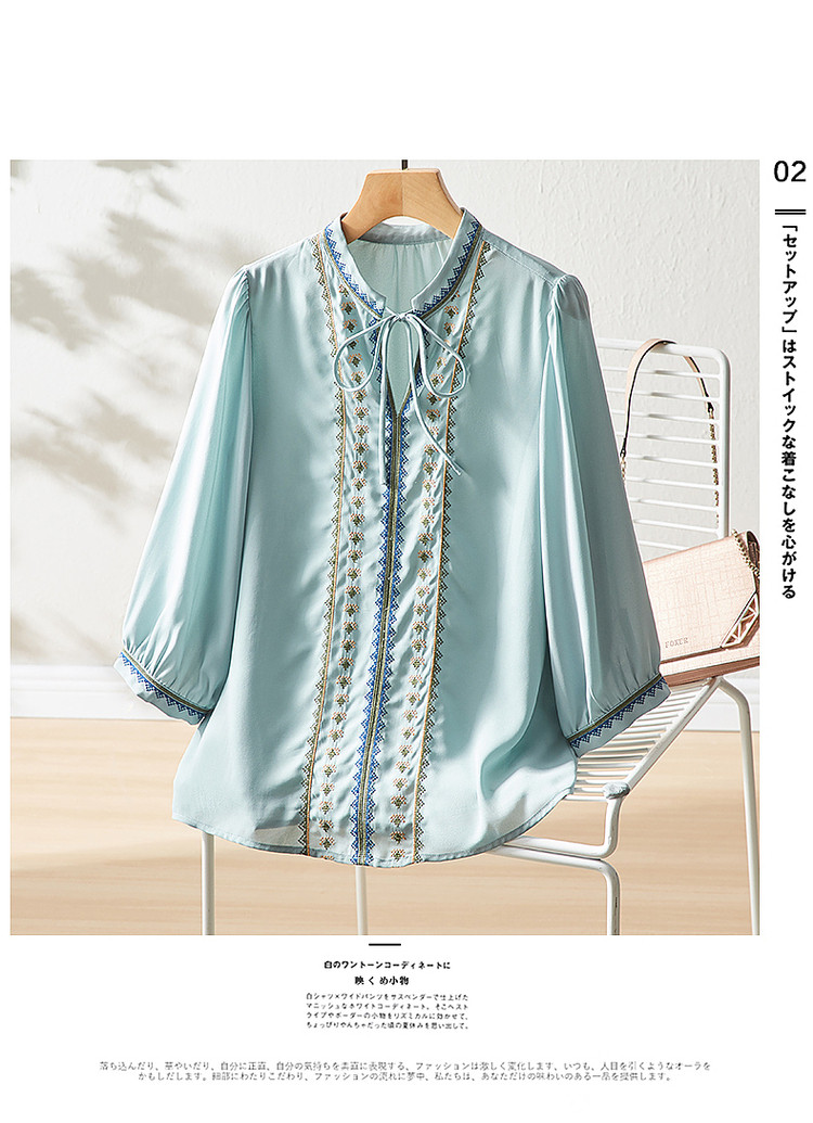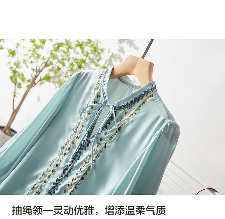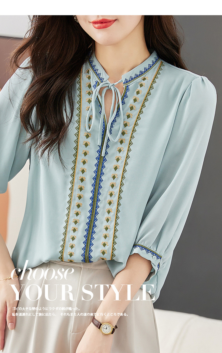 商品名称:【绣花工艺】春秋抽绳几何宽松泡泡袖七分袖复古衬衫女 185025