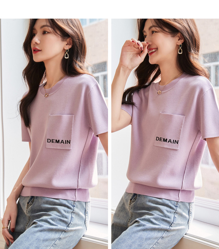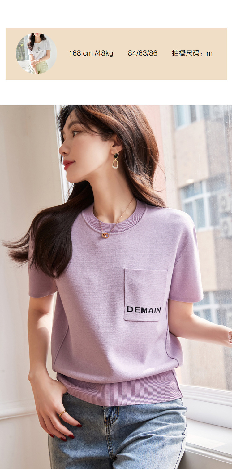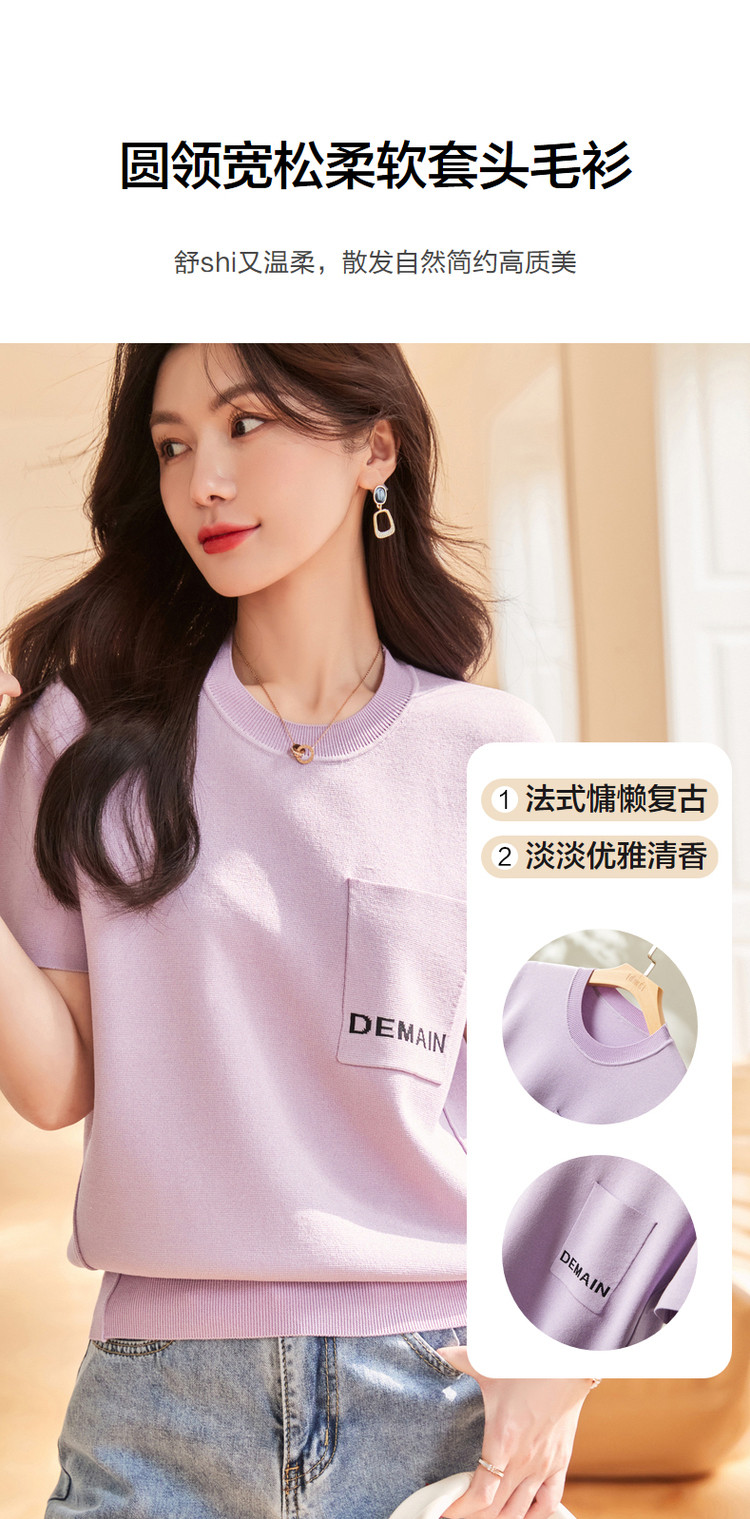 商品名称:【字母针织衫】夏季圆领短袖宽松通勤口袋水洗毛衣女 727105