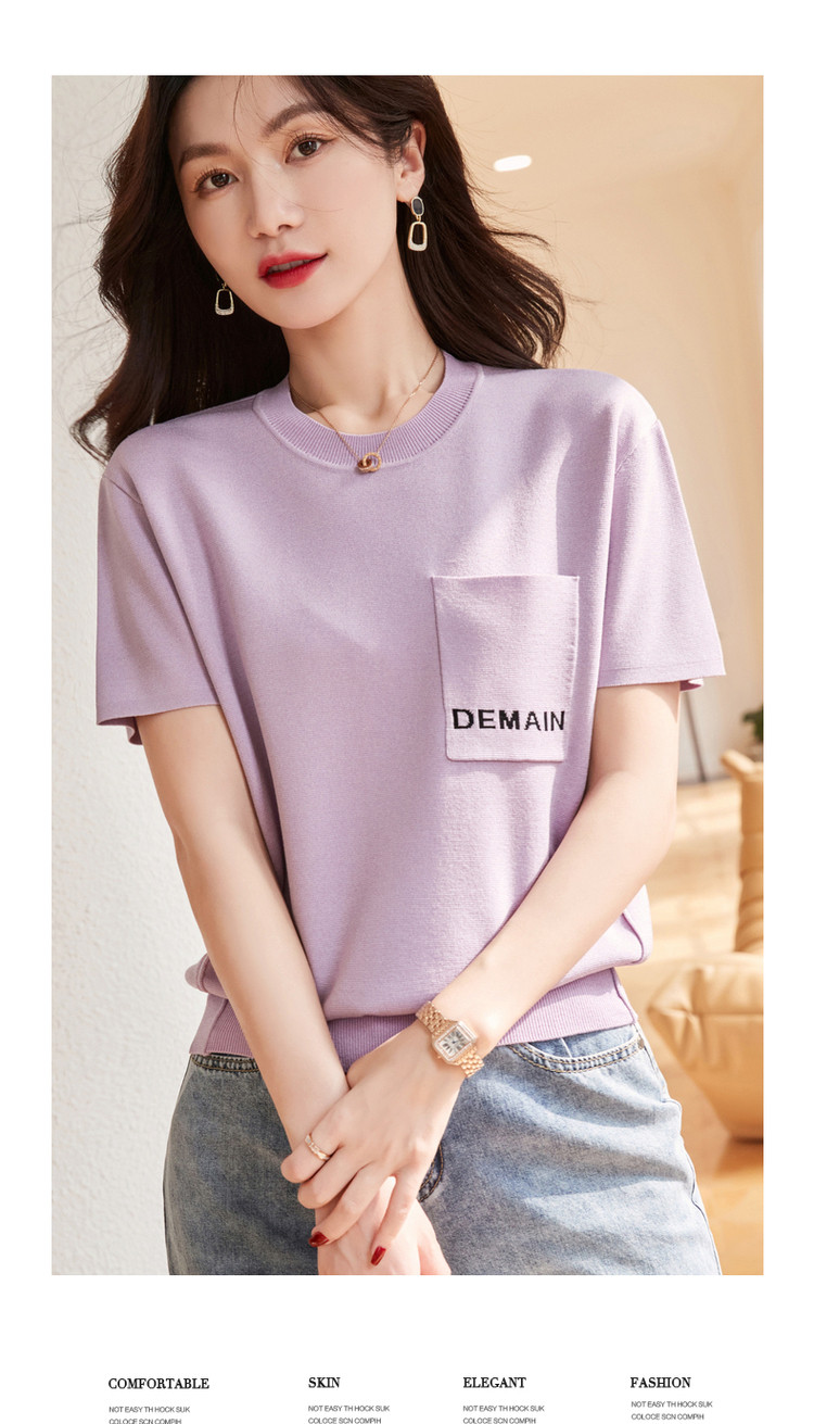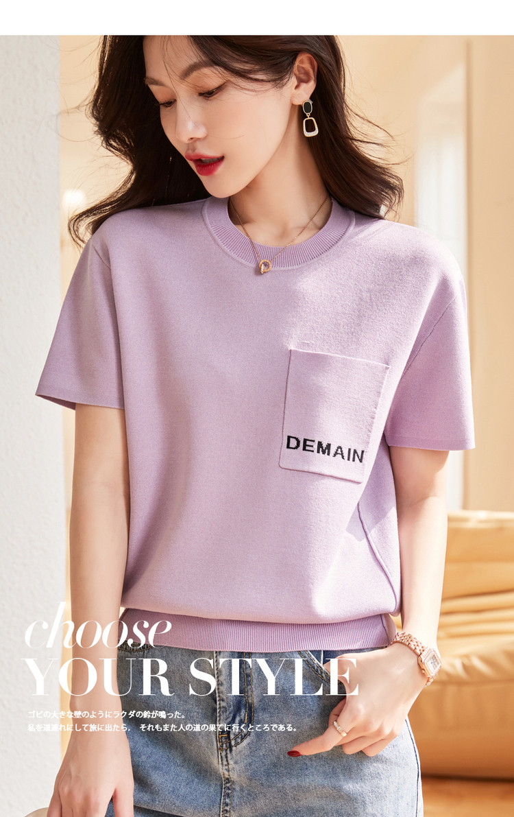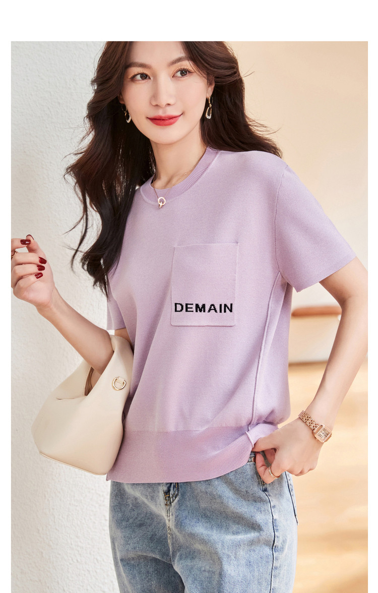 【字母针织衫】夏季圆领短袖宽松通勤口袋水洗毛衣女 727105