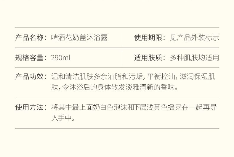 商品名称:韩婵啤酒花奶盖沐浴露290ml