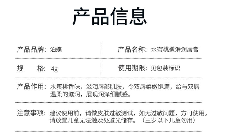 商品名称:泊蝶水蜜桃嫩滑润唇膏4g保湿唇部护理