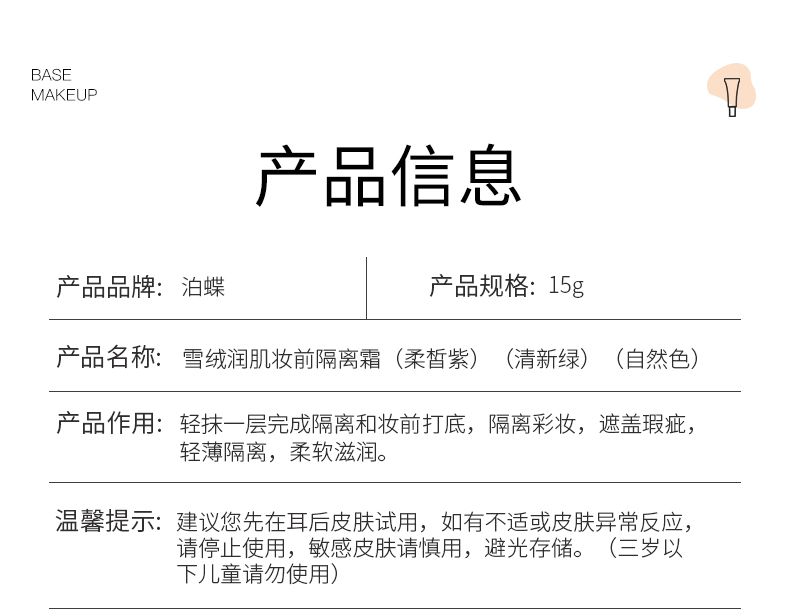 商品名称:泊蝶雪绒润肌妆前隔离霜15g