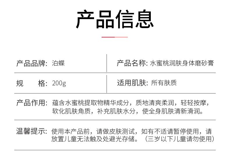商品名称:泊蝶水蜜桃润肤身体磨砂膏200g深层清洁