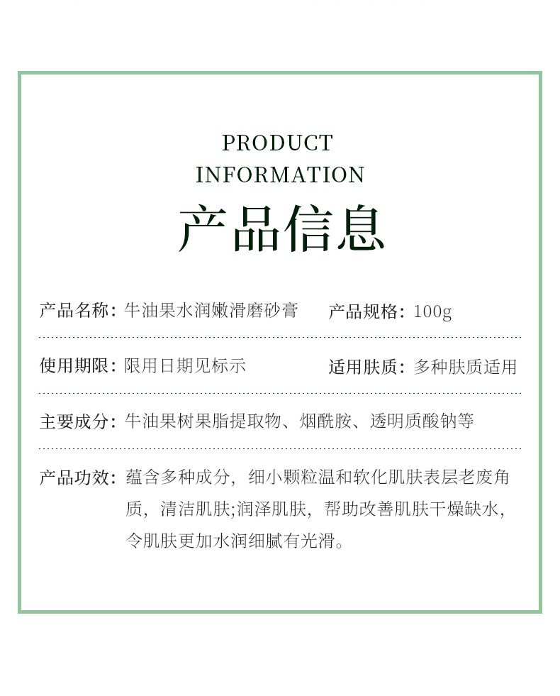 商品名称:泊泉雅牛油果水润嫩滑磨砂膏100g深层清洁保湿