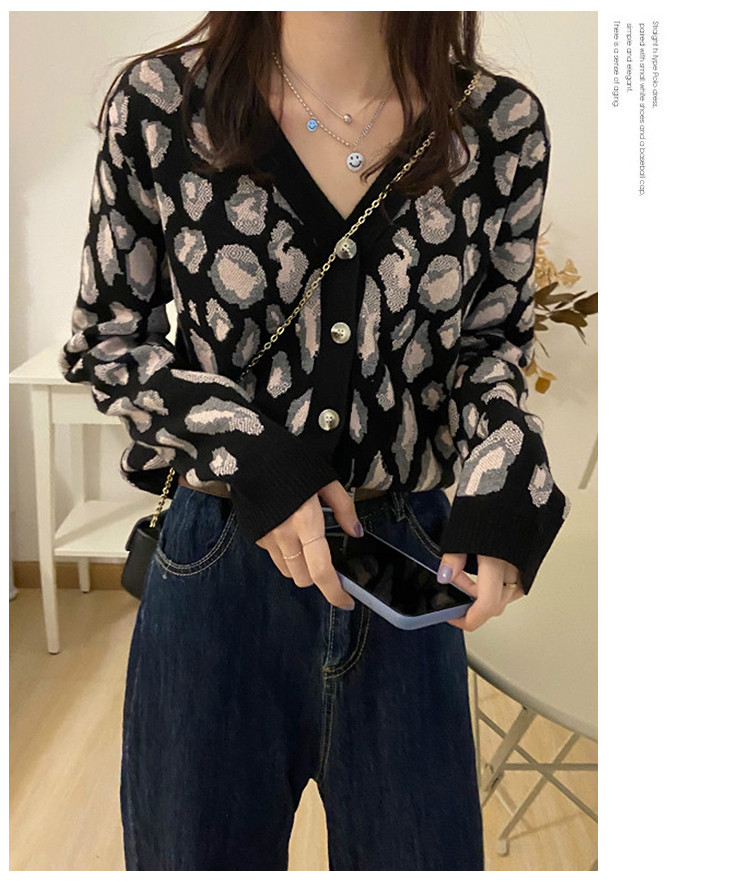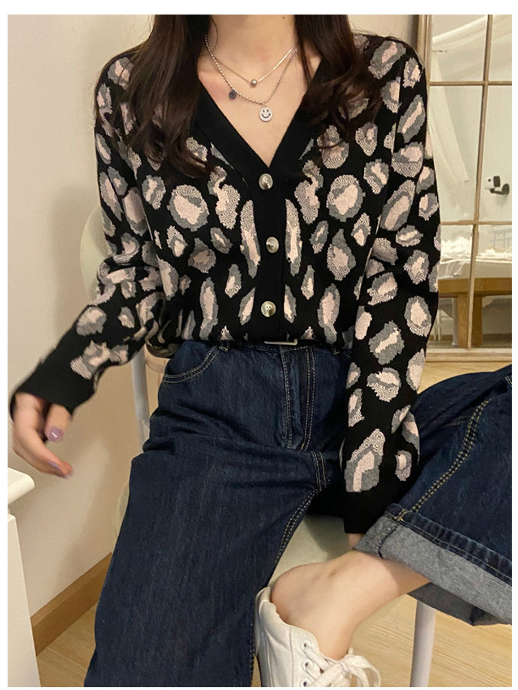 商品名称:V领针织开衫豹纹气质针织衫女休闲百搭显瘦长袖针织衫女 146371