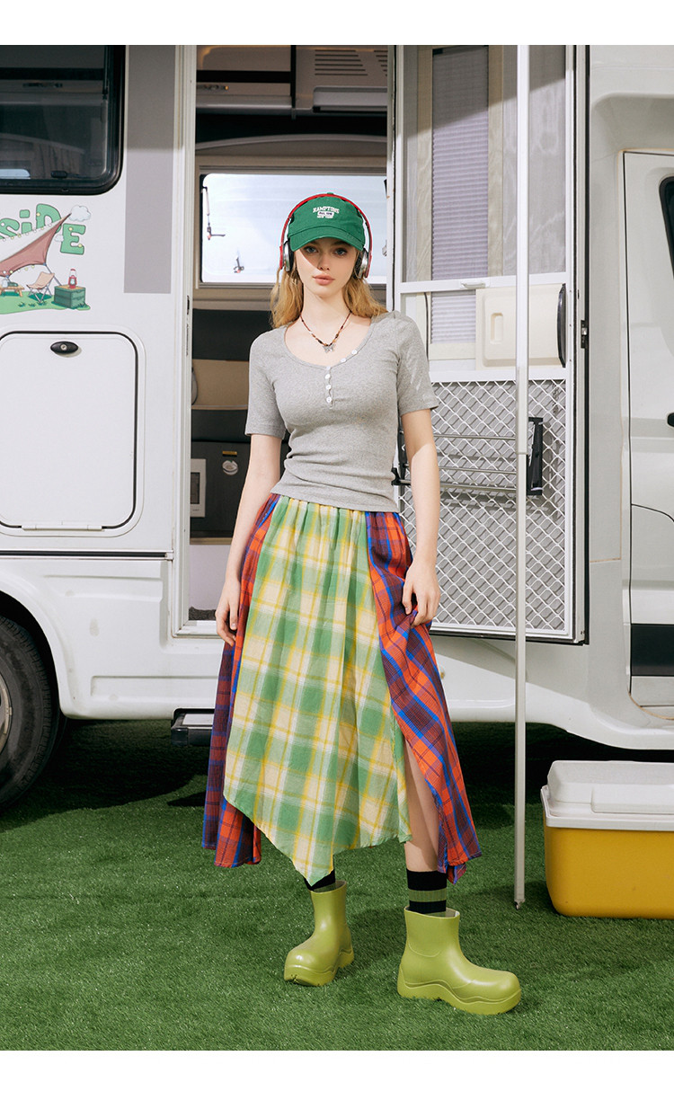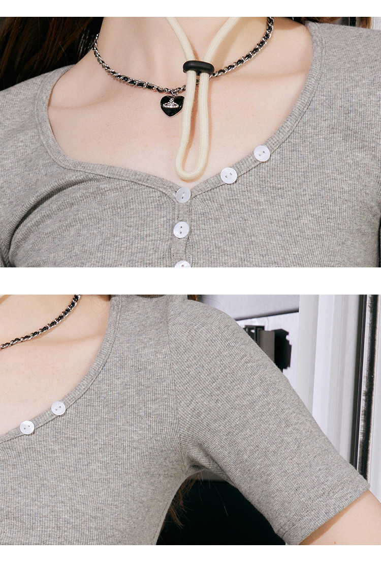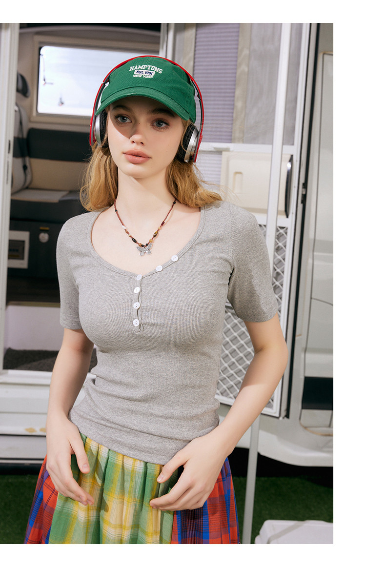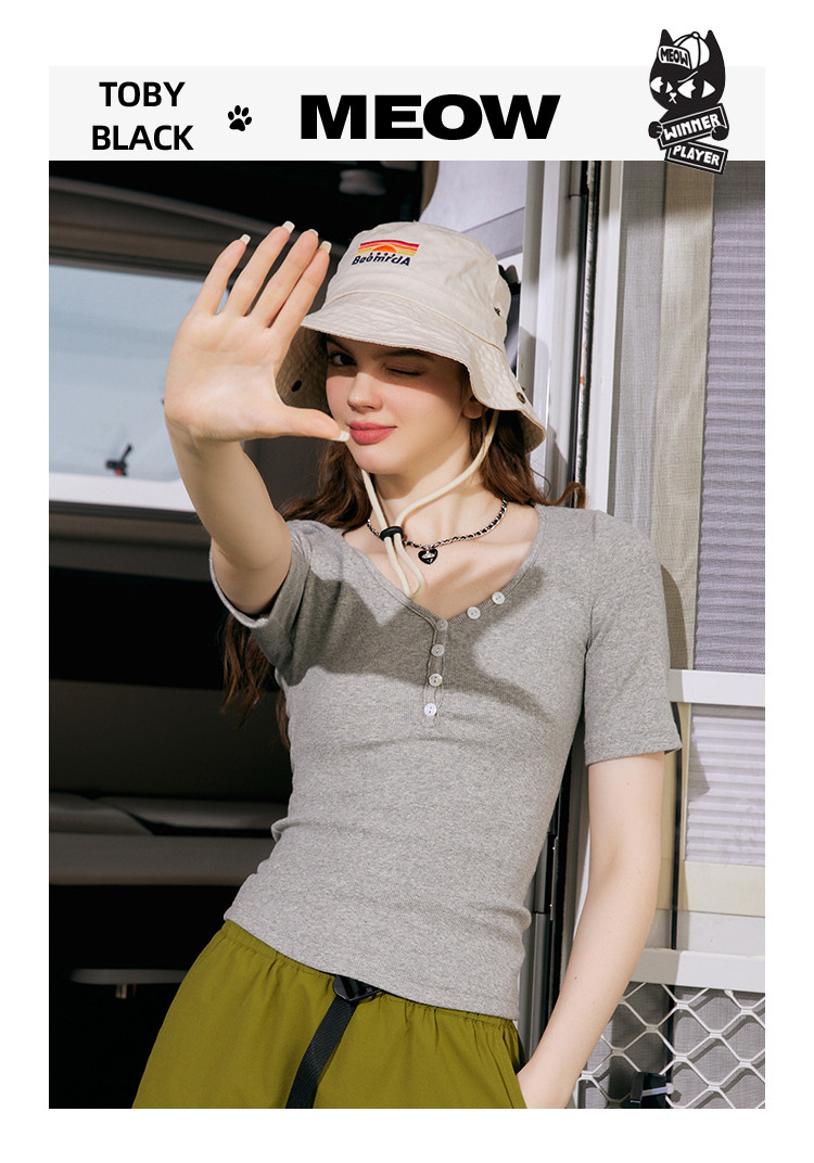 美式复古辣妹针织短袖夏季紧身上衣纽扣V领女式T恤 153437