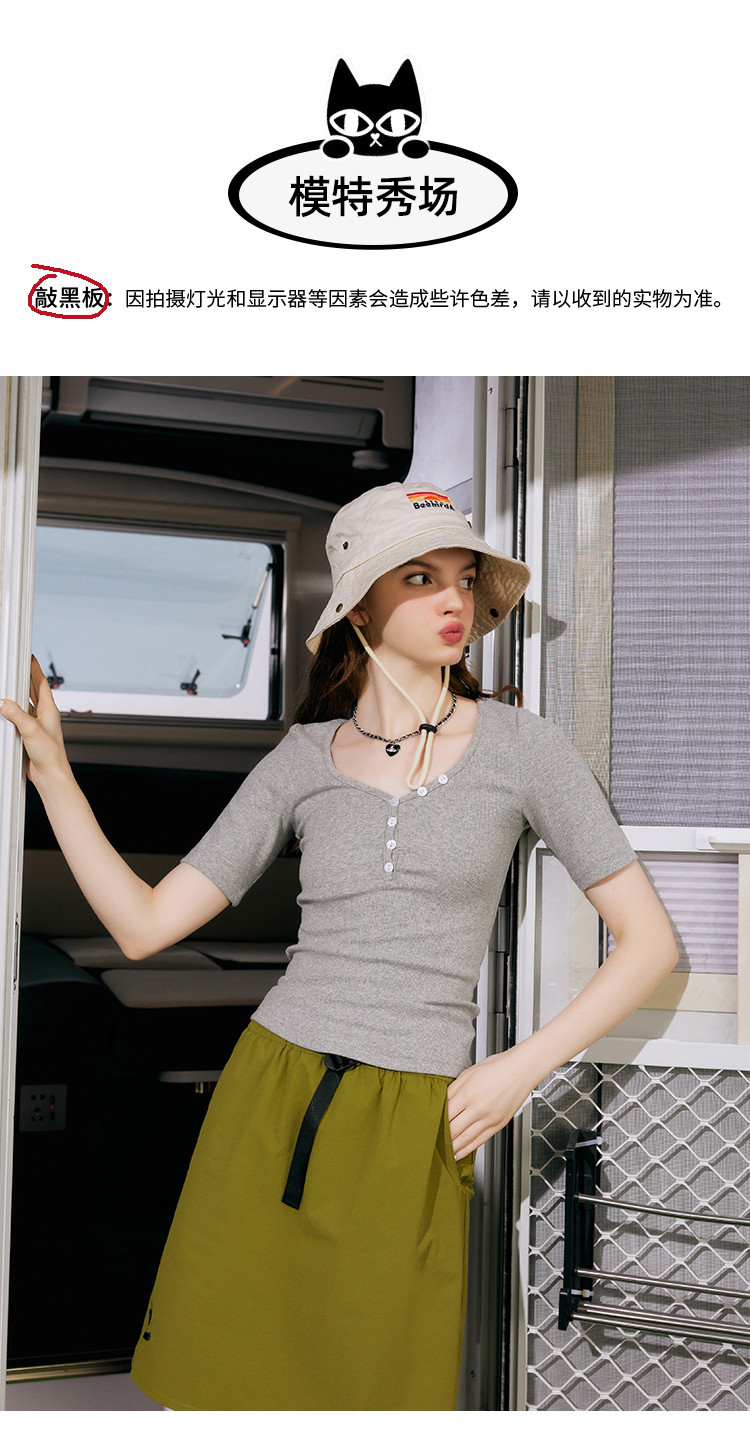 商品名称:美式复古辣妹针织短袖夏季紧身上衣纽扣V领女式T恤 153437