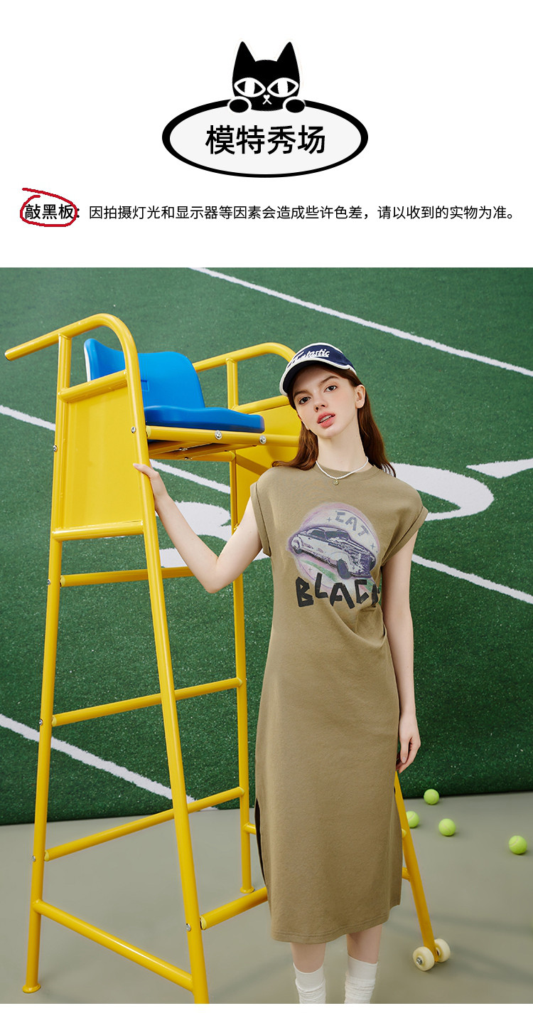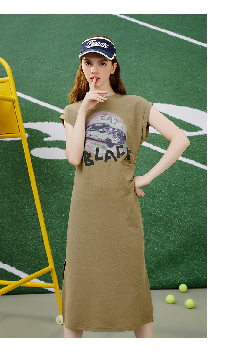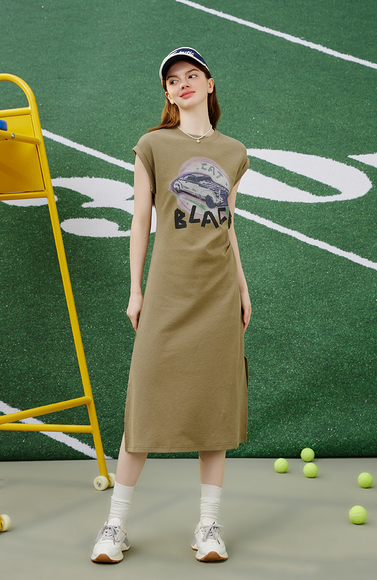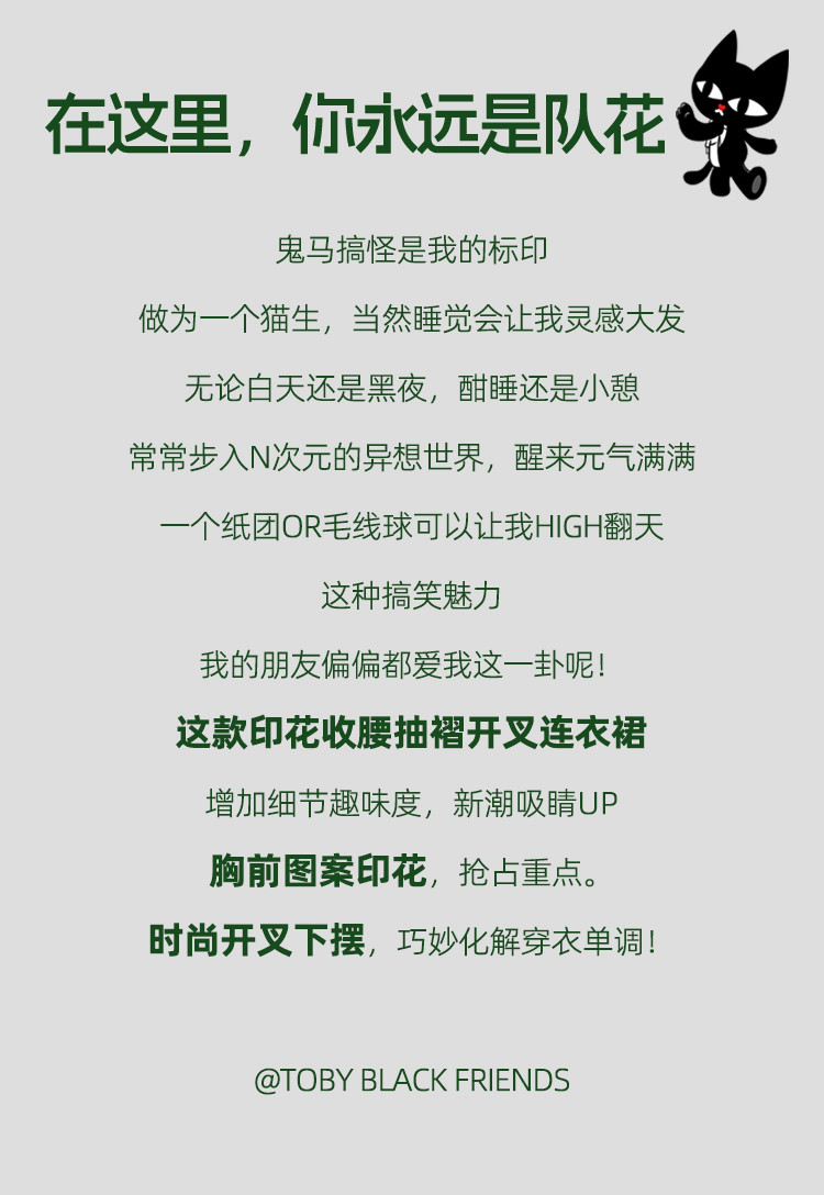 印花收腰抽褶设计个性开叉裙夏季休闲无袖长款连衣裙 100189