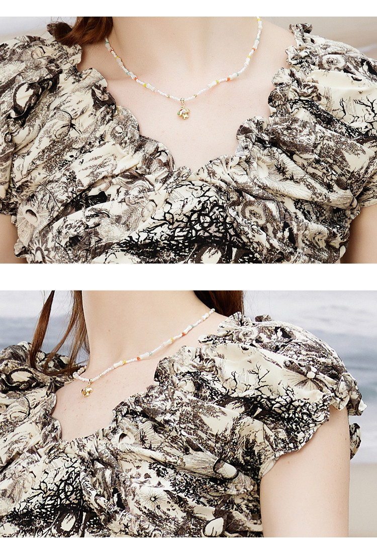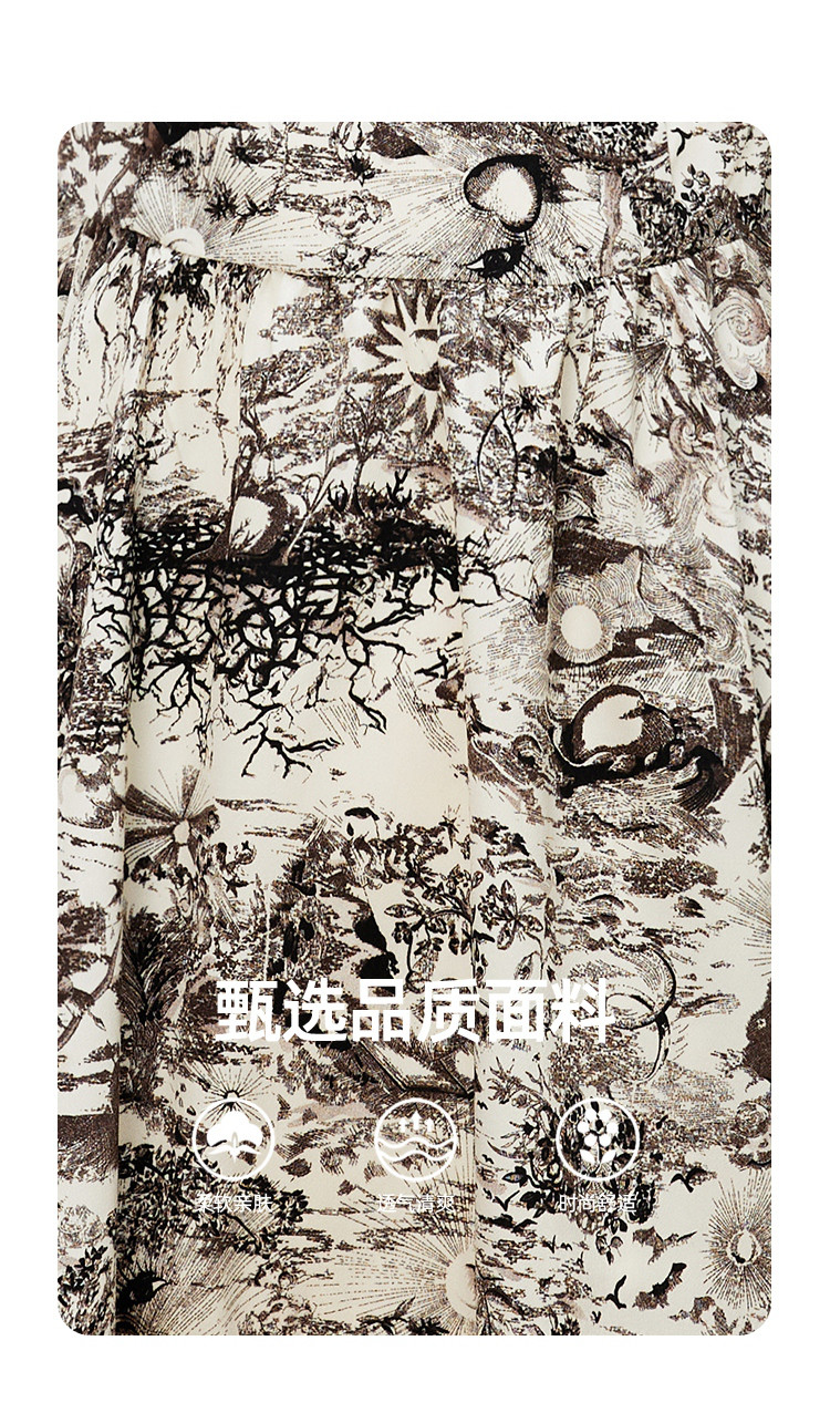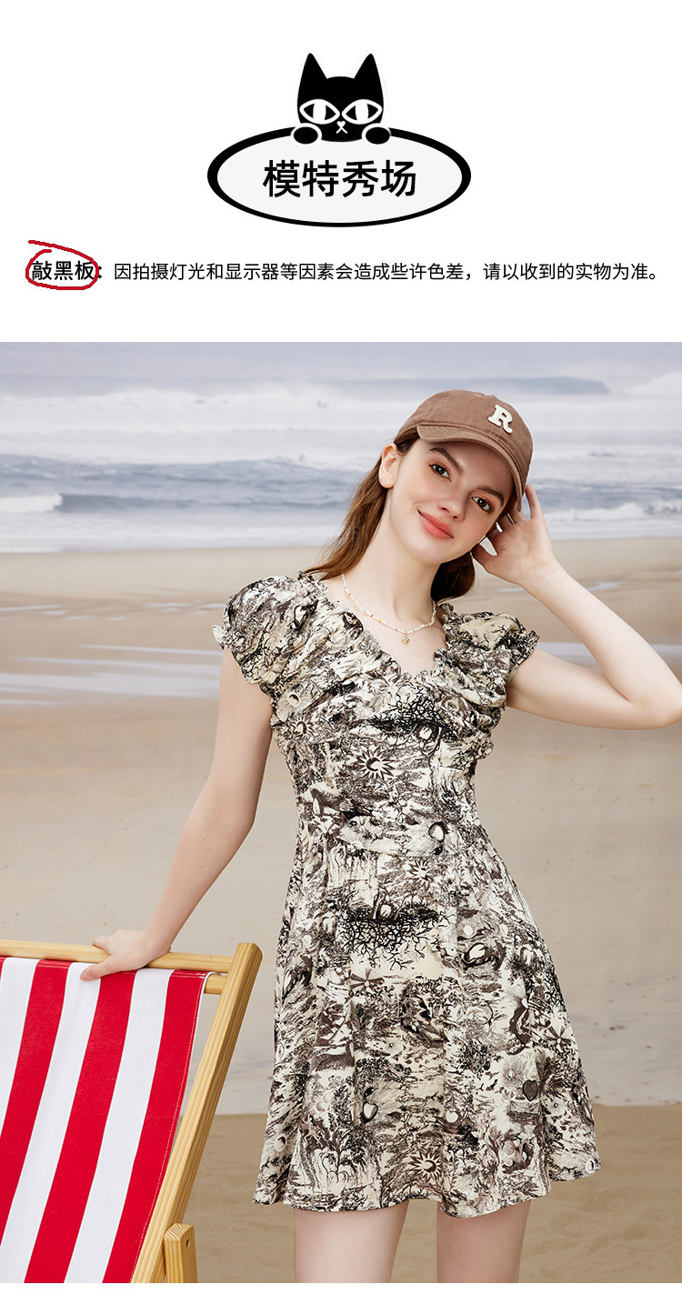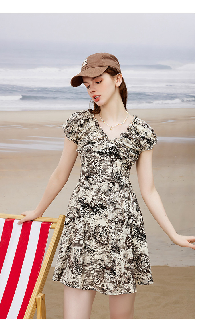 V领修身抽褶复古异域碎图案设计夏季气质碎花连衣裙 864221