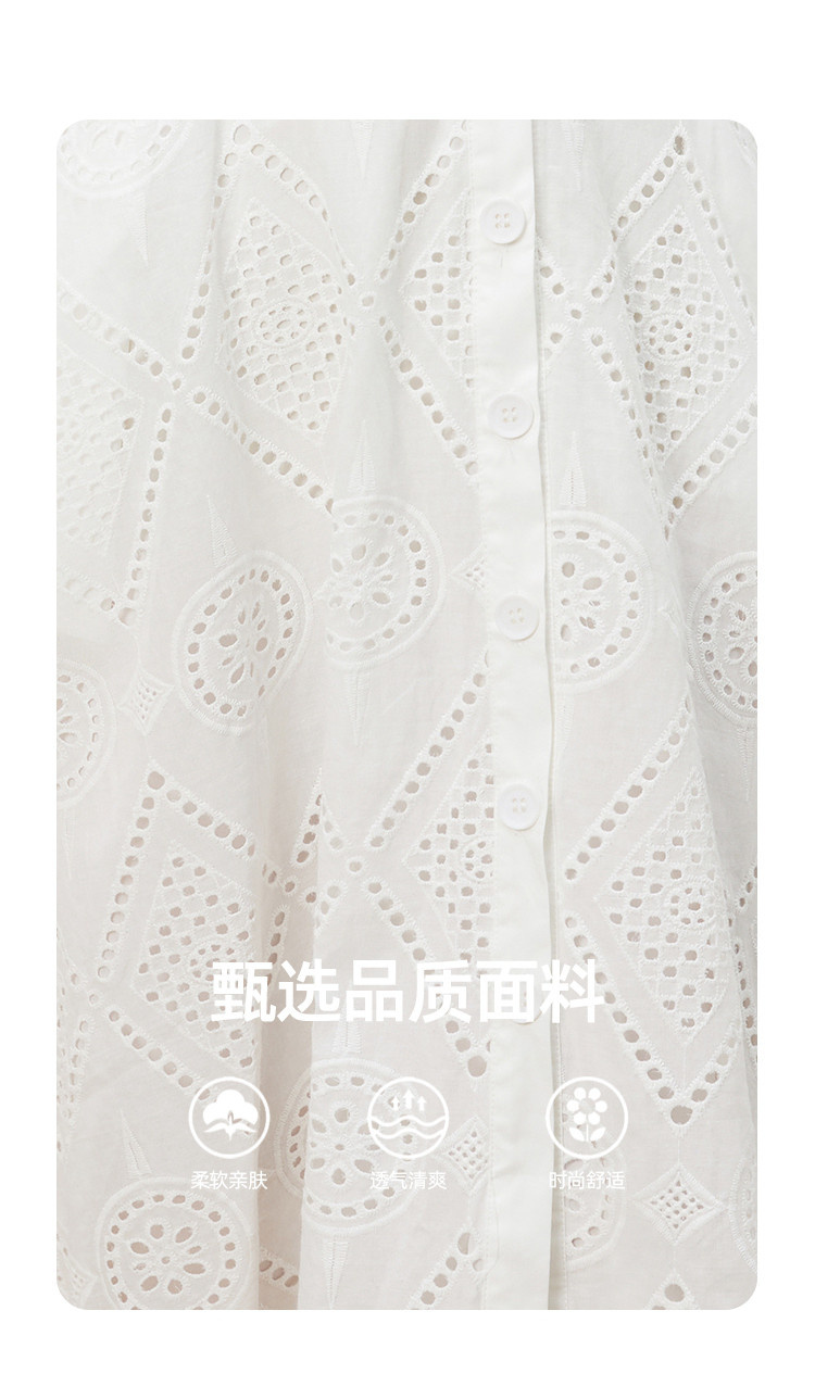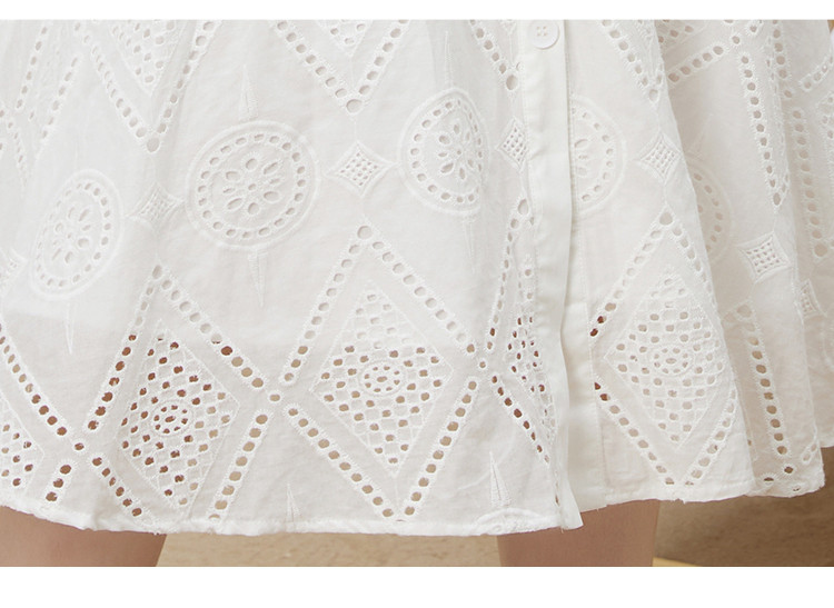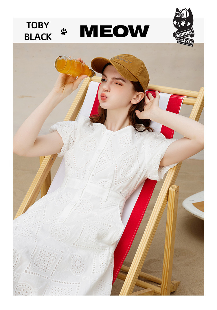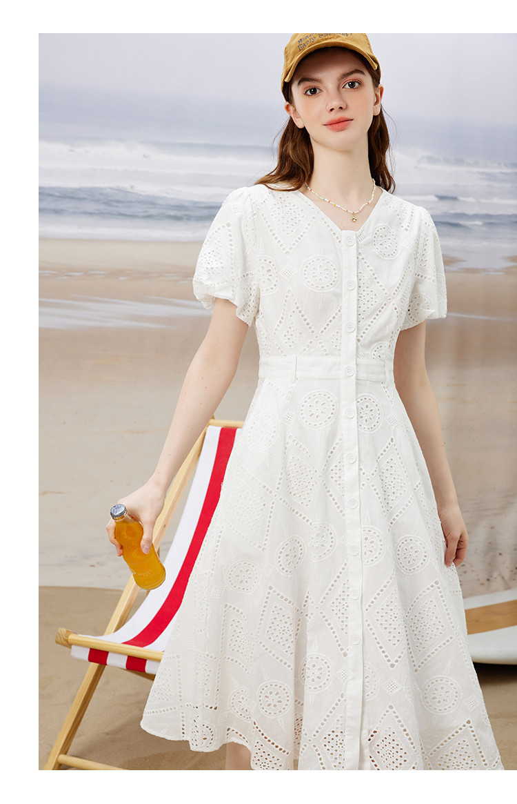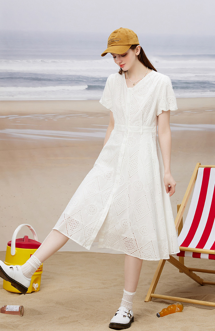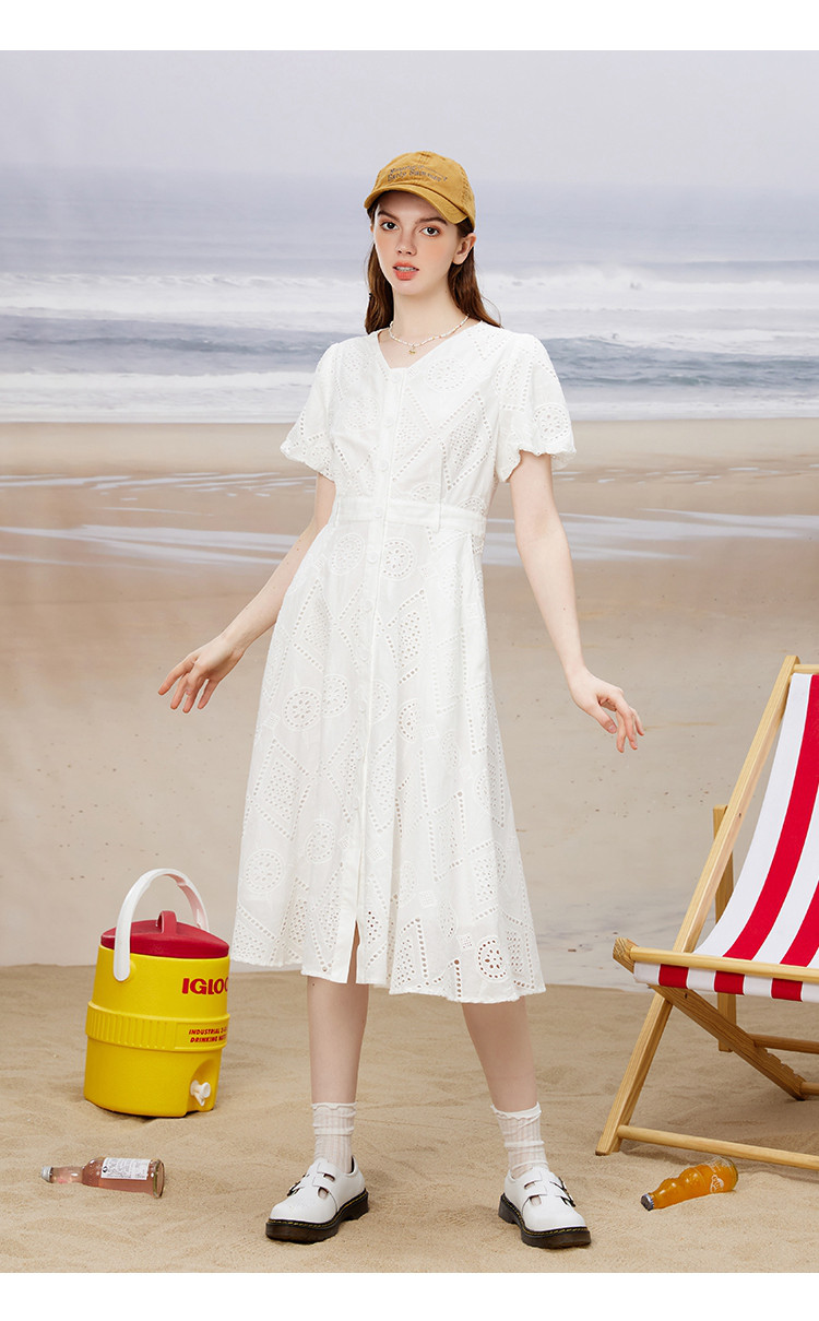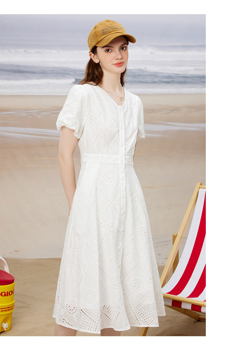 商品名称:镂空花纹设计收腰连衣裙夏季纯色简约气质中长裙 030557