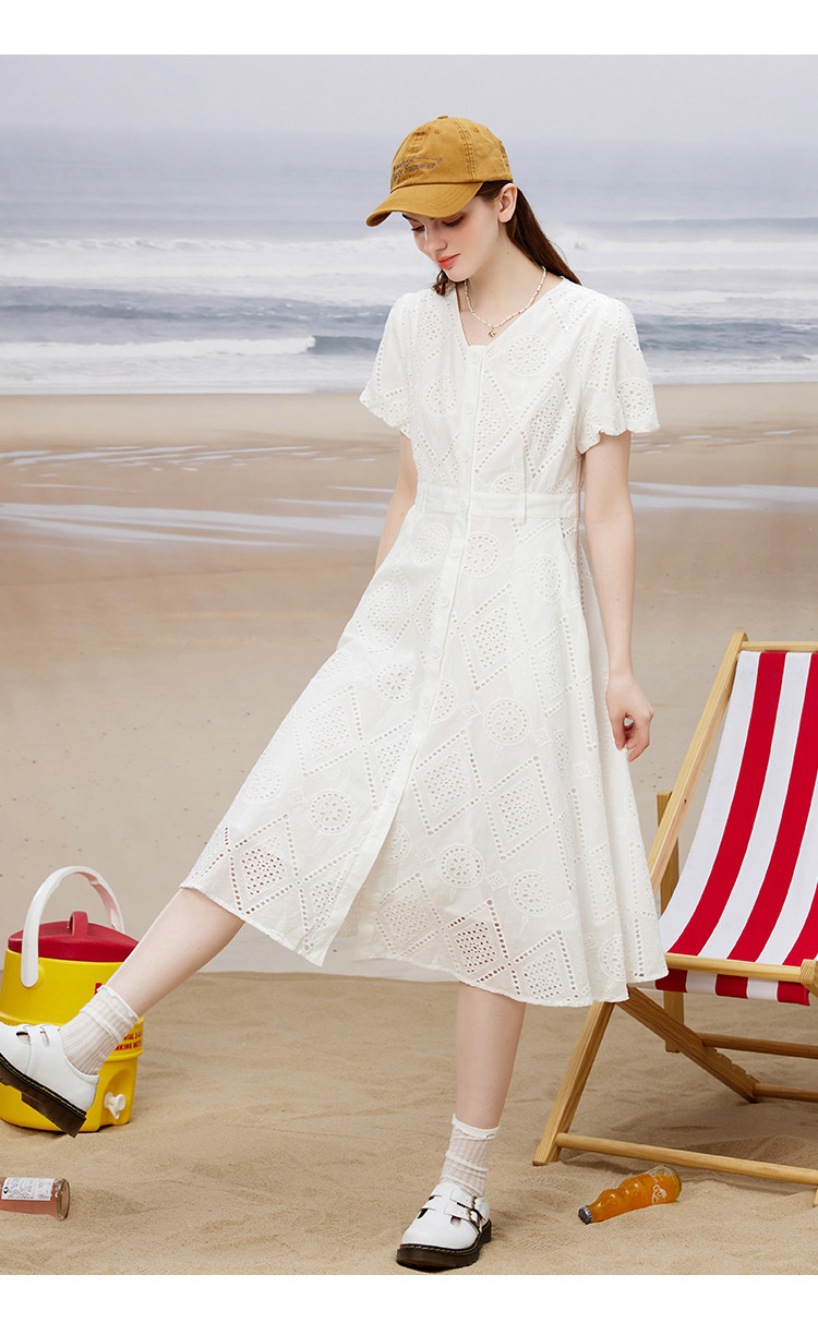 镂空花纹设计收腰连衣裙夏季纯色简约气质中长裙 030557