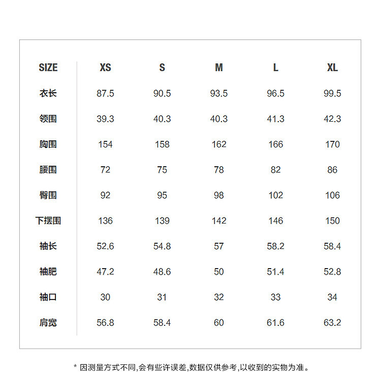 | 尺码 | 裙长(cm) | 肩宽(cm) | 腰围(cm) | 臀围(cm) | 袖长(cm) | 胸围(cm) | 下摆围(cm) | 号型 |