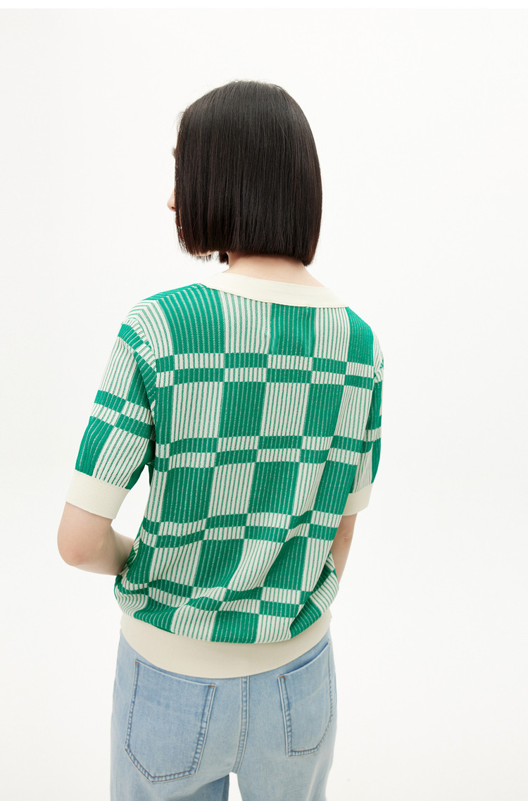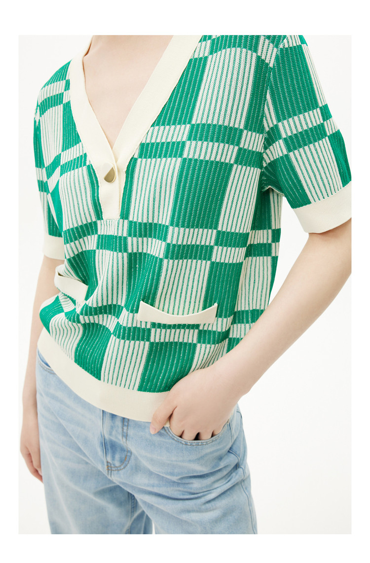【薄荷曼波】春季复古棋盘格V领显瘦短款短袖毛针织衫 665307