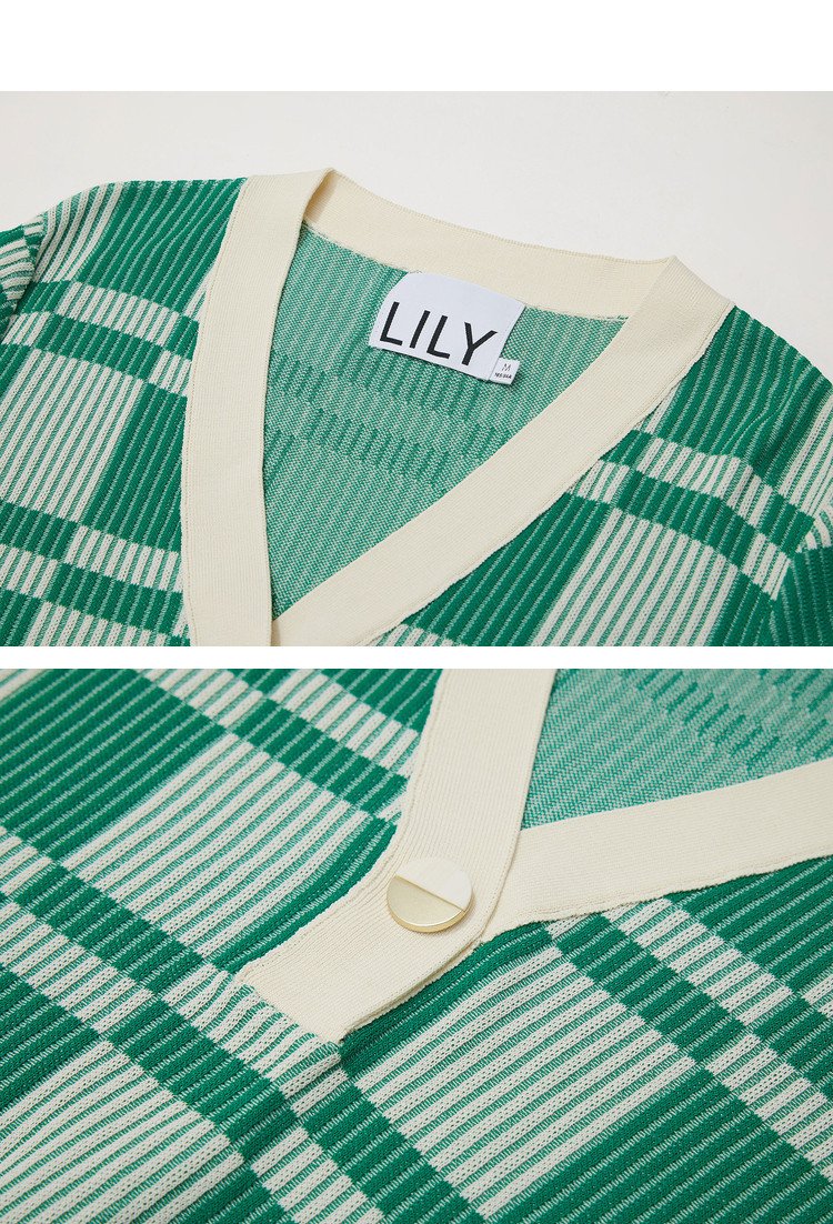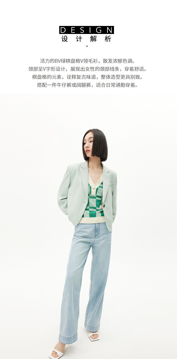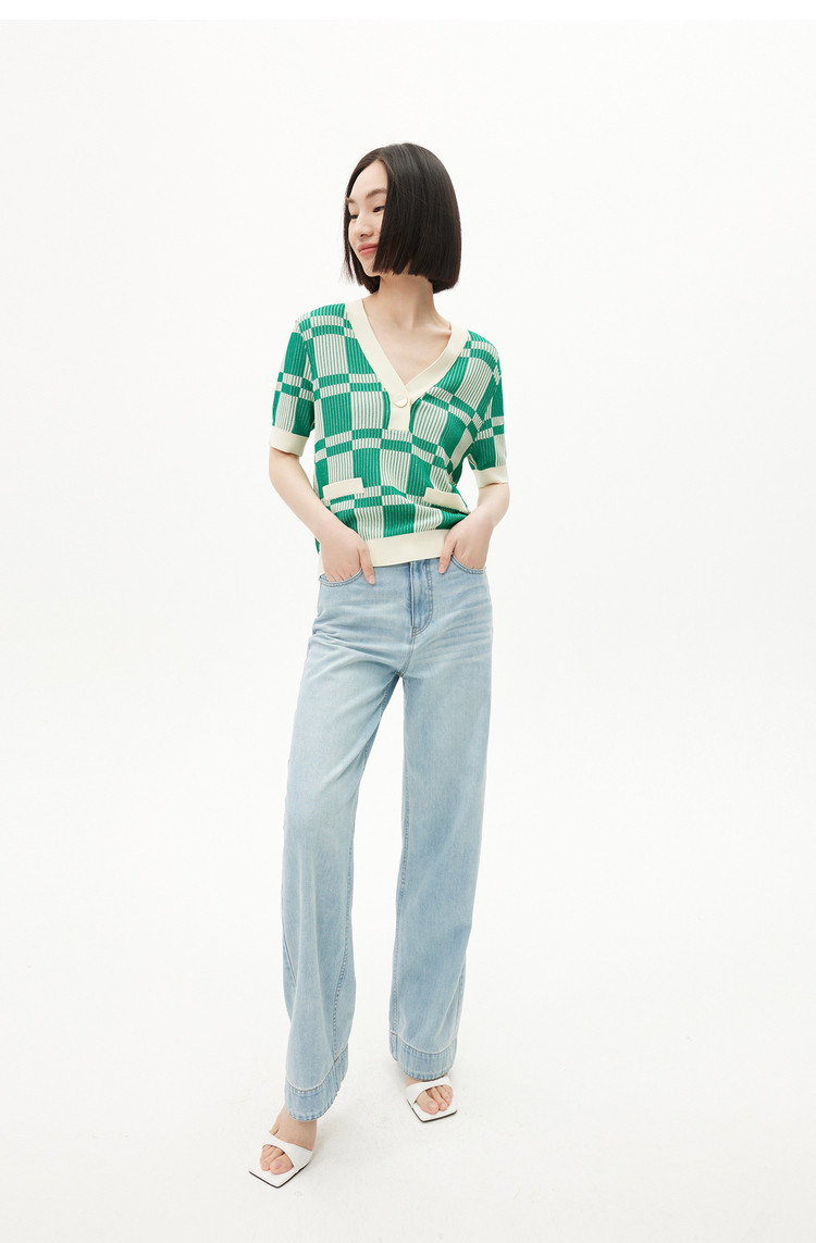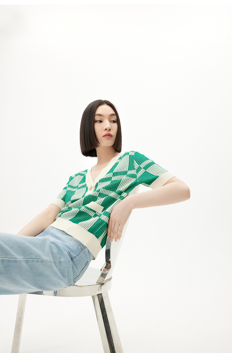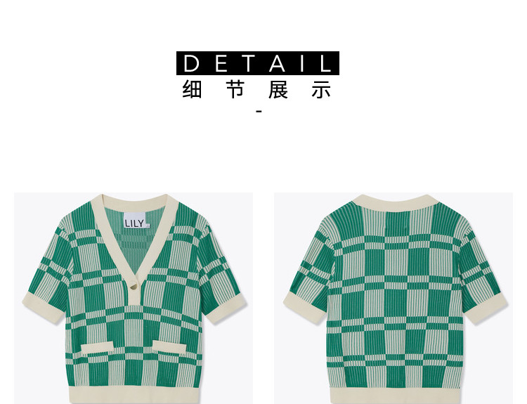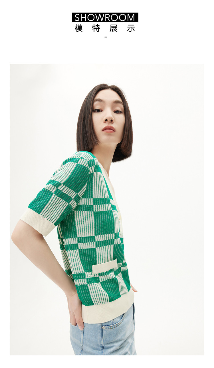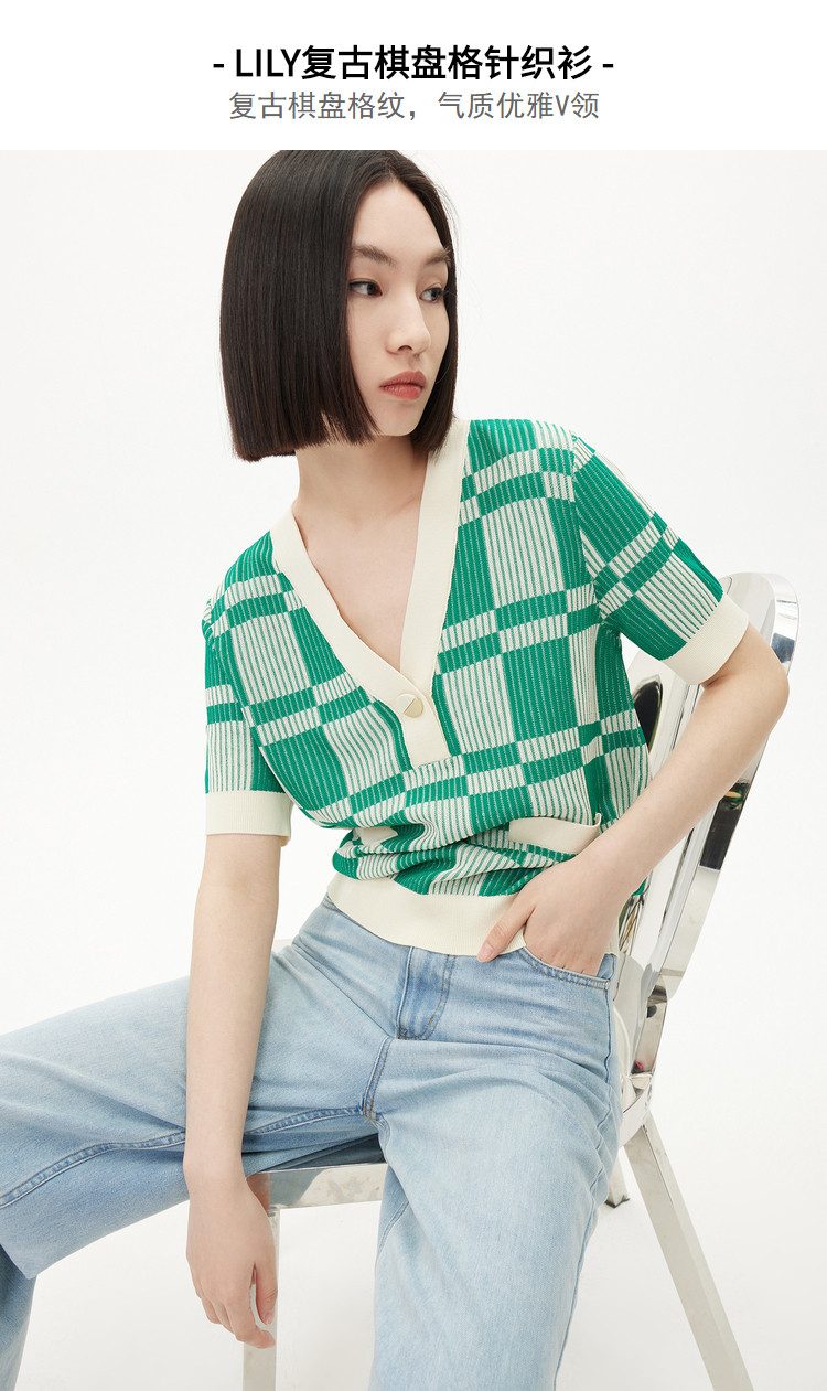 商品名称:【薄荷曼波】春季复古棋盘格V领显瘦短款短袖毛针织衫 665307