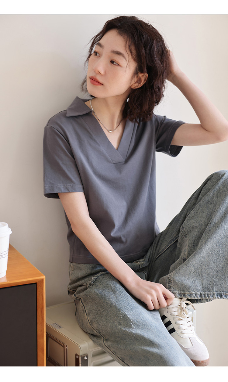 【翻领深V】夏款休闲时尚截断式深V短袖T恤女 964610