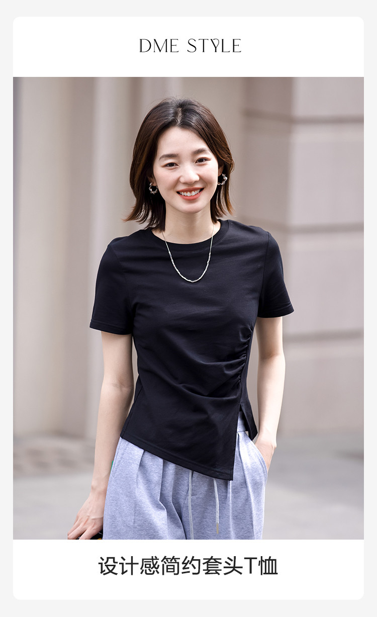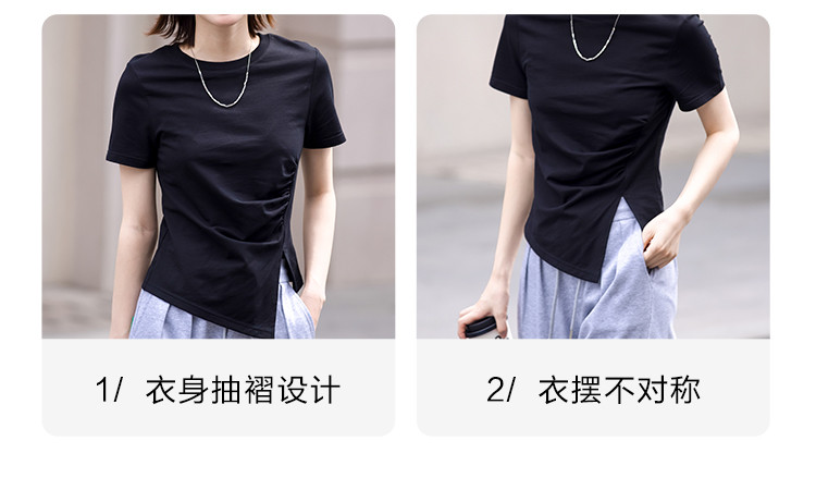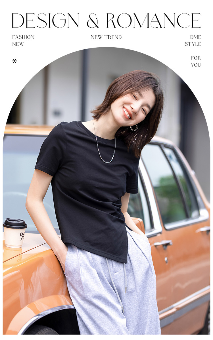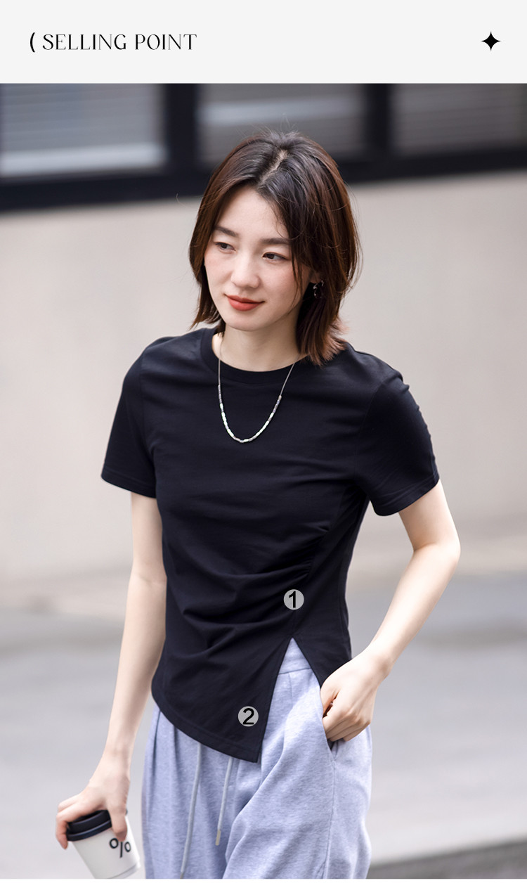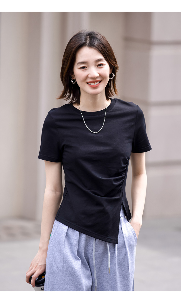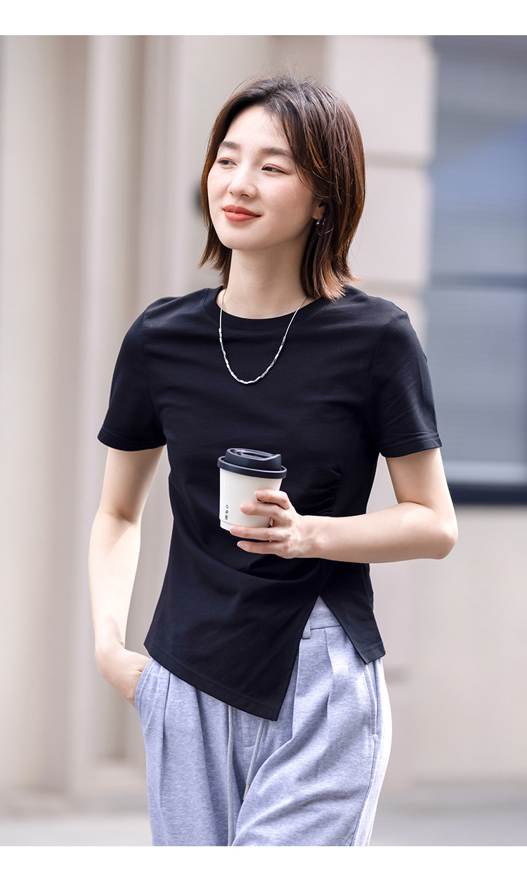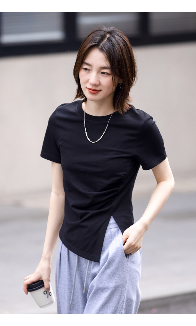 商品名称:【侧摆开叉】夏款下摆侧边开叉收腰圆领短袖T恤女 128450