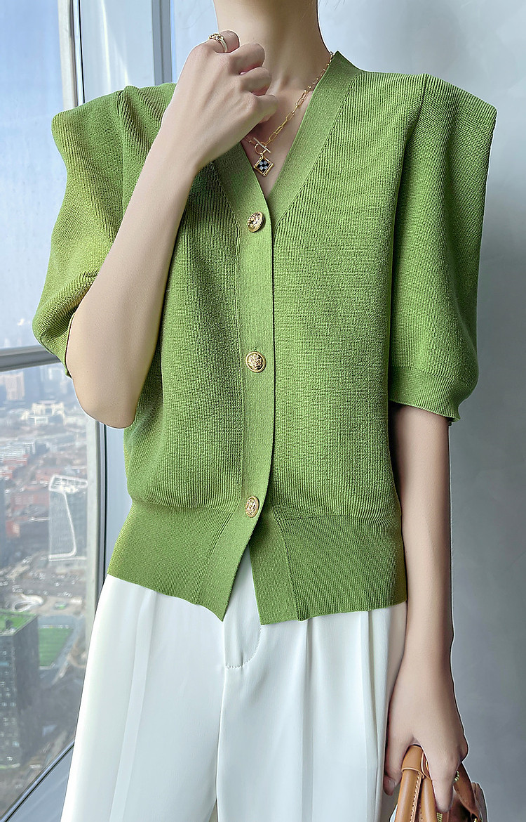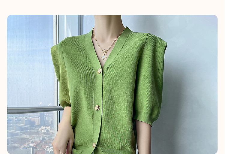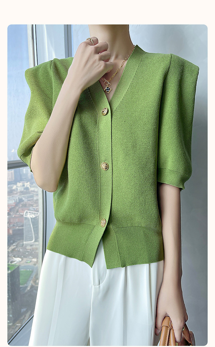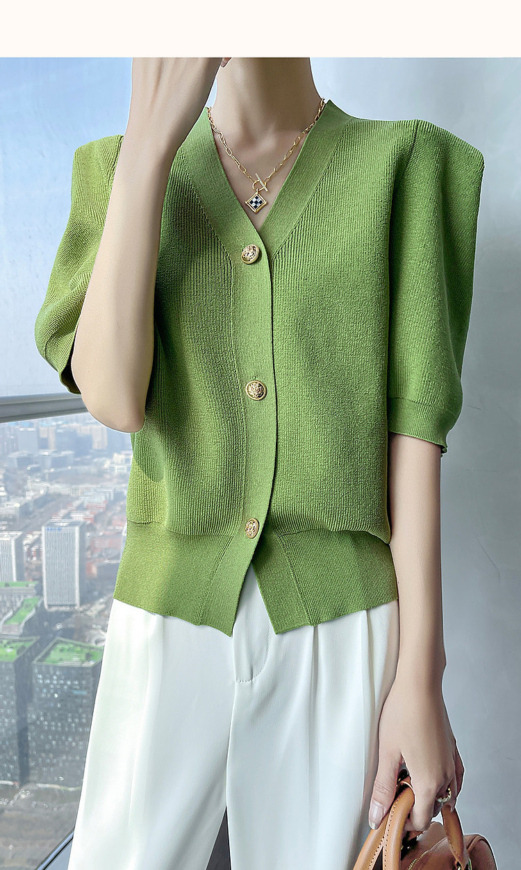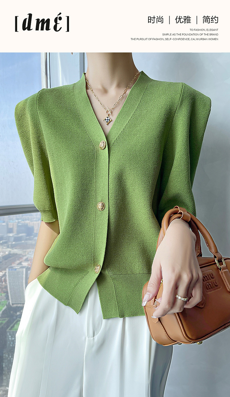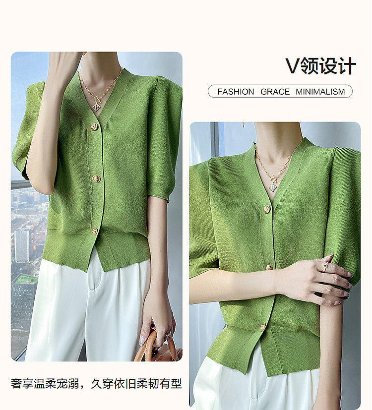 商品名称:【小云朵爽肤质感】春秋简约V领五分袖开衫爽滑冰麻针织衫女上衣 022657