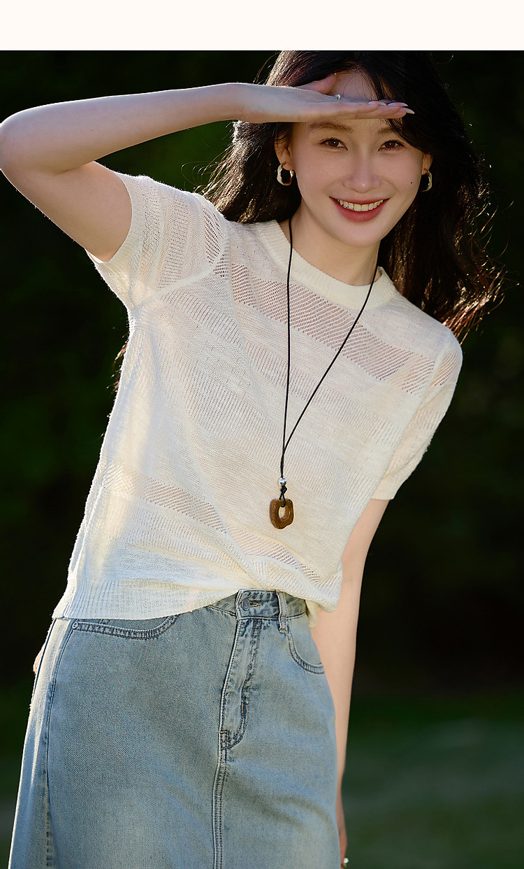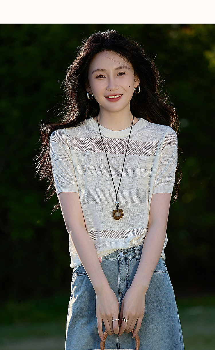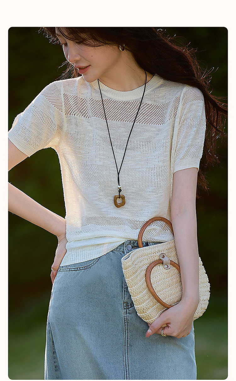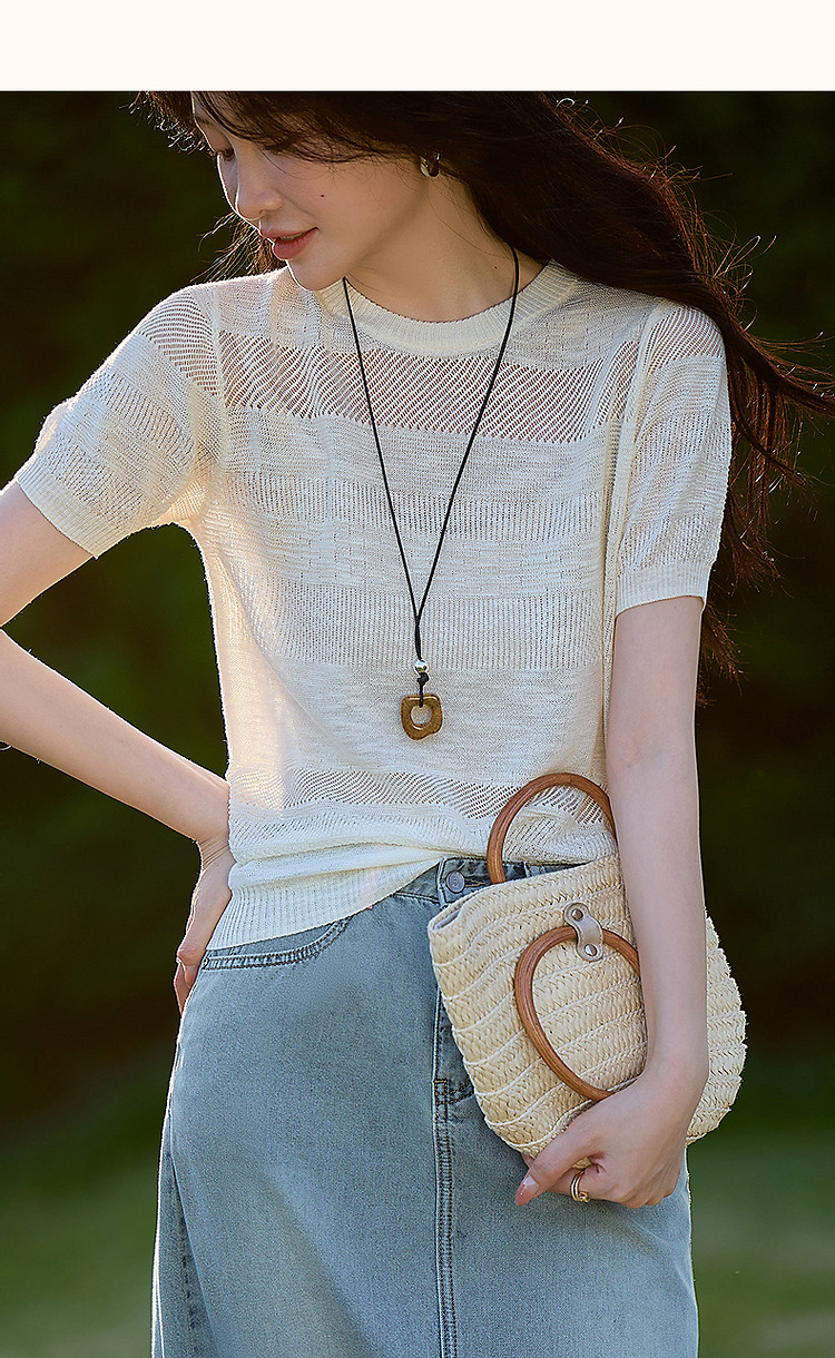 【法风浮雕肌理】夏优雅不重样圆领线衫局部镂空质感针织衫女上衣 441345