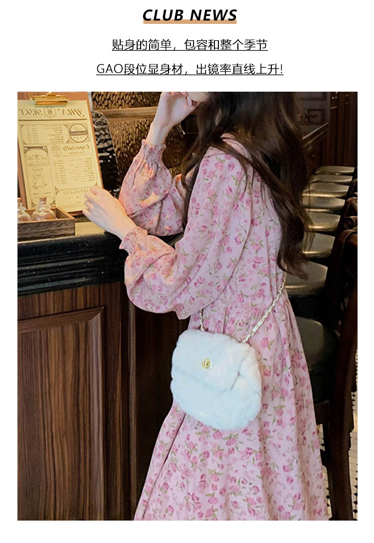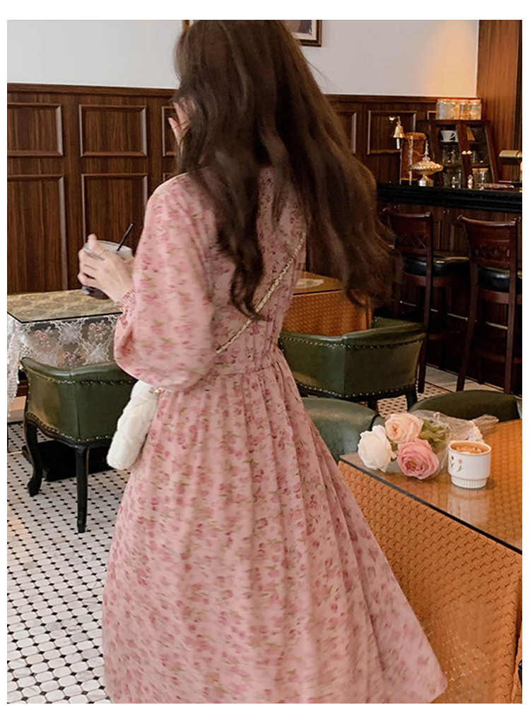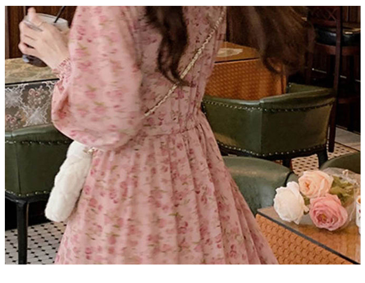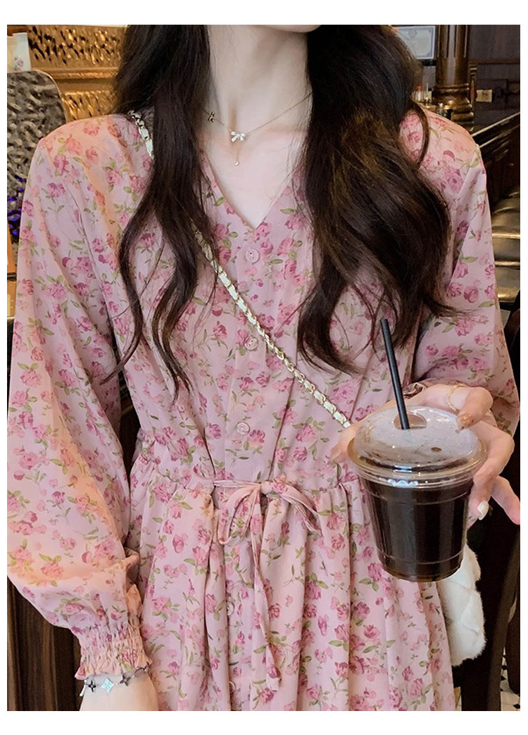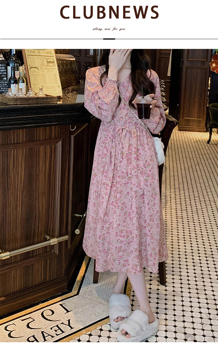 商品名称:甜美裙子气质温柔风高腰长袖A字裙女碎花连衣裙 007491