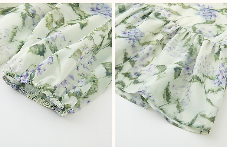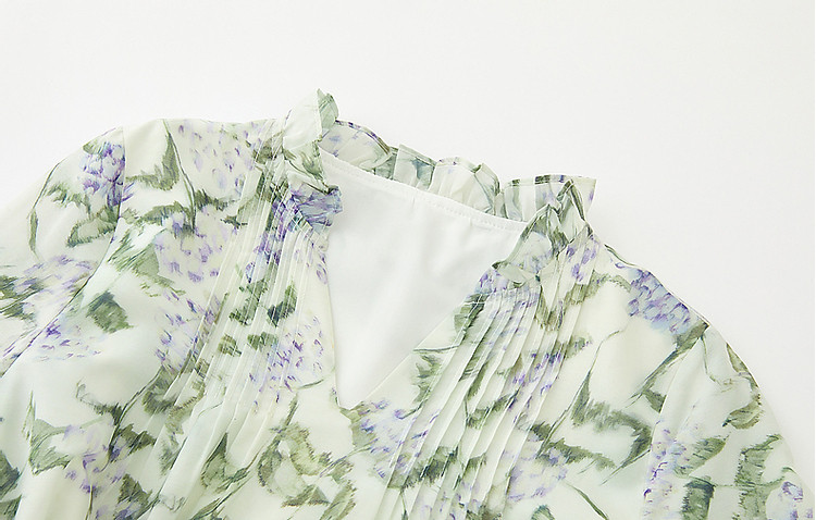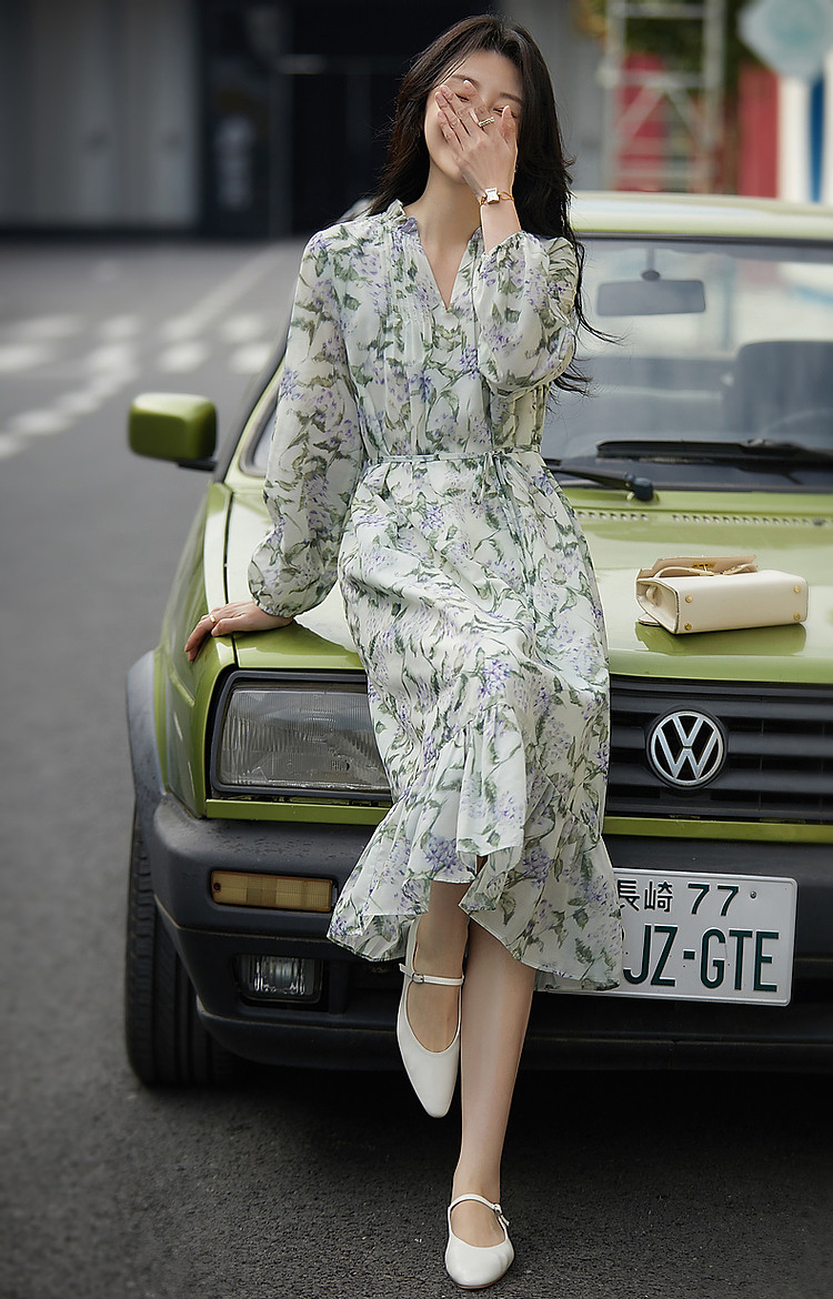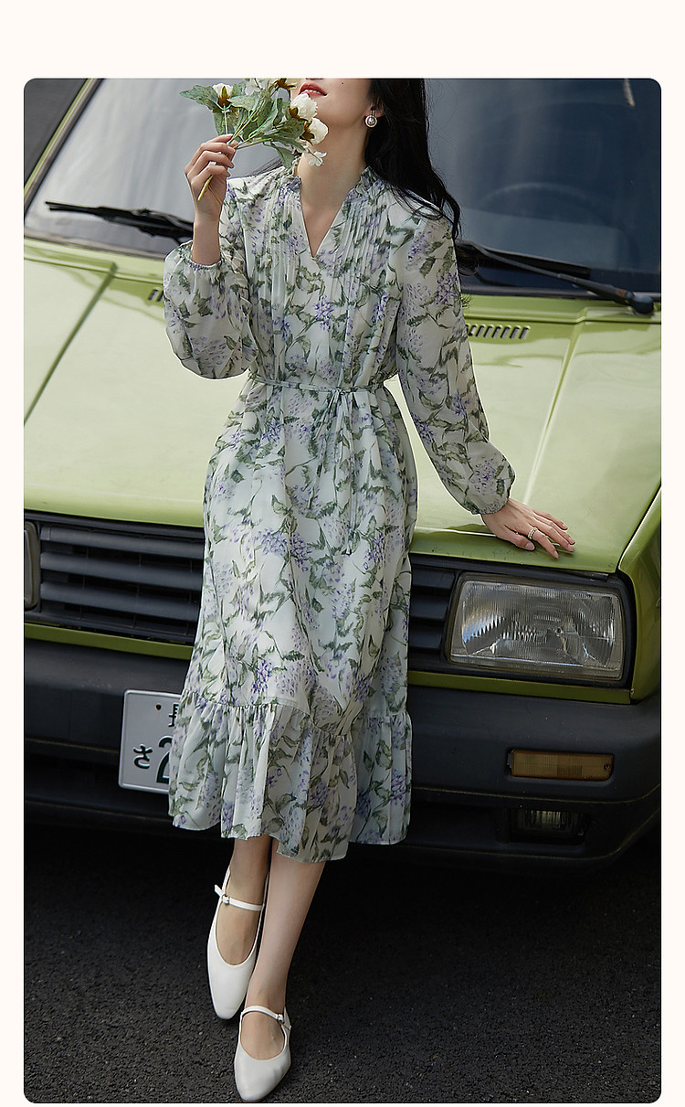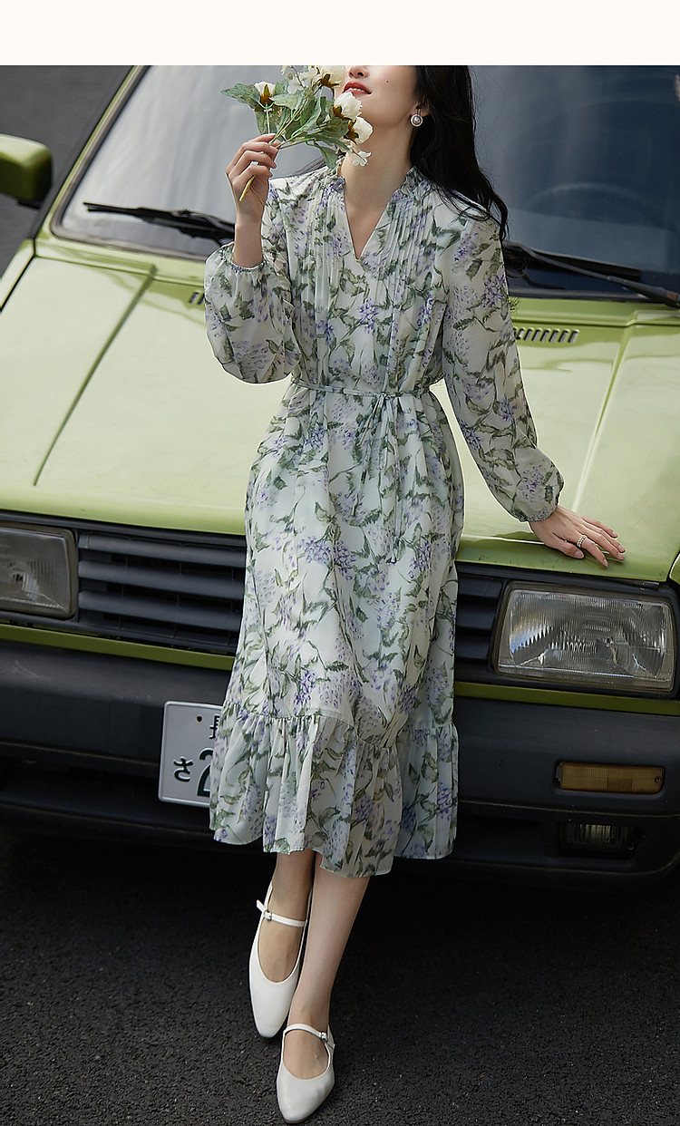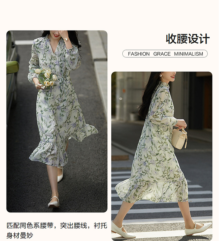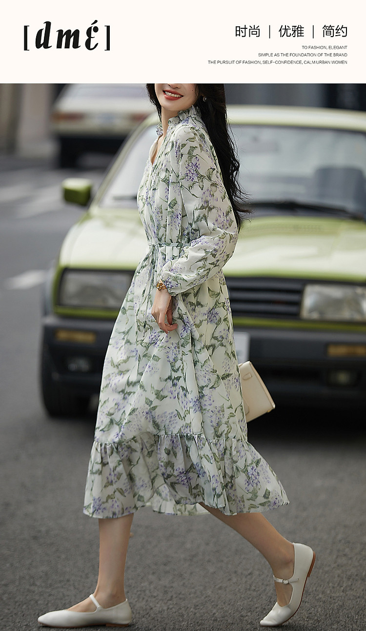 【仿丝棉印花茶歇裙】春秋V领木耳边腰带长袖女裙子连衣裙女长款 776257