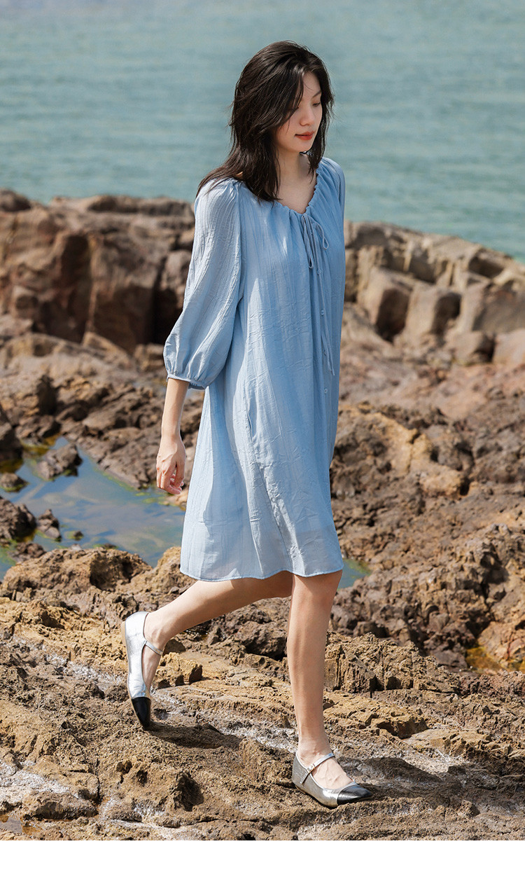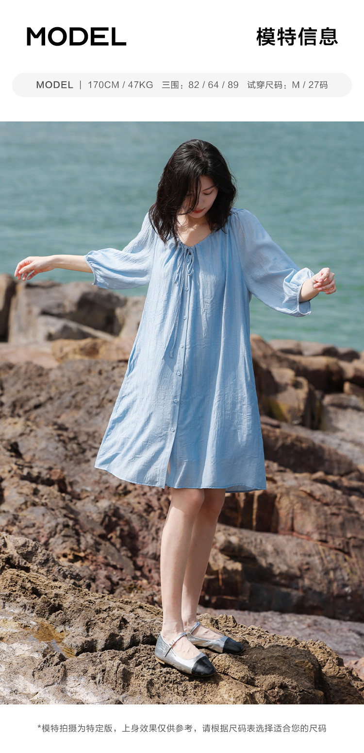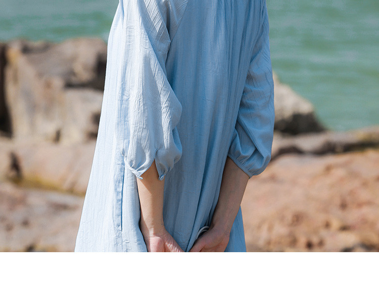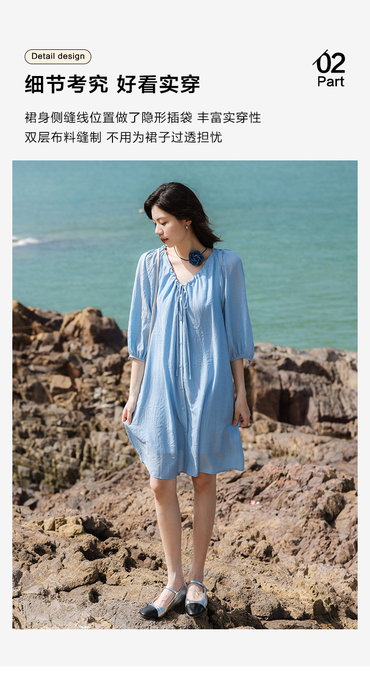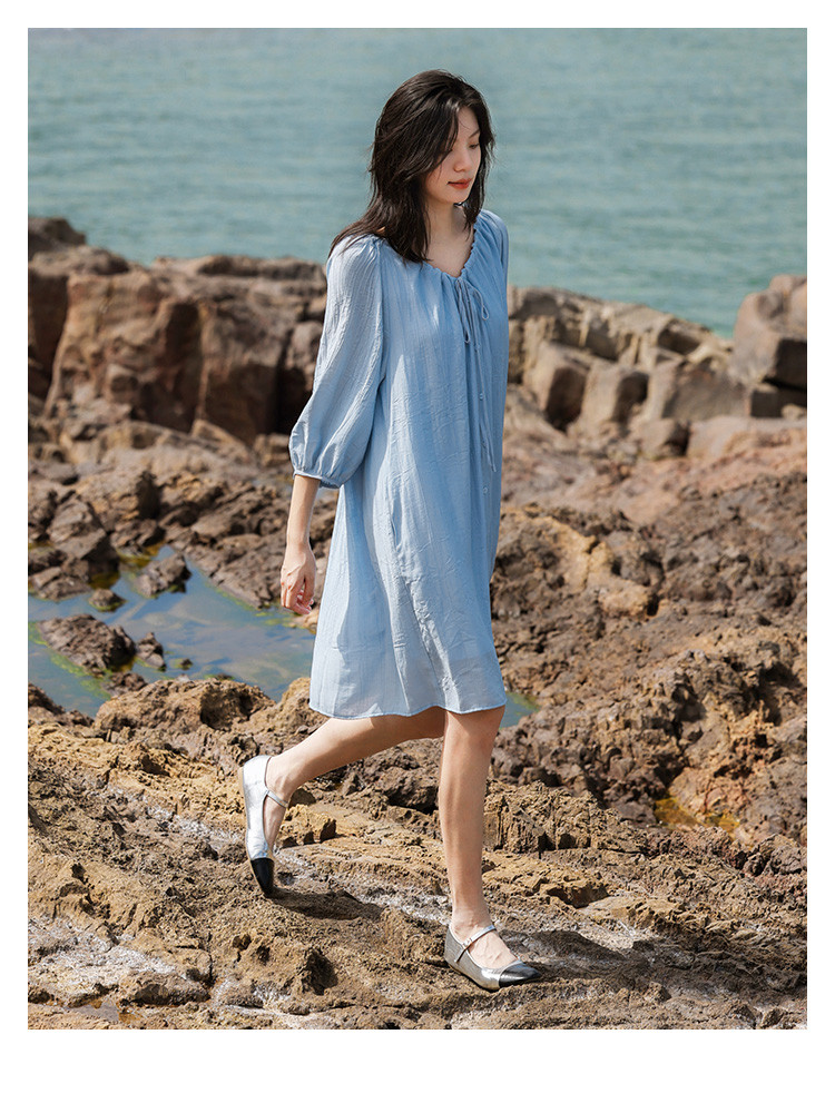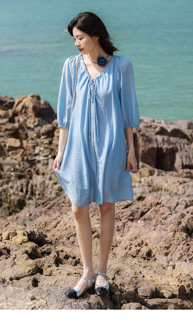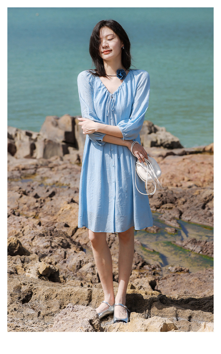 商品名称:【休闲度假风连衣裙】夏款治愈冰川蓝中袖设计露锁骨长裙 560130