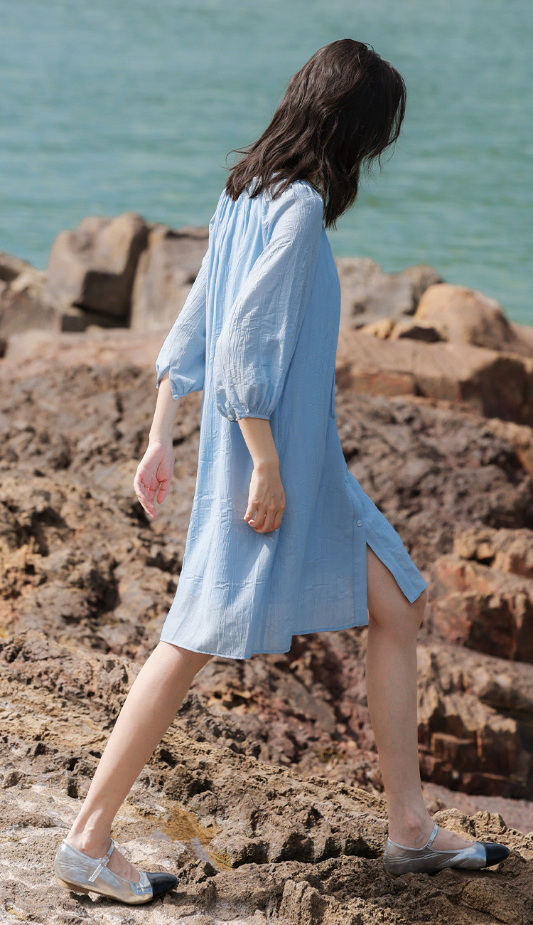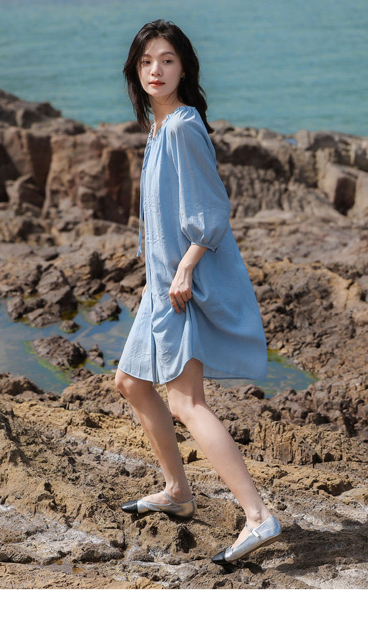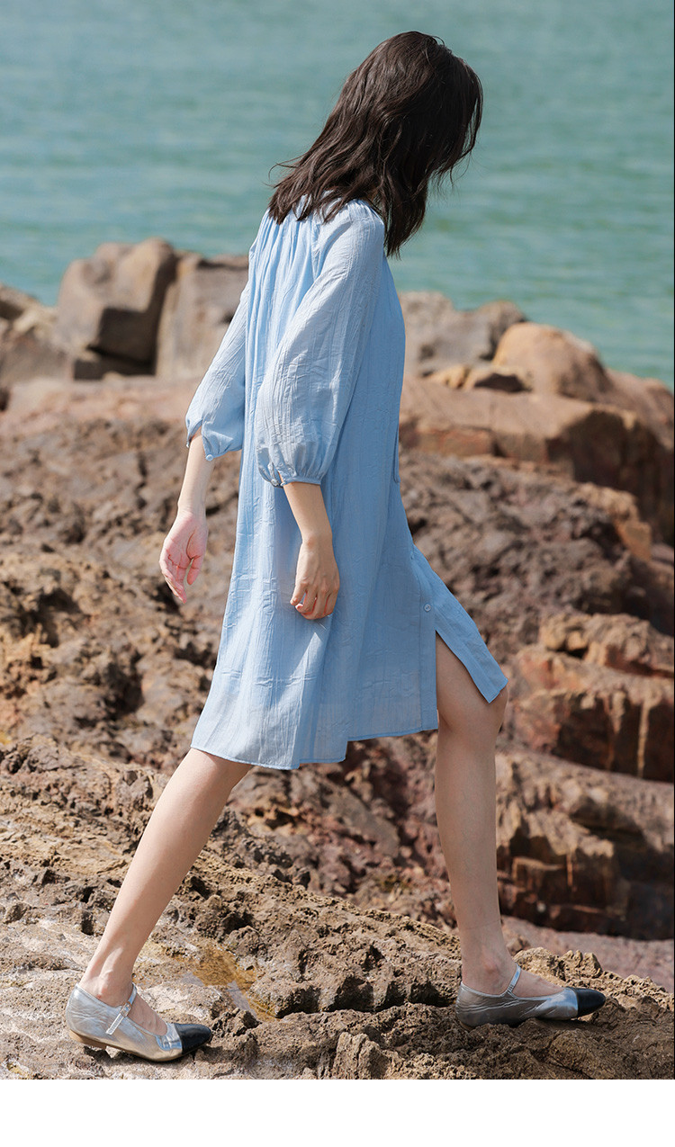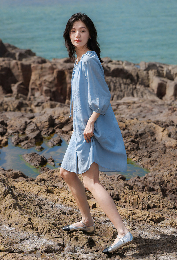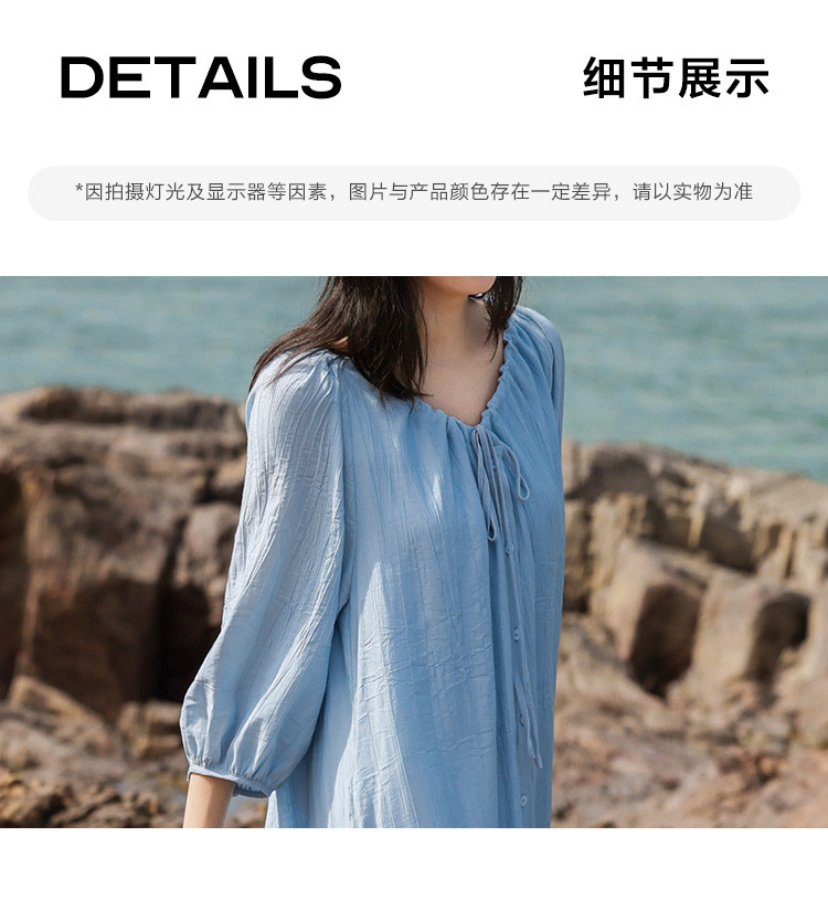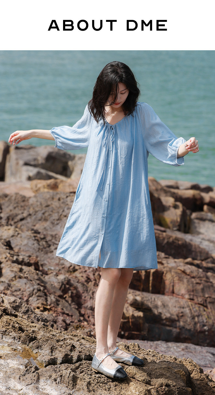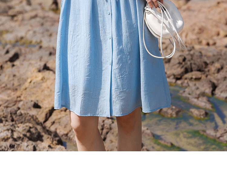 商品名称:【休闲度假风连衣裙】夏款治愈冰川蓝中袖设计露锁骨长裙 560130