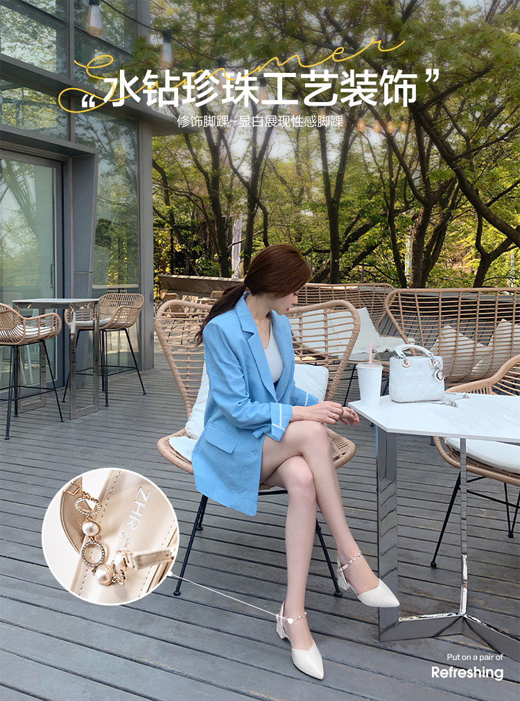 【珍珠水钻】气质尖头粗跟包头凉鞋女一字带凉鞋女士凉鞋夏季凉鞋 119424